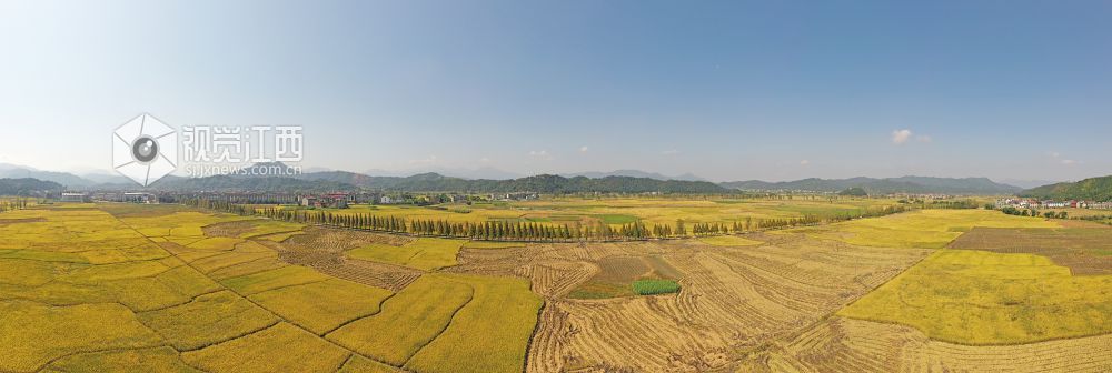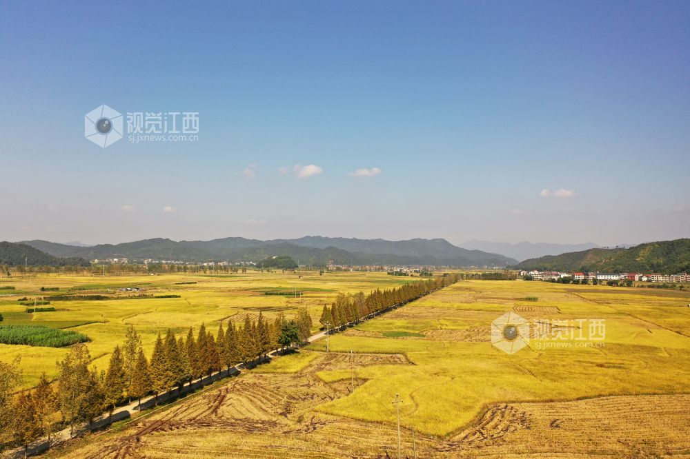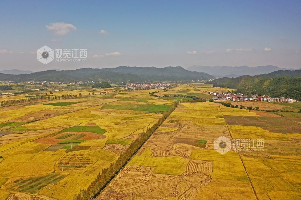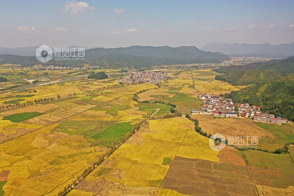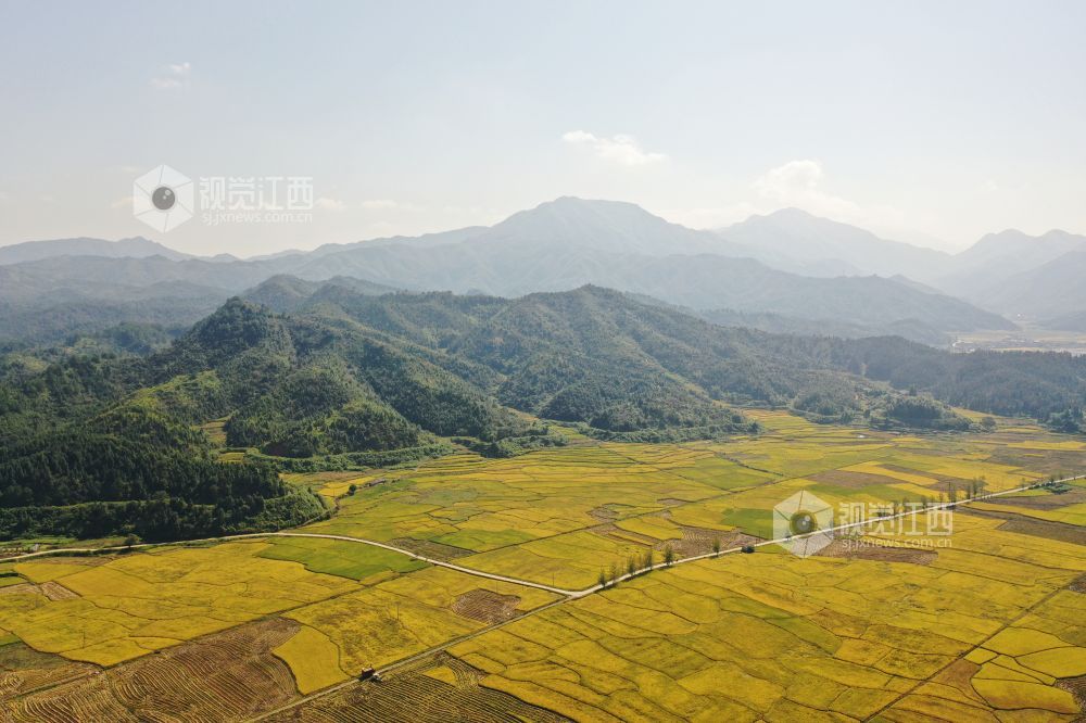 2020年10月9日,航拍江西省上饶市铅山县石塘镇稻田秋色,大地如用黄色染过一样,遍地金黄。金秋时节,铅山稻谷进入收获季,稻田一片金黄,景色宜人,一片片稻田交织成了一幅色彩明快的田园画卷。