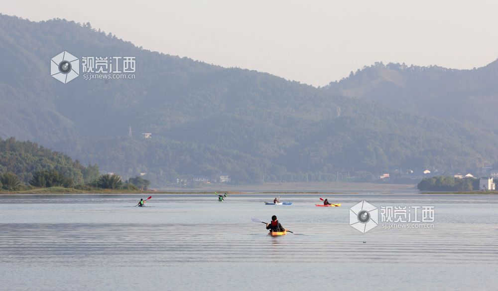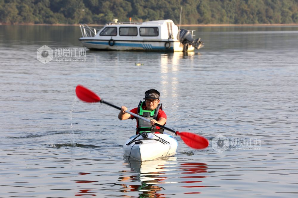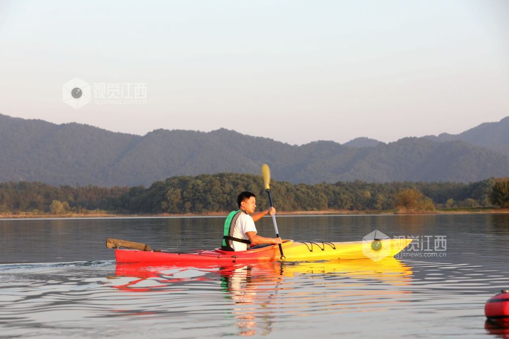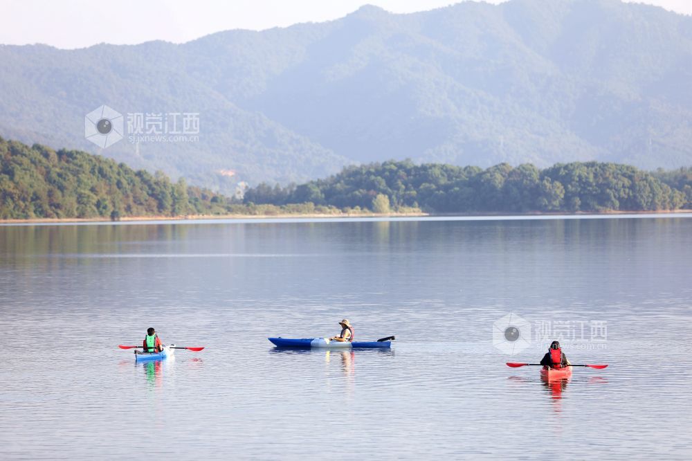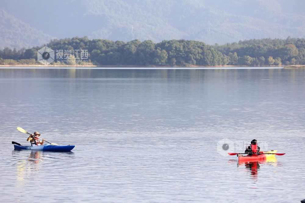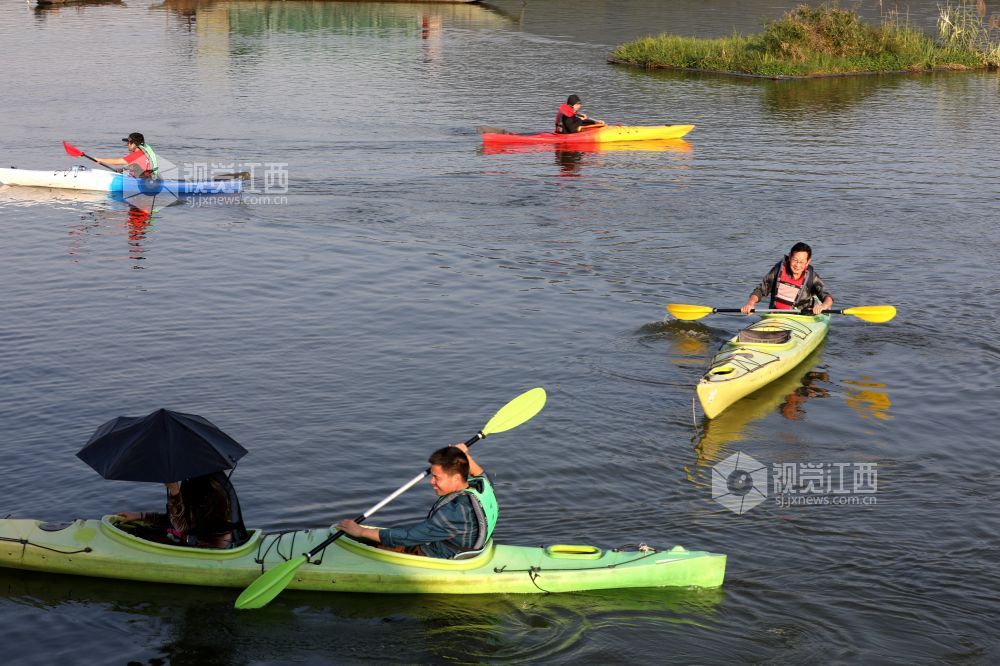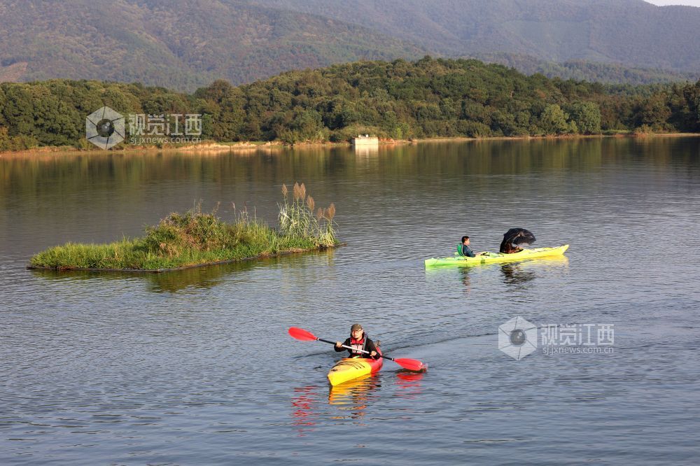 10月11日,市民在江西省分宜县钤阳湖湖面上乘着休闲皮划艇,感受家乡别样的水乡之美。今年8月,该县破浪水上基地引进静水皮划艇项目,开展假日体验游,吸引众多市民享受水上运动文化乐趣,着力推进全域旅游发展。