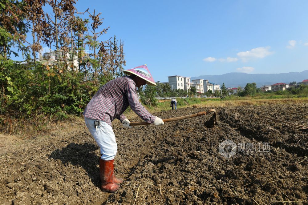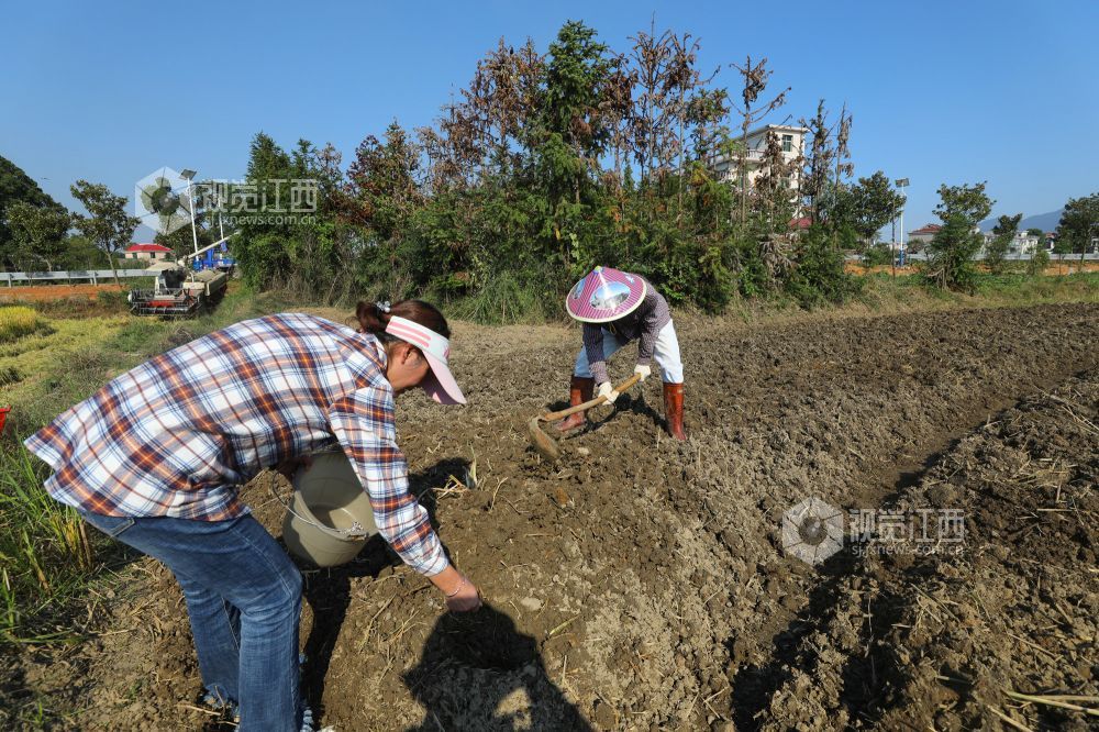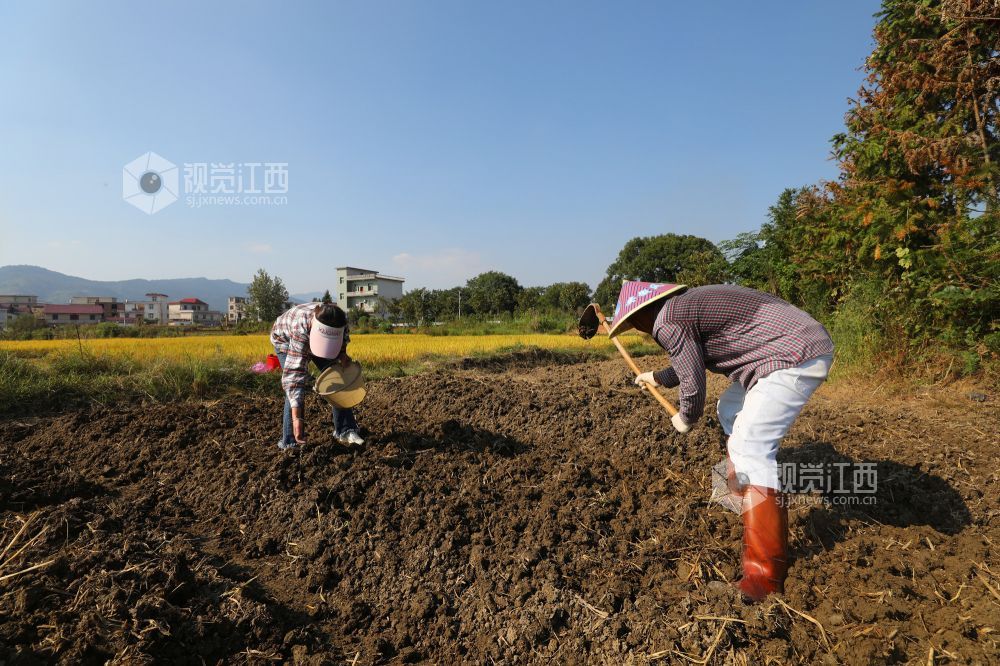 10月11日,莲花县湖上乡湖上村村民在稻田里种植油菜。秋收季节,村民抢抓晴好天气,在收割了稻谷以后,立即整好地,种植油菜。