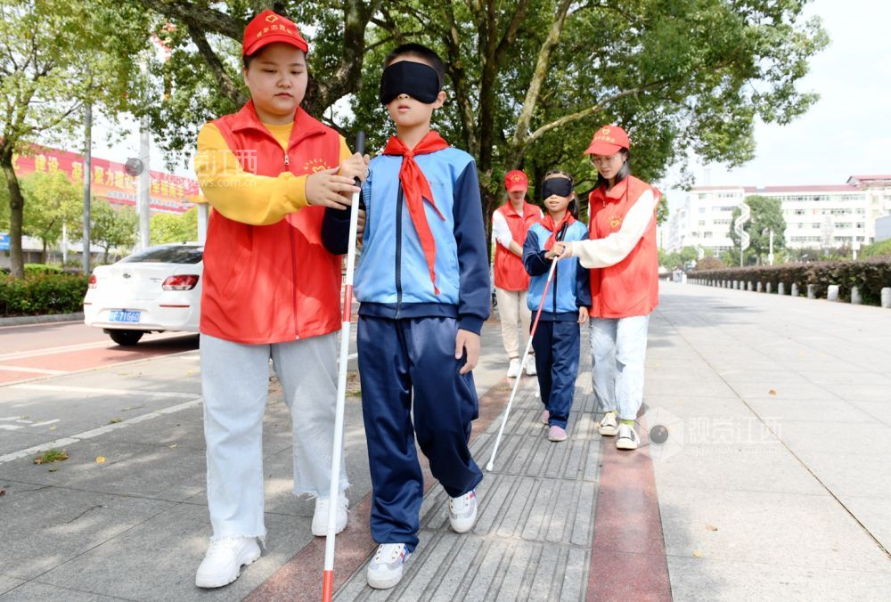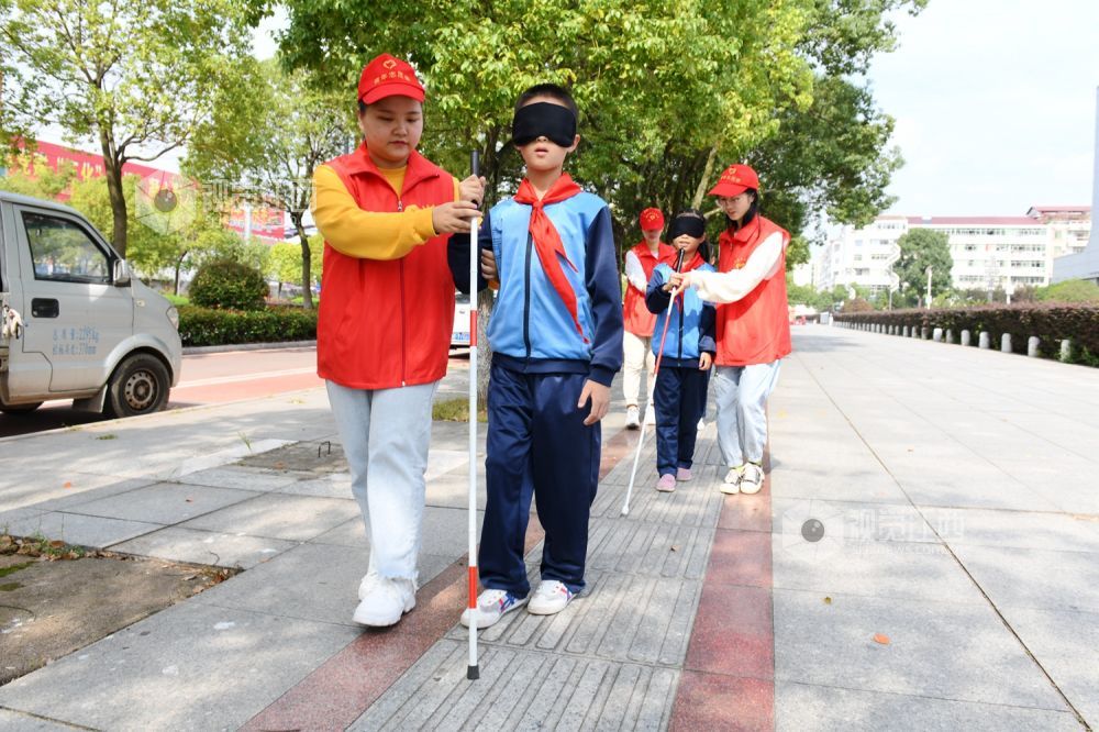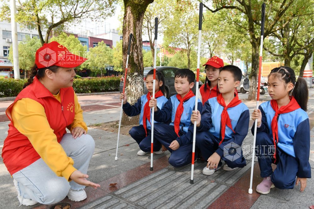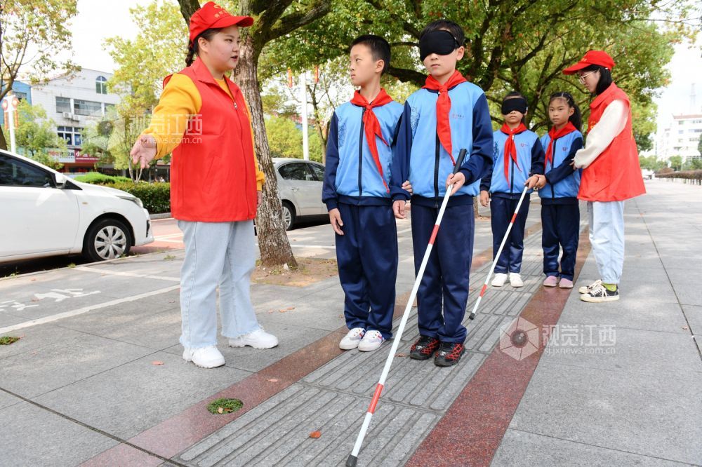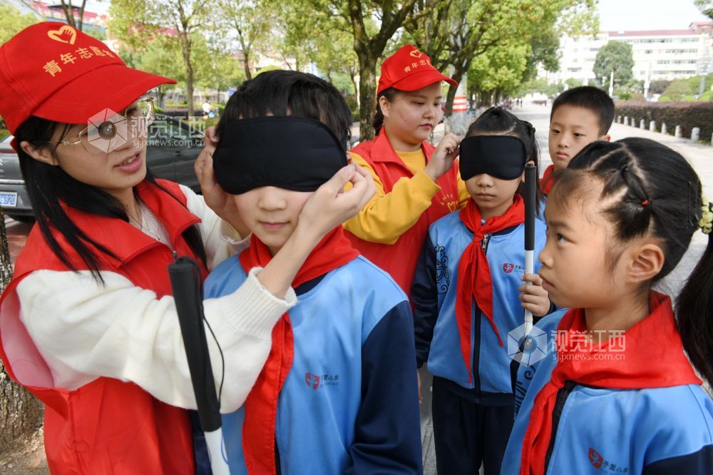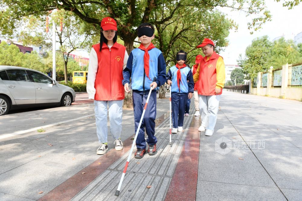 在10月15日国际盲人节来临之际,江西省抚州市南丰县青年志愿者协会联合该县子固小学开展“体验盲道 关爱盲人”主题活动。志愿者带着小学生手拄盲杖蒙眼走盲道,体验盲人行走的艰难,呼吁市民自觉让出盲道,关爱盲人。