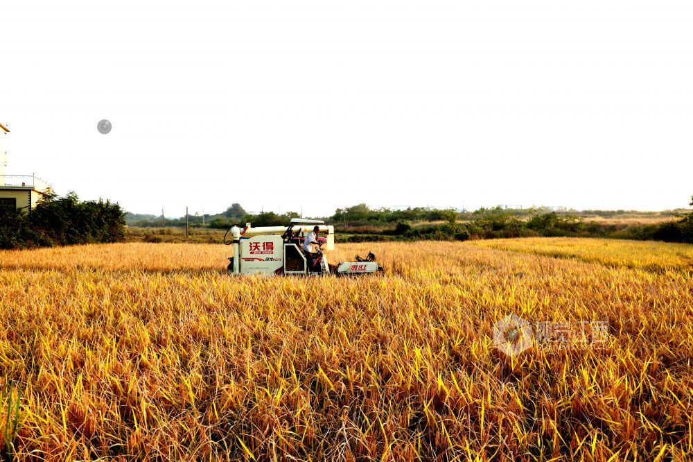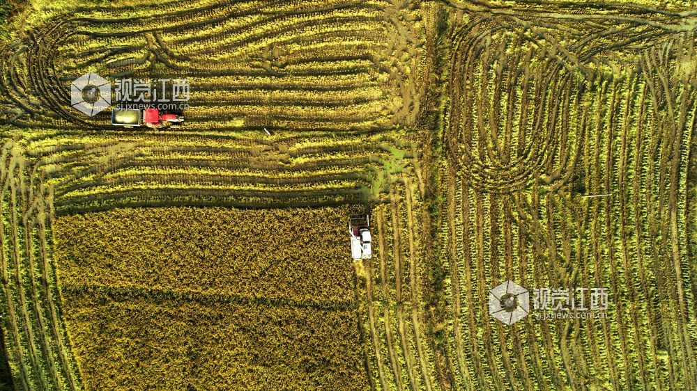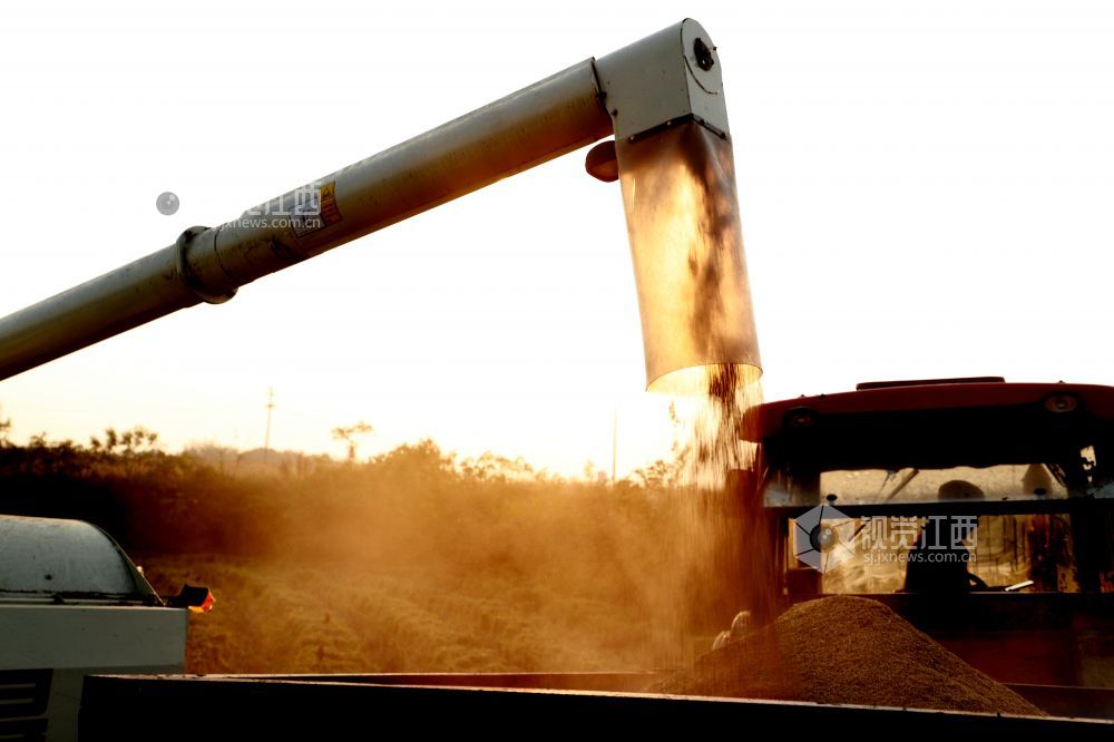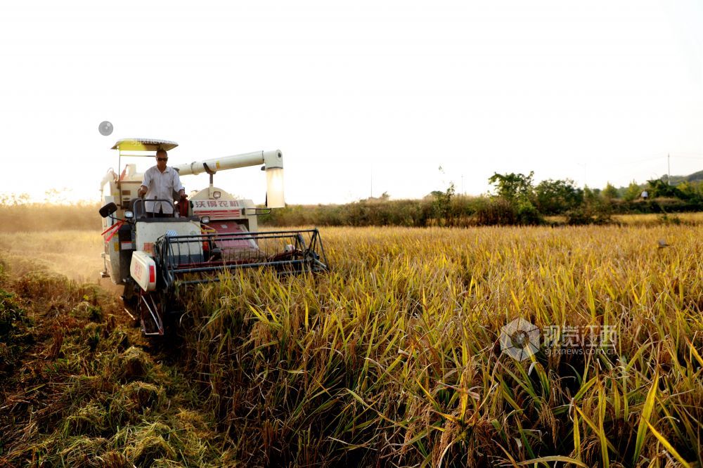 2020年10月13日,江西省九江市湖口县马影镇董埂村农户抢抓晴好天气收割中稻,田间一片繁忙景象。秋收时节,湖口县6.8万亩中稻喜获丰收,农户抓紧时机收割,确保颗粒归仓。
