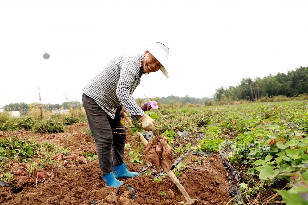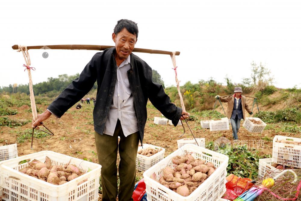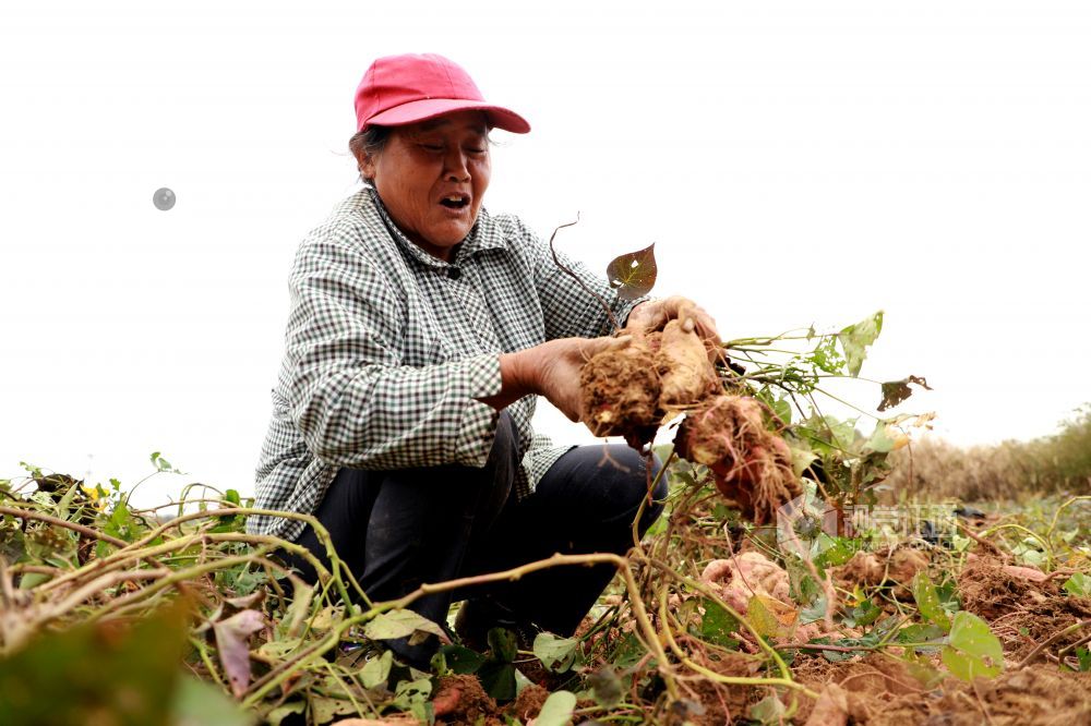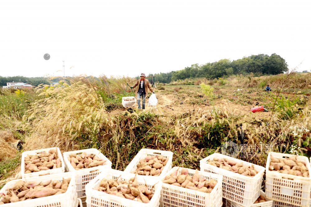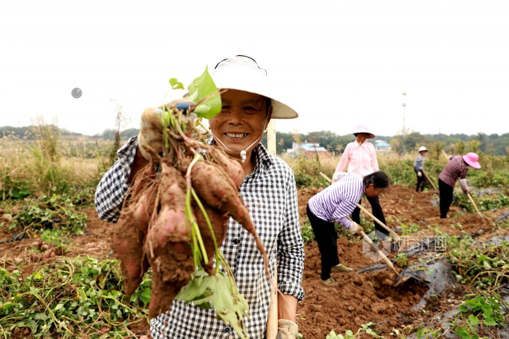 10月14日,在江西省九江市湖口县舜德乡石岭村小甘薯种植基地,村民正在采收第二茬小甘薯,田间地头一片繁忙。