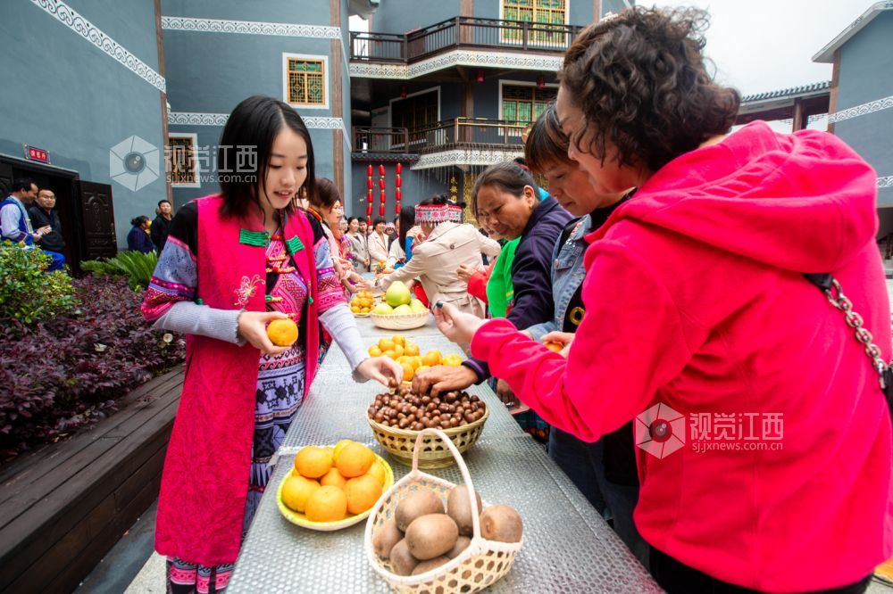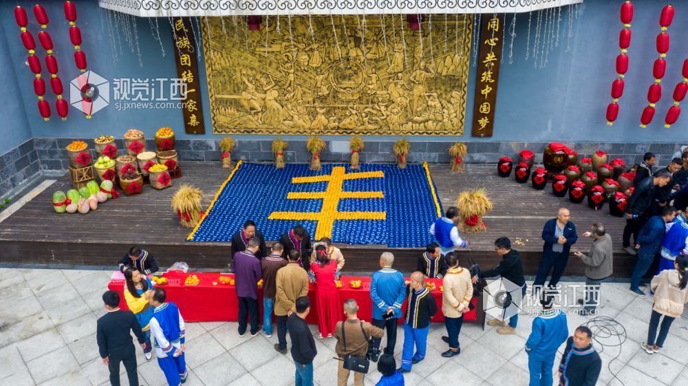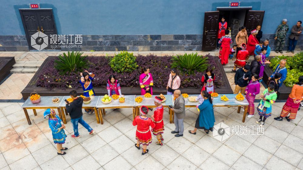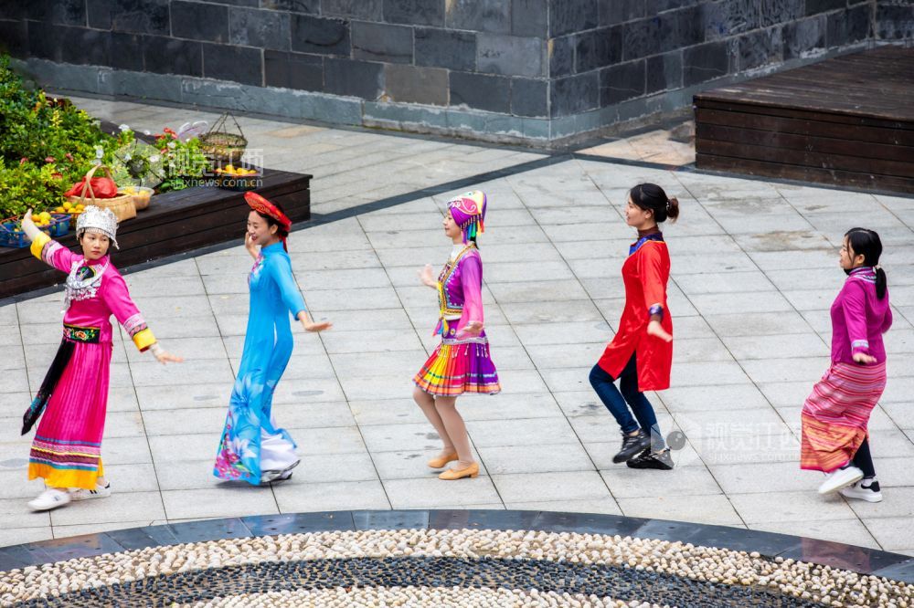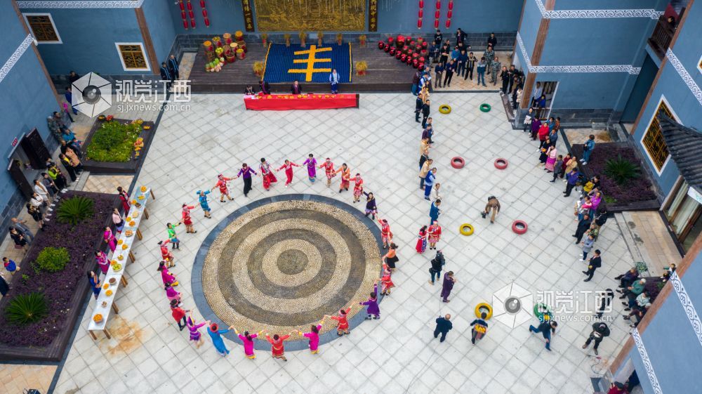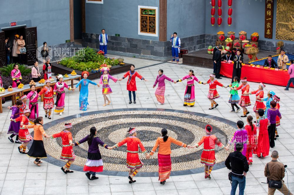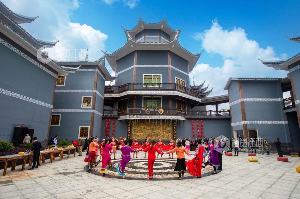 10月17日,在江西省吉安市峡江县金坪民族风情园内,由八个少数民族共同带来的节庆舞蹈正在上演。大家身穿各自民族的特色服装,在鼓楼内围成一个大圈,手拉手一起欢快的舞动。现场色彩艳丽,节庆氛围浓厚,不少游客也纷纷换上喜欢的民族服饰,一起加入到舞蹈的行列当中,和当地村民一起享受节庆的乐趣。