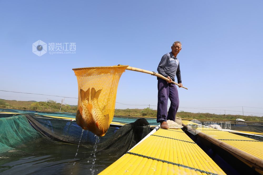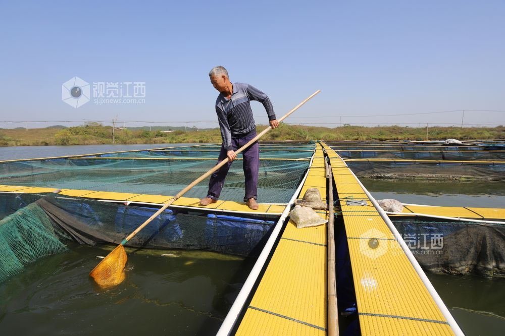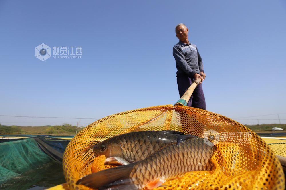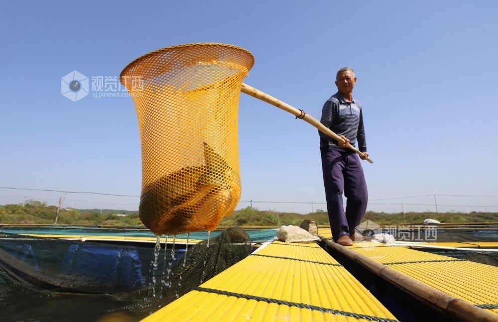 10月25日,江西省安福县一家畜牧公司员工蓝宗招在捕捞倒刺鲃。倒刺鲃,俗称军鱼。今年,该县平都镇陈坪村返乡人士采取“公司+农户”的形式创办了一家畜牧公司,开发本村100余亩荒废20余年的水面从事家禽、鱼类养殖,并吸纳当地12名农民成为公司员工,既使荒水得到有效利用,又给农民提供了就业岗位。目前,这家公司网箱养殖的3万尾倒刺鲃长势良好。