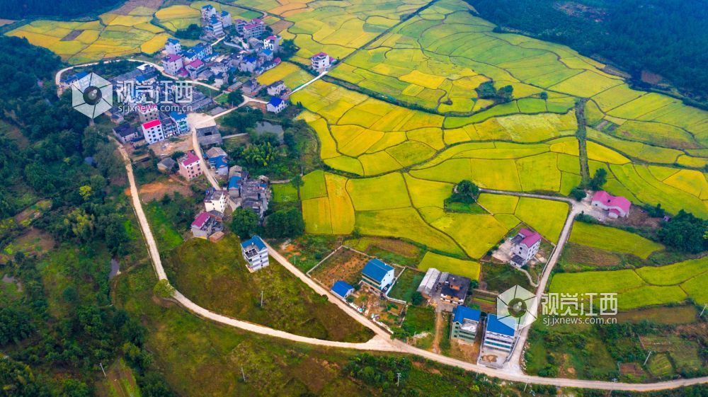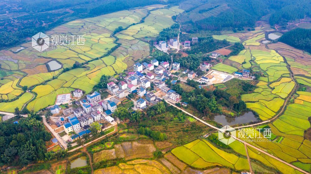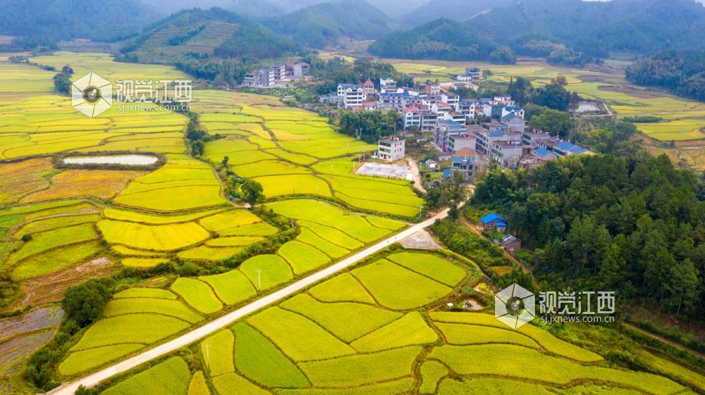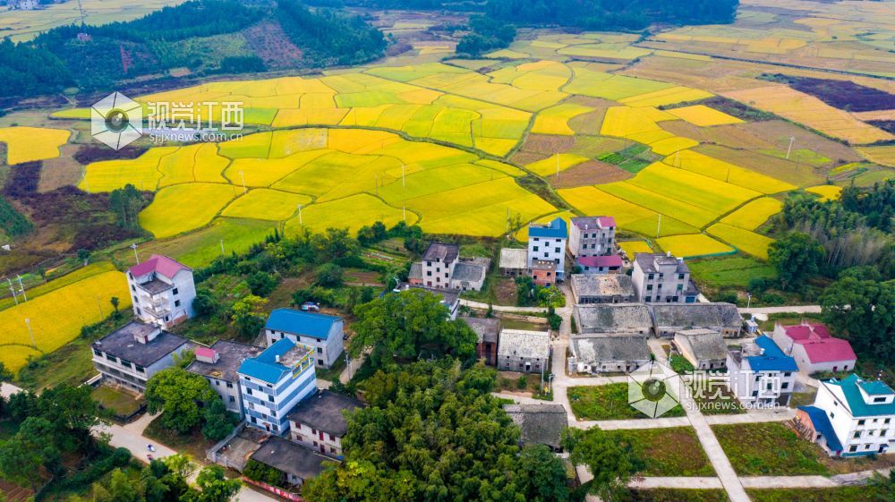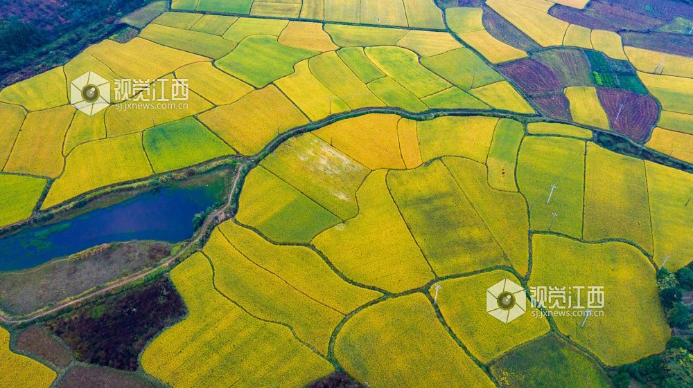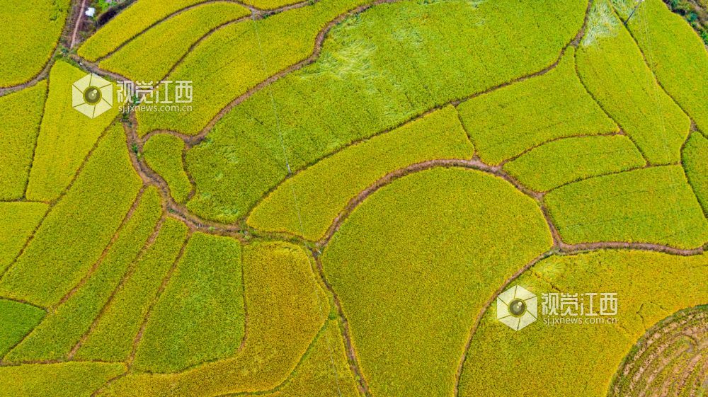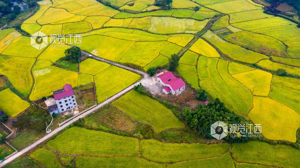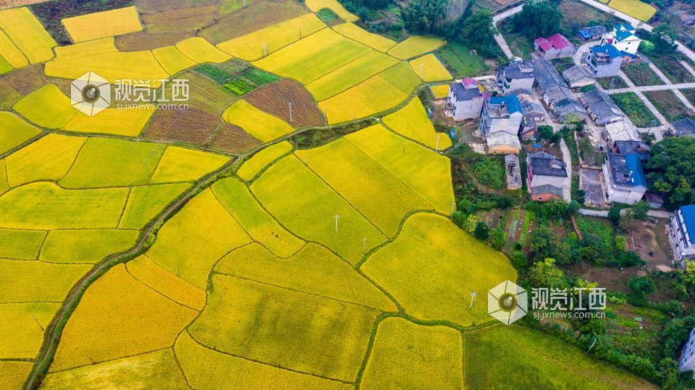 俯瞰江西峡江: 稻田一片金黄犹如天然“调色板”