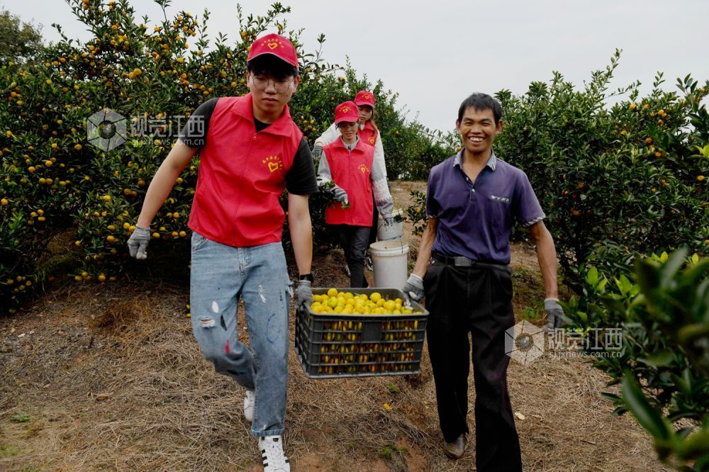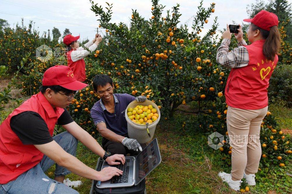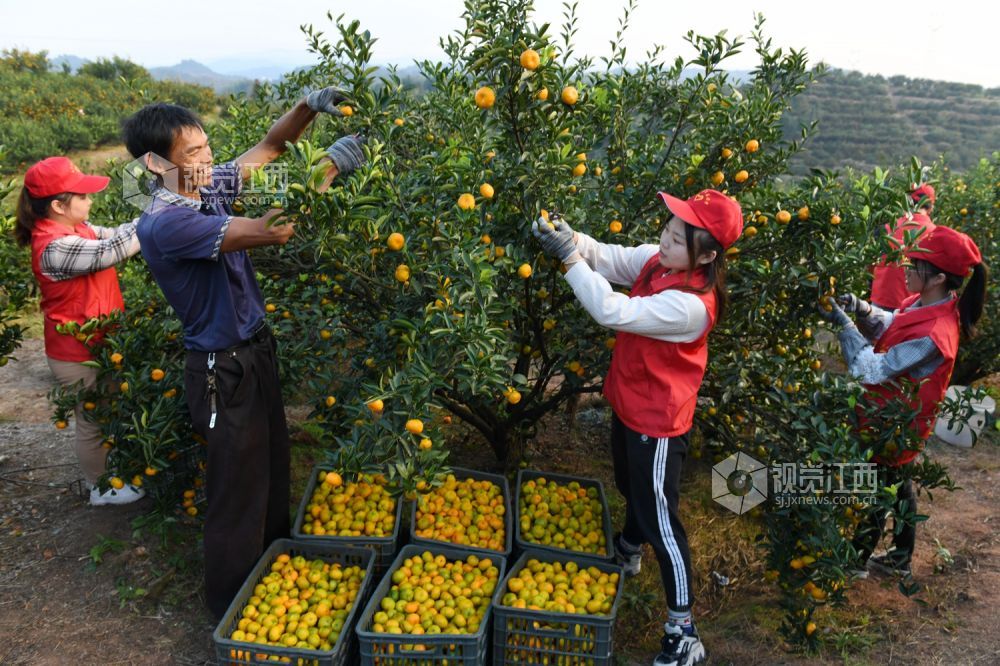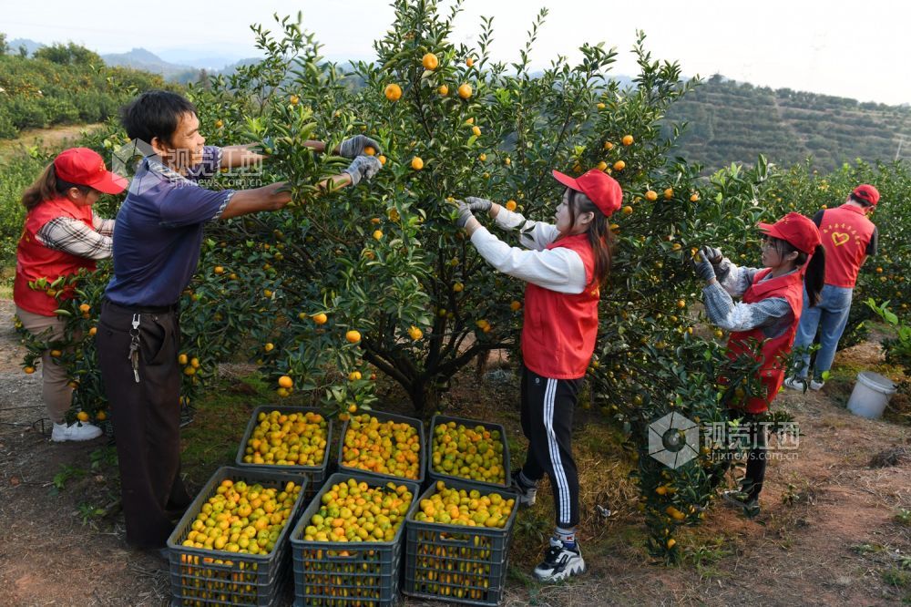 2020年10月26日,在江西省抚州市南丰县白舍镇茶亭村橘园内,党员志愿者在为缺少劳动力的贫困橘农曾老平采摘南丰蜜橘。江西省抚州市南丰县结合“不忘初心、牢记使命”主题教育,组织党员志愿者组成“义工服务队”,帮助贫困橘农采摘南丰蜜橘,并通过淘宝、微信等平台,为贫困橘农发布销售信息,拓宽销售渠道,增加收入。