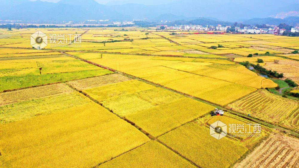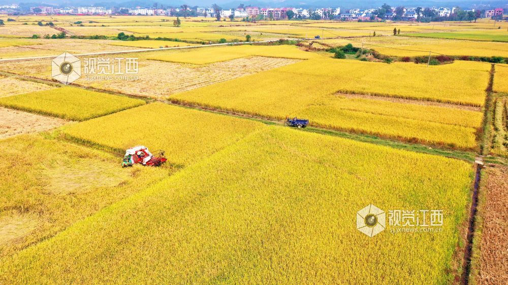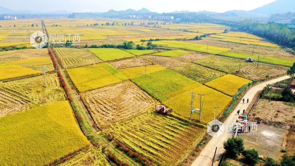 2020年10月28日,江西省吉水县文峰镇井头村,村民正抢抓晴好天气收割晚稻。空中俯瞰,金黄稻田和秀美村庄构成一幅幅美丽的丰收画面。