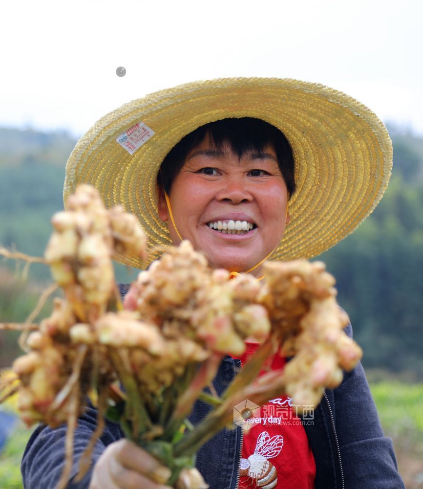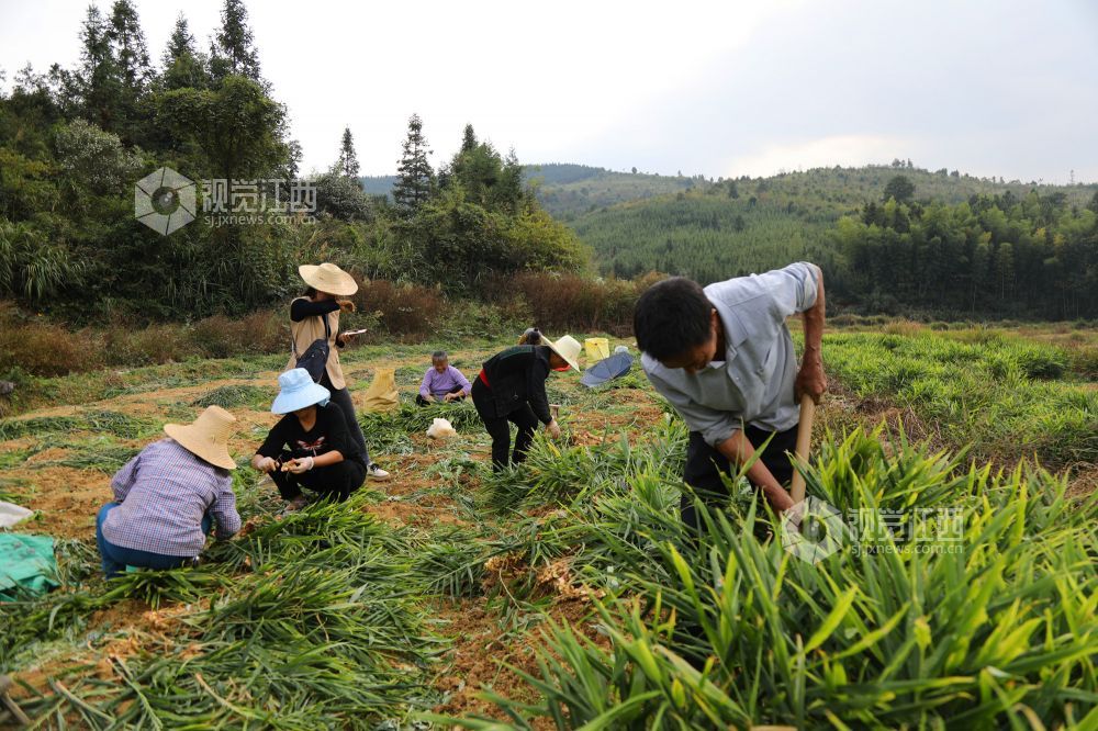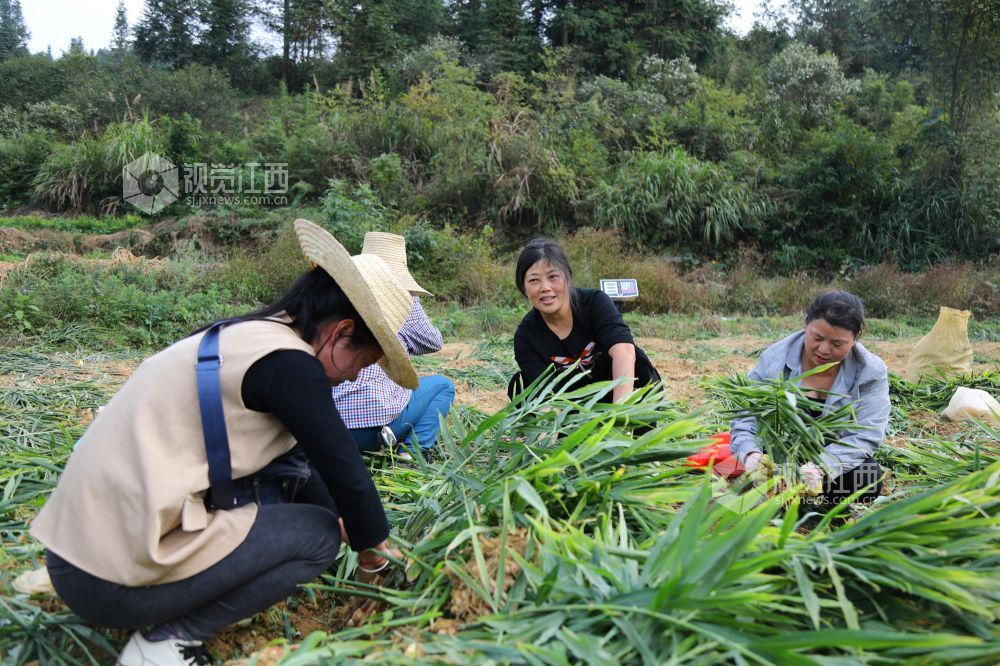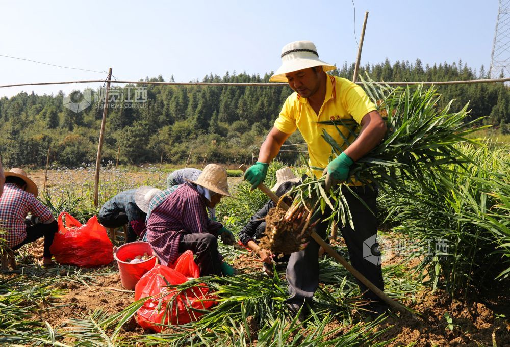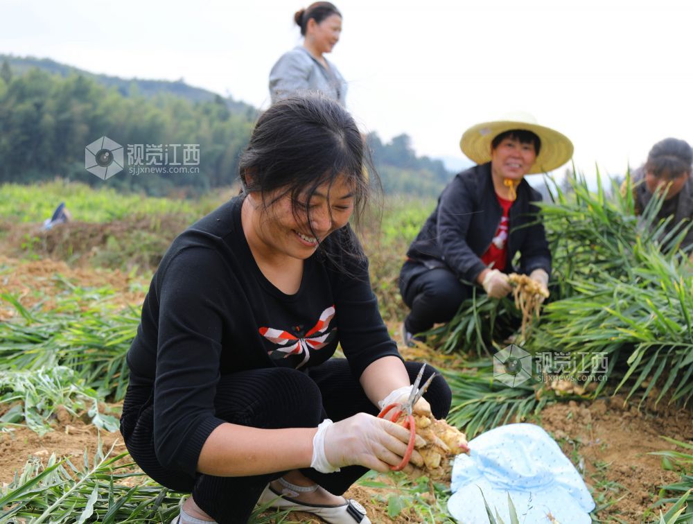 10月28日,江西省莲花县闪石乡洞背村村民在村扶贫基地采收生姜。该扶贫基地种植的30亩生姜喜获丰收,每亩产量达6000多斤,50多个贫困户和村民通过务工与入股人均增收1000多元。