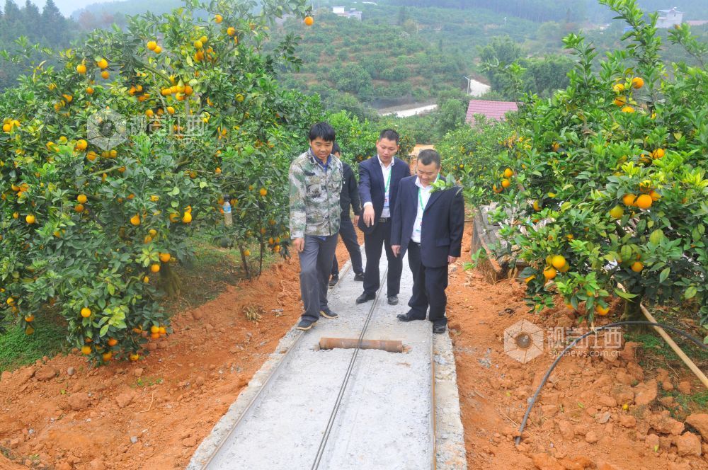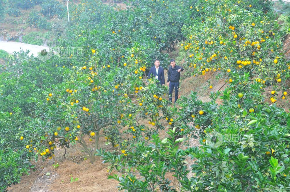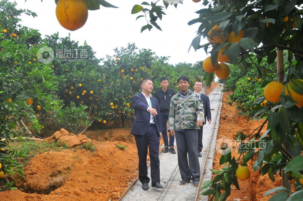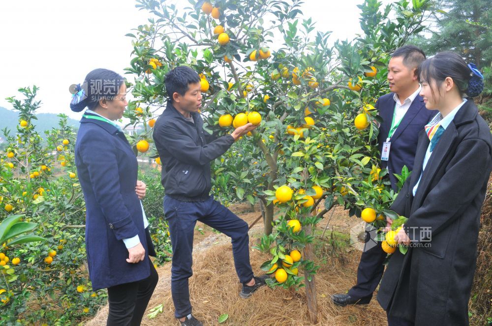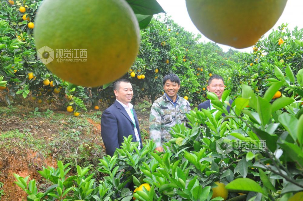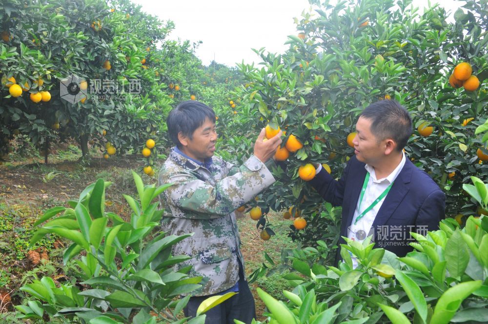 11月3日,在江西省赣州市全南县南迳镇三峡移民新村,全南县农商行的客户经理和物流、电商的同志正在脐橙种植户蔡祖富的基地里察看脐橙生长情况,看着长势喜人的脐橙贫困户蔡祖富高兴地笑了。