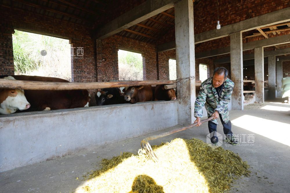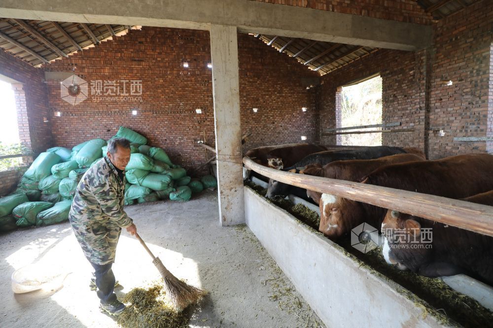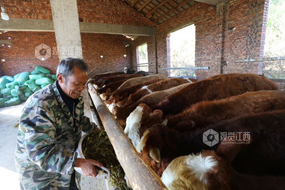 11月10日,在江西省莲花县良坊镇梅州村“扶贫牛”集中喂养牛舍,村干部颜自元正在给18头肉牛喂草料。该村以“专业合作社+贫困户”的模式,鼓励村里的12户贫困户申请小额贷款购买架子牛统一寄养在合作社,去年村里集中寄养了25头肉牛,每户贫困户从中获得分红近2000元。今年该村已经建好栏舍将再购买30多头肉牛进行喂养。