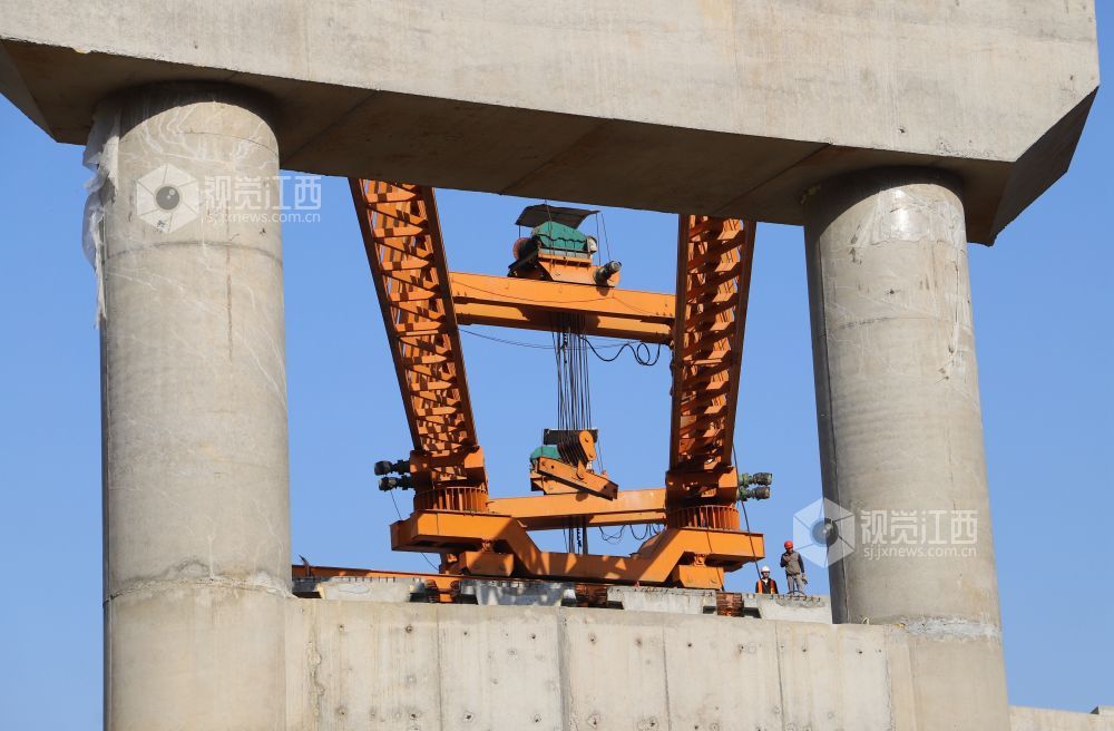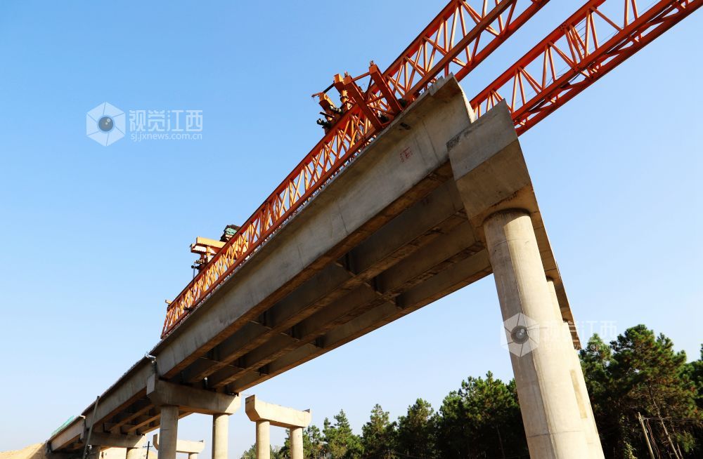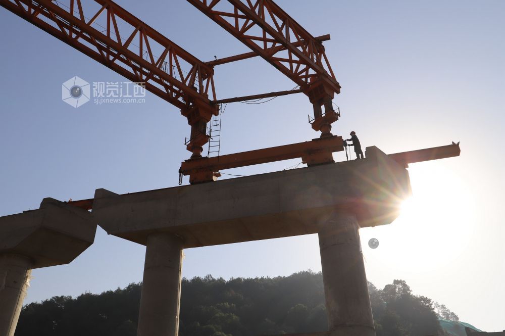 11月13日,江西省安福县旅游快速通道跨分文铁路大桥在进行箱梁架设施工。该大桥长249.16米,宽25.5米,是安福县旅游快速通道最长大桥,大桥竣工后,该通道将全线贯通。