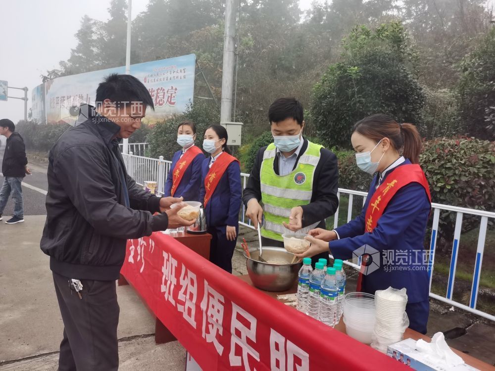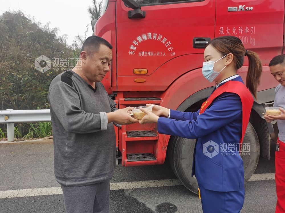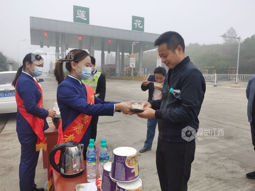 11月18日,受大雾天气影响,吉莲高速莲花收费所莲花收费站入口交通管制,不少乘客滞留在收费广场。得知滞留的司乘人员未吃早餐,一大早,“龚全珍班组”志愿者在莲花站收费广场设立便民服务台,为滞留的司乘朋友送去了面条、热水、充电器、行车指南等应急食品、物品,周到热情的服务得到了司乘人员的一致好评。与此同时,“龚全珍班组”志愿者还推荐司乘关注高速公路微博及微信公众号,及时了解路况信息,避免在恶劣天气出门受阻。