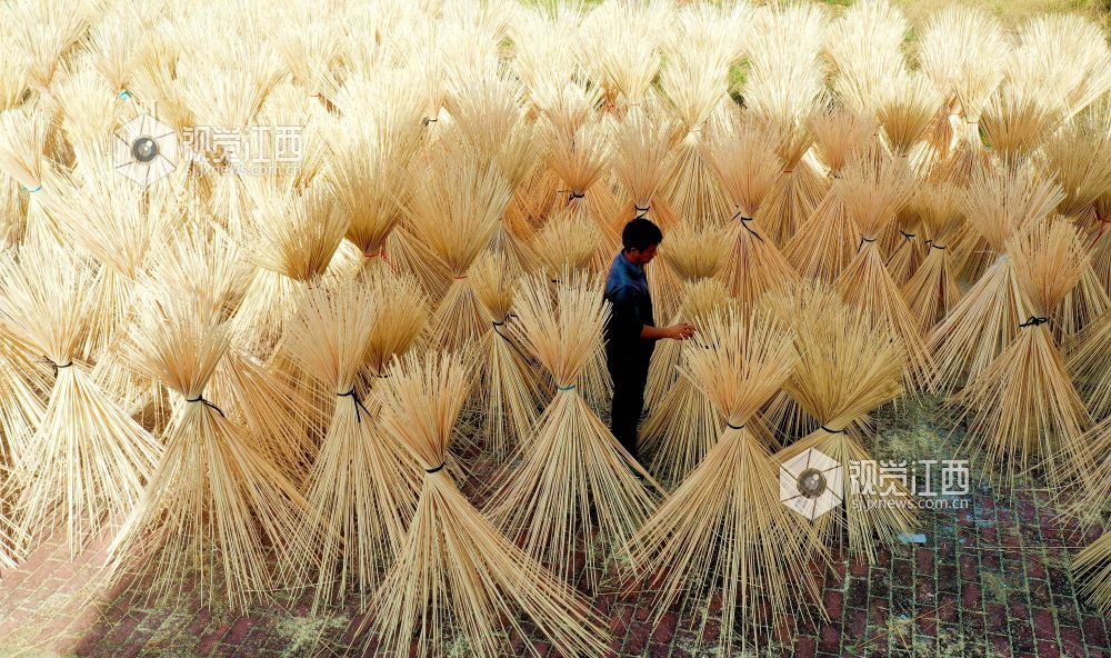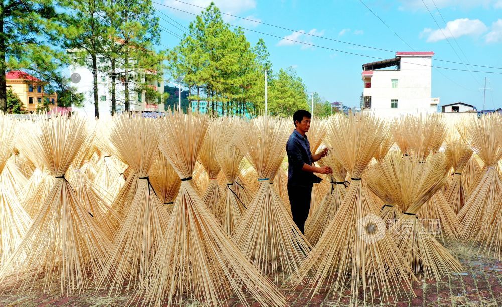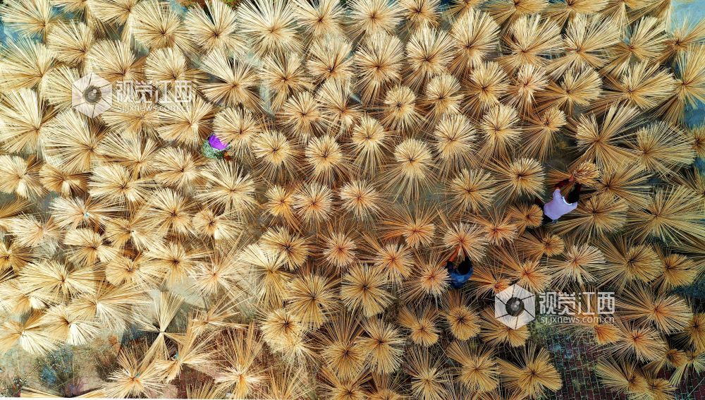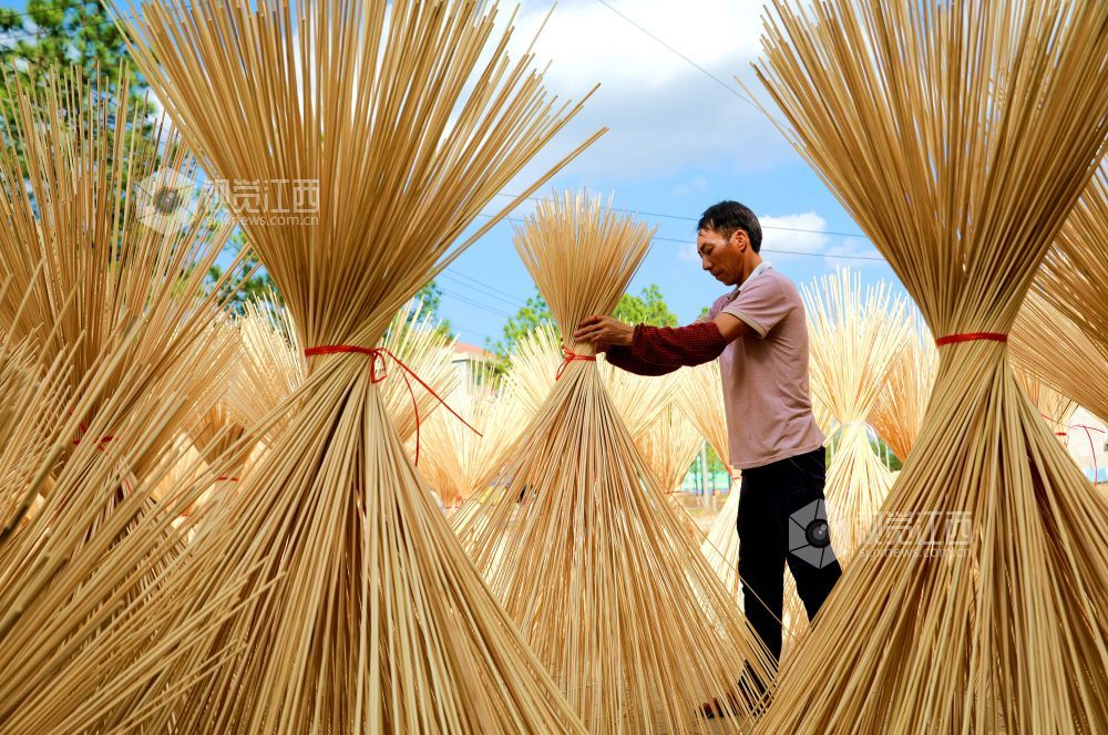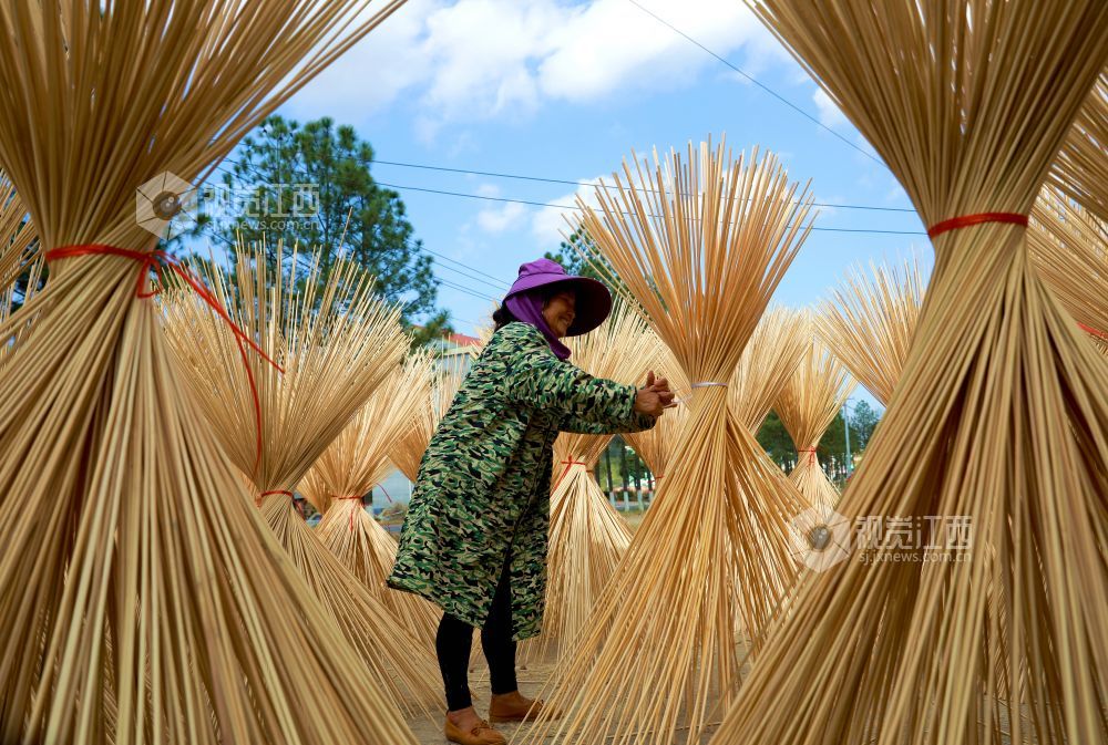 2020年11月18日,江西省吉安市吉水县文峰镇葛山村村民正在晾晒加工好的竹丝。吉水县文峰镇葛山村有着丰富的竹林资源,当地政府积极引导村民采取“合作社+农户”模式进行竹制品深加工,改变以往单纯卖竹子的简单模式,提高竹子附加值,促农增收。
