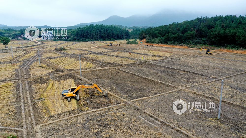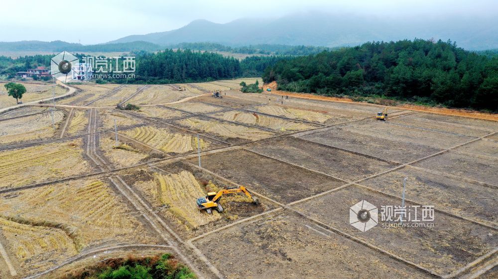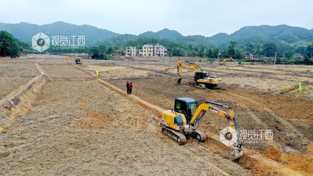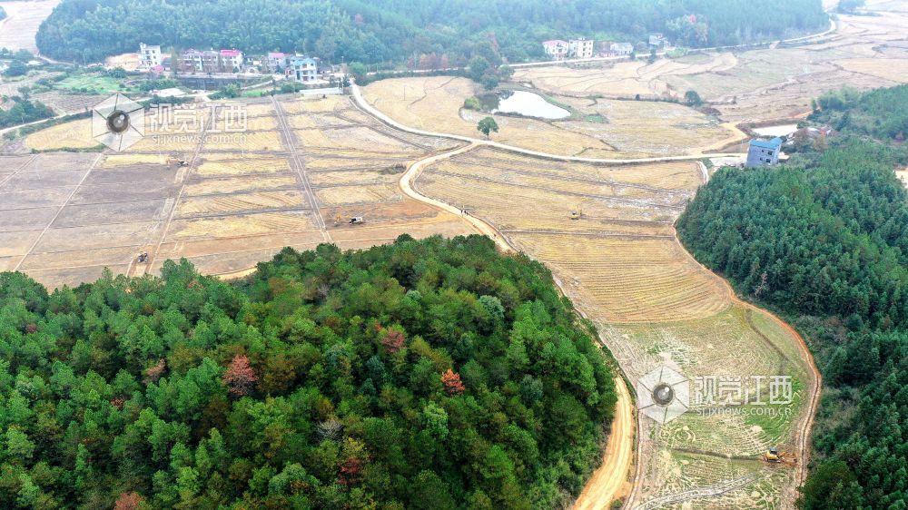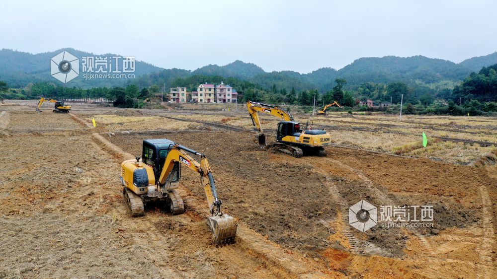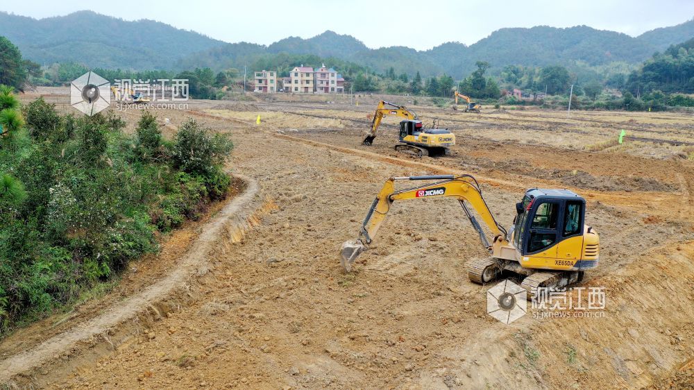 2020年11月25日,江西省吉安市吉水县乌江镇大勇村高标准农田建设现场一派火热景象,各种机械正在紧张施工作业建设高标准农田。