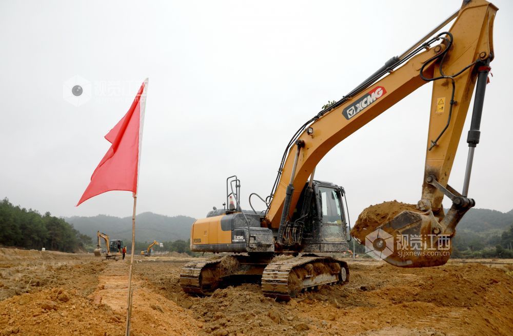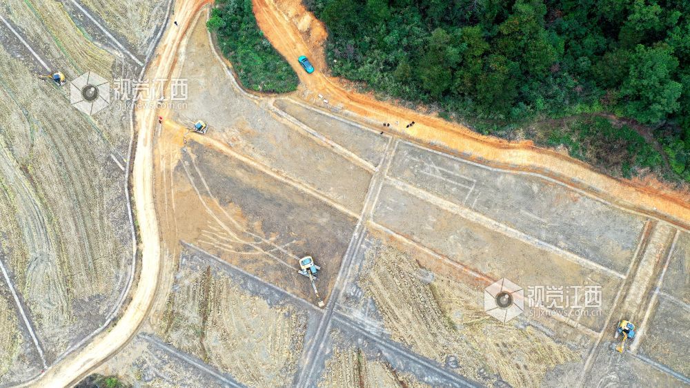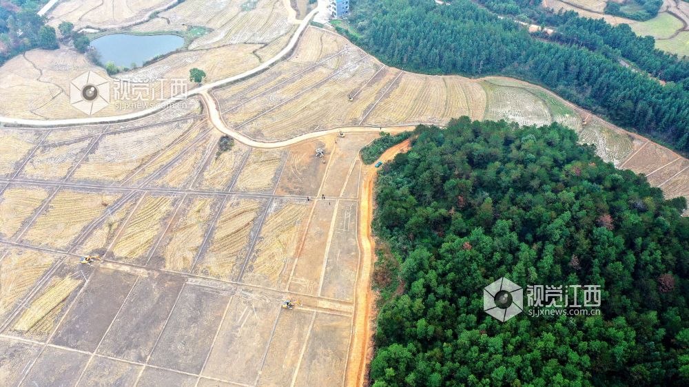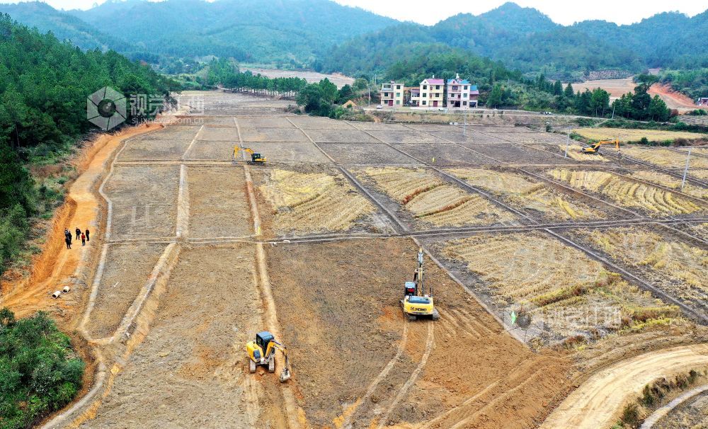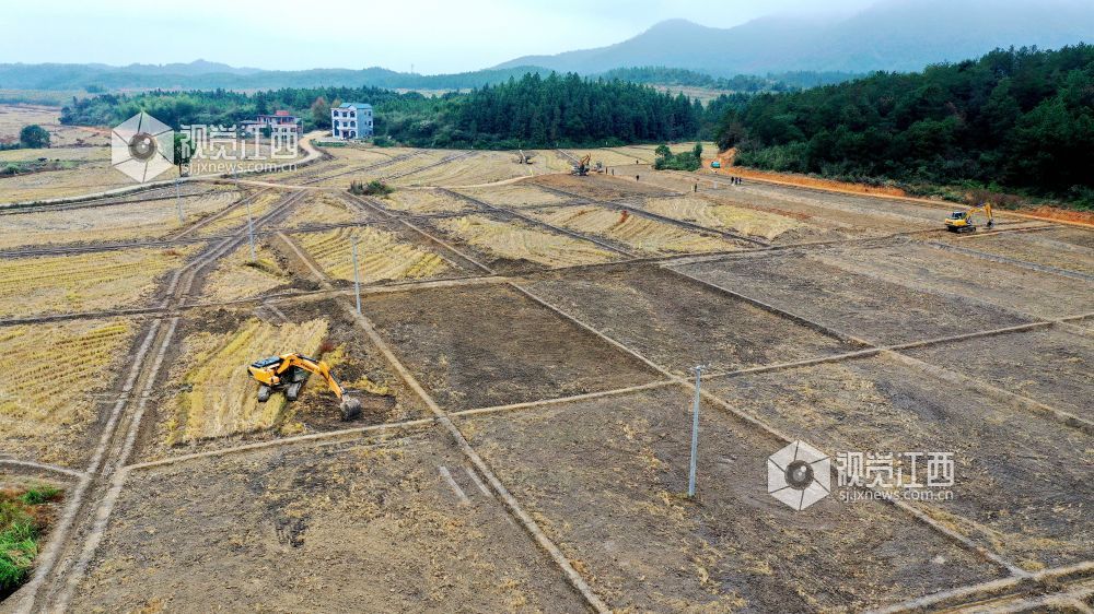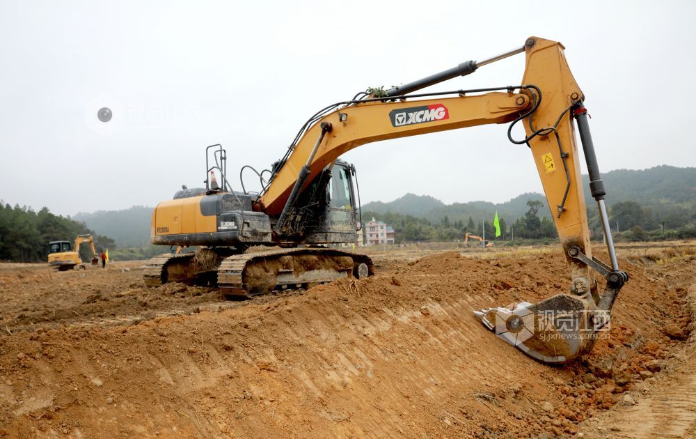 2020年11月25日,江西省吉安市吉水县乌江镇大勇村高标准农田建设现场一派火热景象,各种机械正在紧张施工作业建设高标准农田。