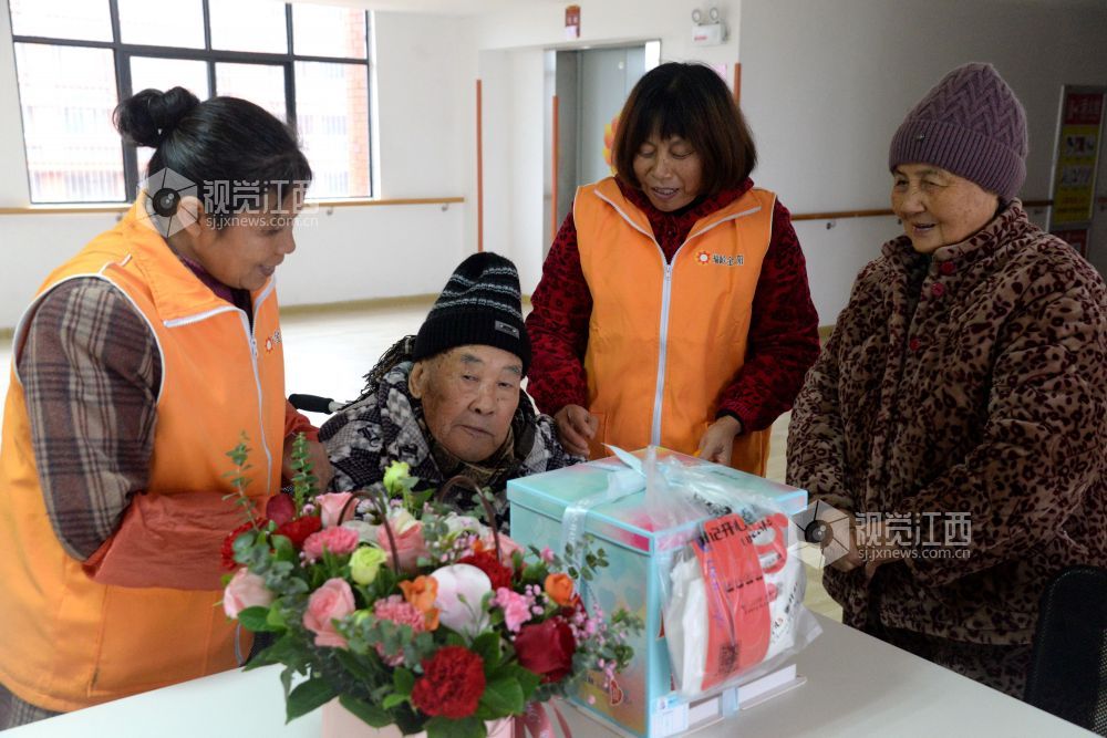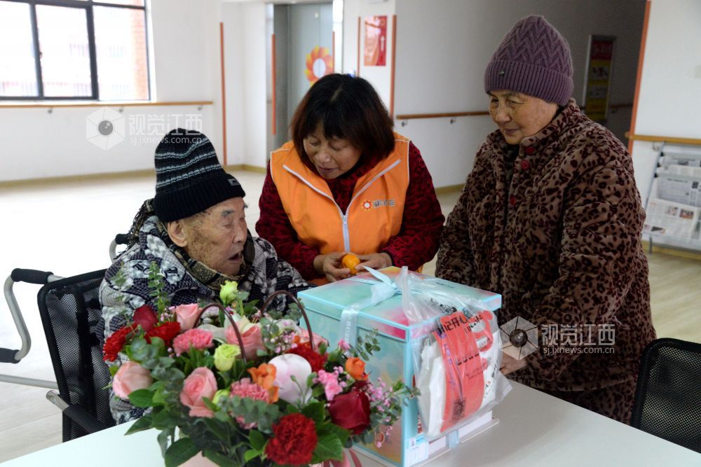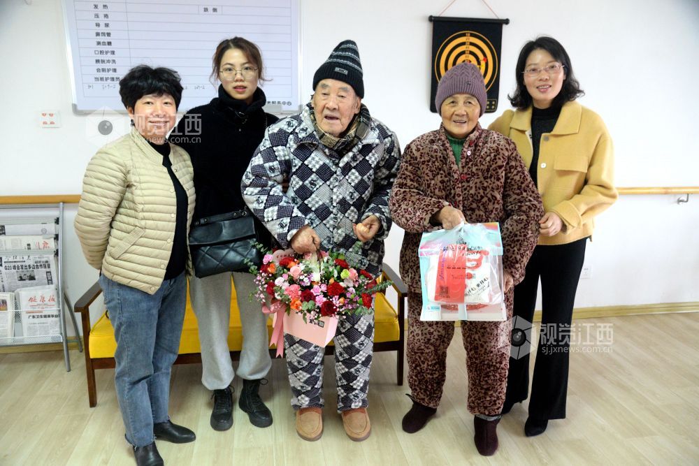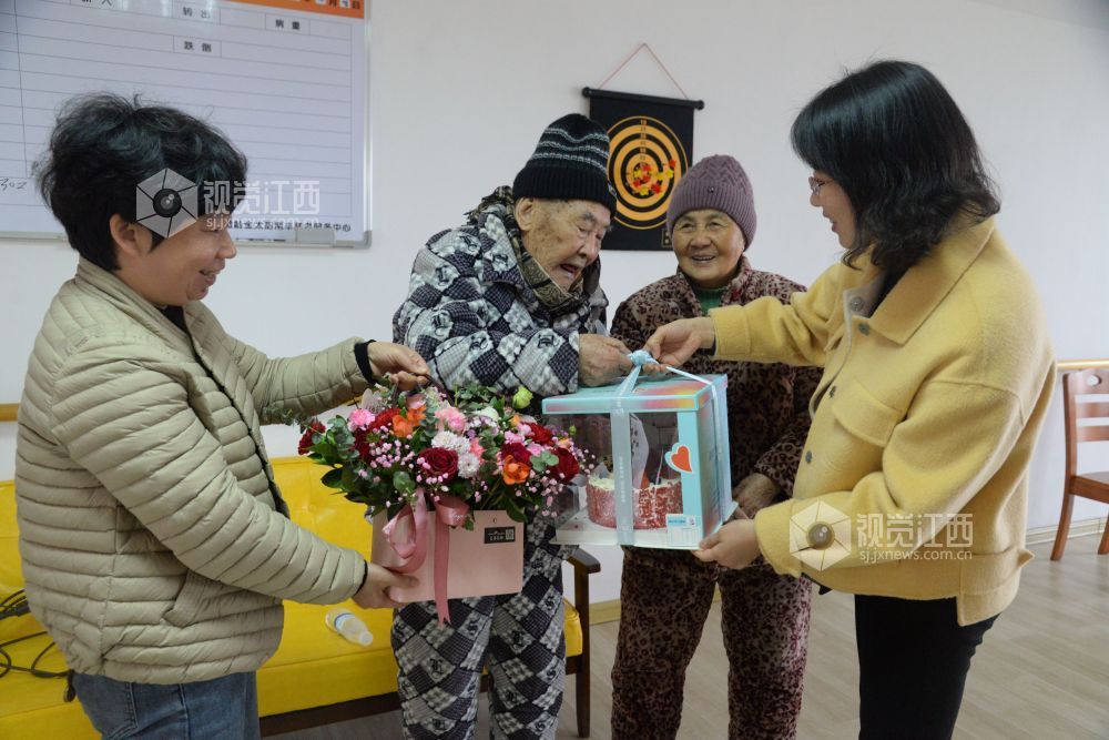 2020年12月8日,江西省抚州市南丰县委老干部局工作人员来到县养老服务中心,看望94周岁的离休干部白宗良,为他送上鲜花、蛋糕及祝福。
