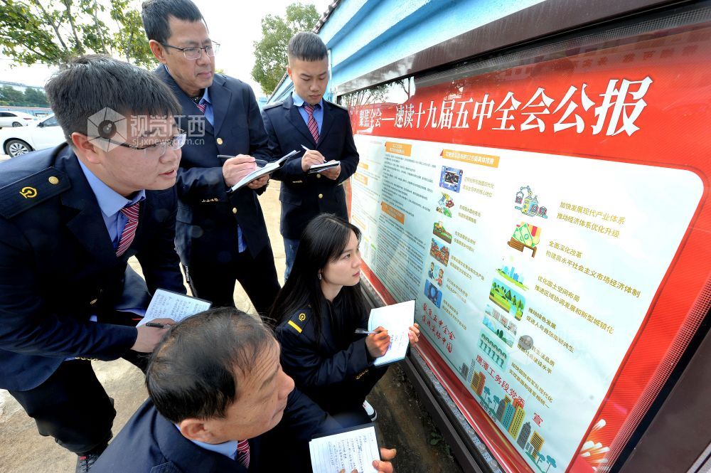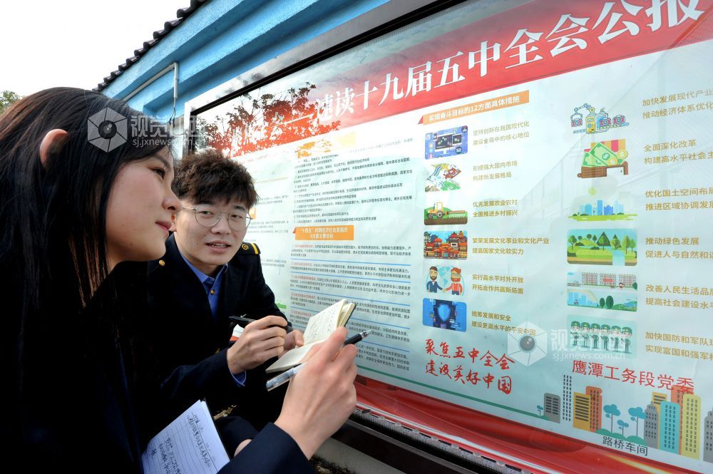 2020年12月19日,中国铁路南昌局集团公司鹰潭工务段职工正在该段基层车间党员活动室学习了解党建知识。据了解,党的十九届五中全会以来,中国铁路南昌局集团公司鹰潭工务段结合自身实际,党员带头,利用废旧钢轨和废弃铁路物品,焊接制作具有党建元素文化的雕塑、凉亭、路灯和铁路线上特殊“景观”等,从而打造出集党建知识、典型人物、事例展示为一体的主题文化广场。同时,工务段还经常组织党员和入党积极分子来到党建主题文化广场学习观摩,让他们从中接受教育,增长知识,深受广大职工群众的欢迎。