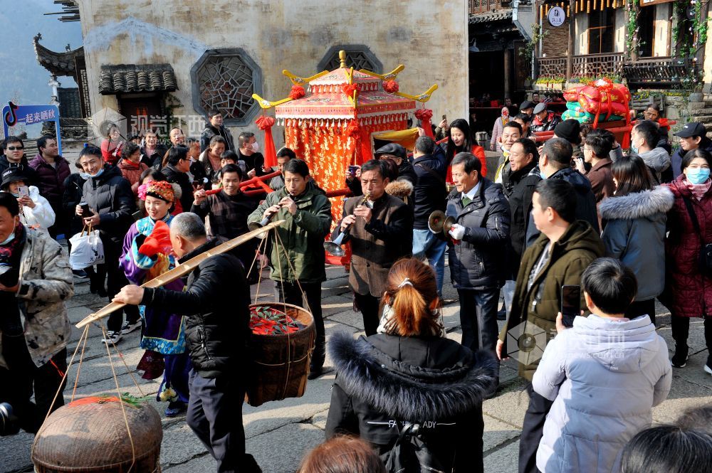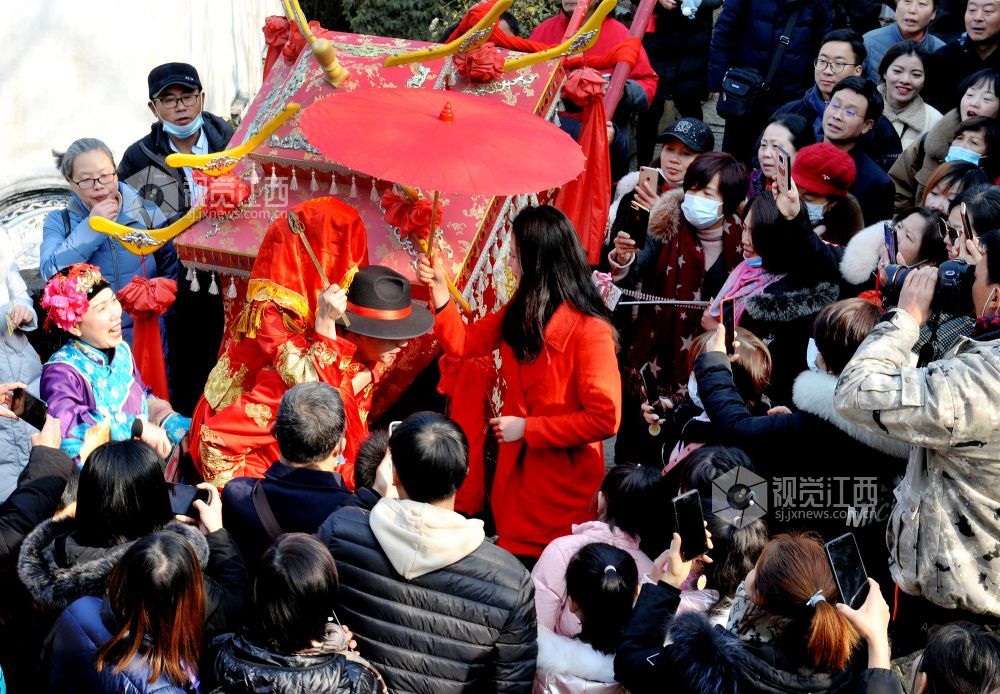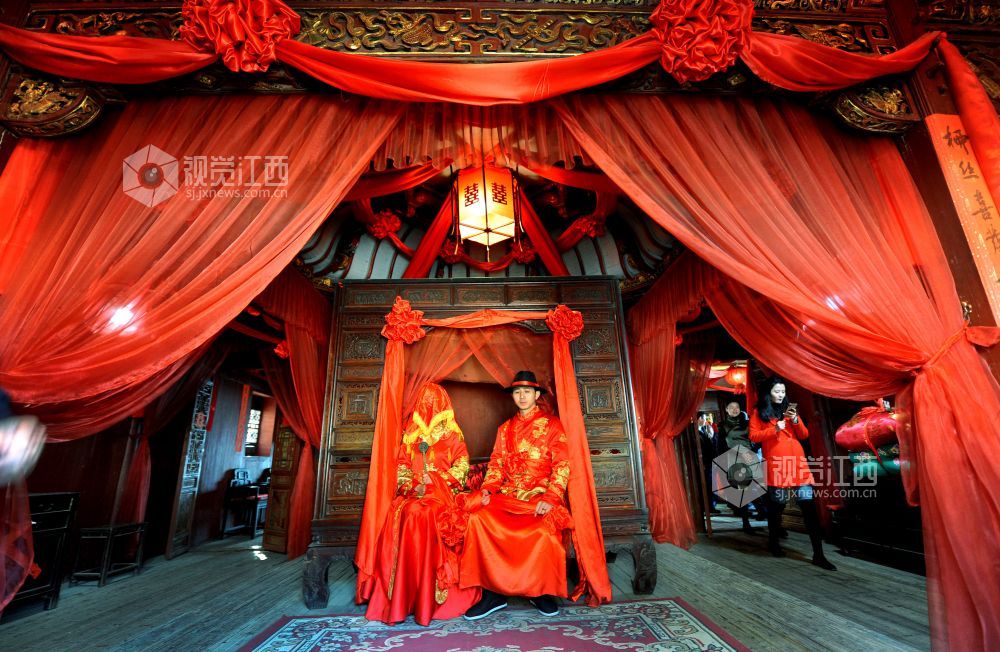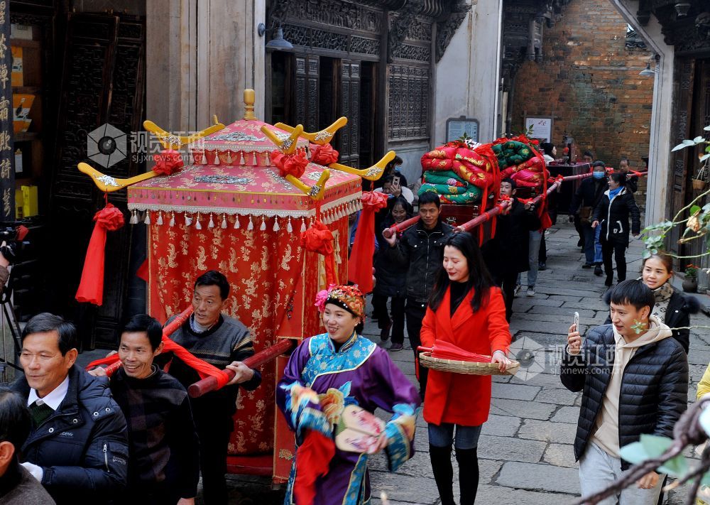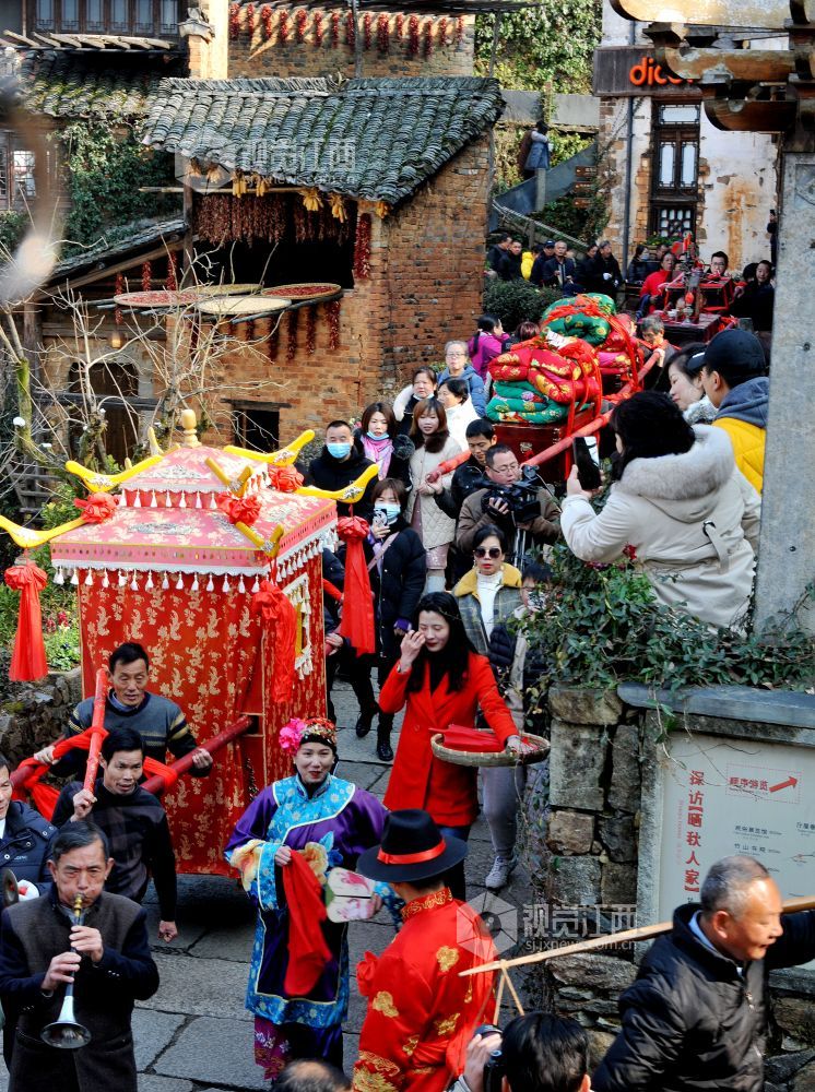 为了给游客提供丰富的游览体验,江西省婺源县篁岭古村举行了一场传统嫁娶婚俗,让游客全程体验古徽州婚俗的魅力。在现场,接亲队伍按照传统的徽州婚俗,抬着花轿、吹着唢呐、运嫁妆,一路上欢欢喜喜地将新娘的花轿抬往新郎家,同时,接亲队伍不时向游客抛喜糖,现场喜气洋洋,热闹非凡。婚房中拜天地、拜高堂、掀盖头、撒粿籽等环节,真实再现了古徽州传统婚俗,吸引了不少游客的围观。