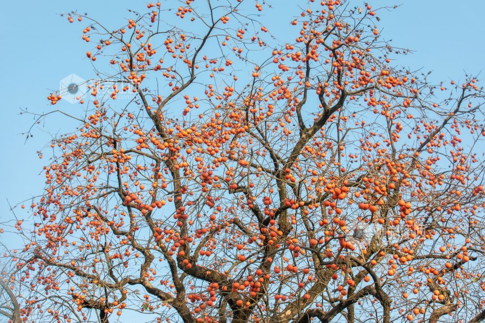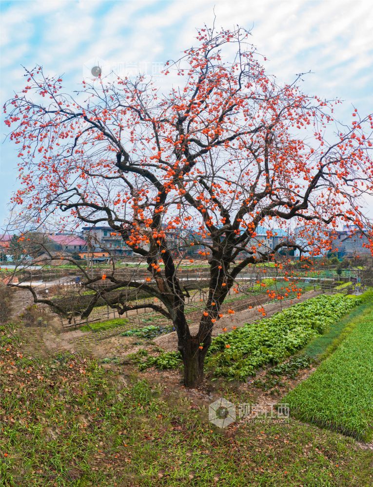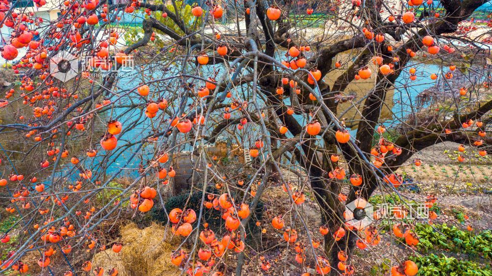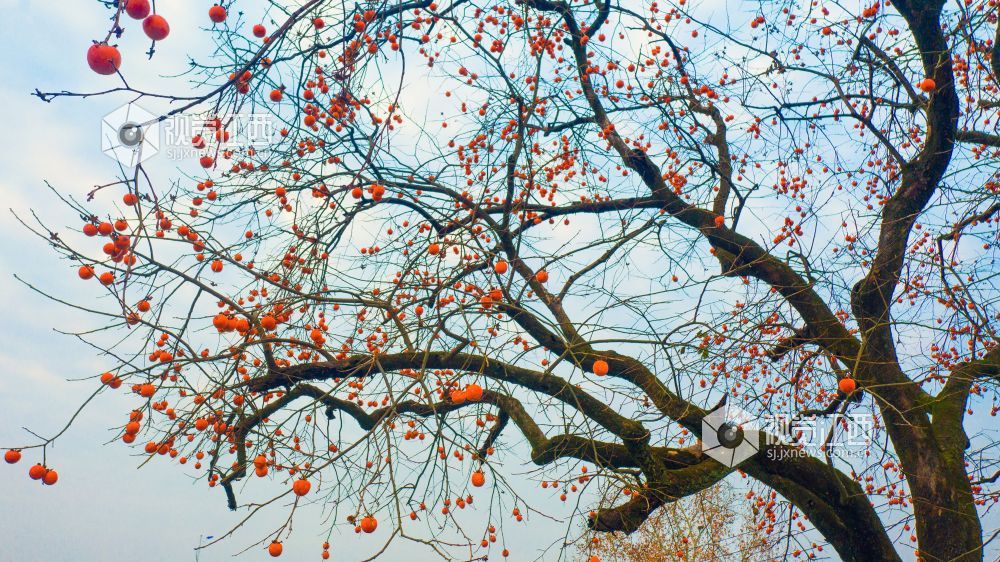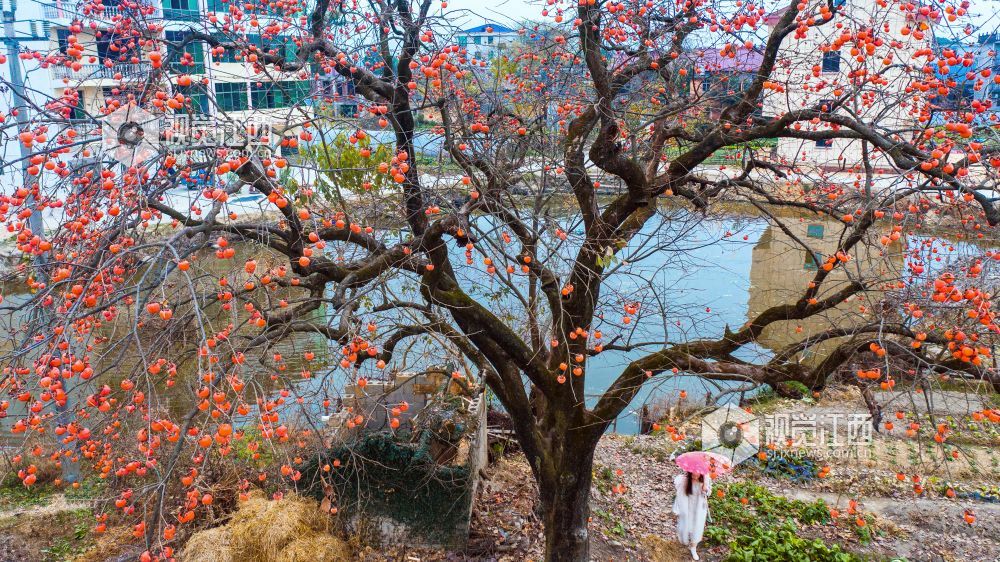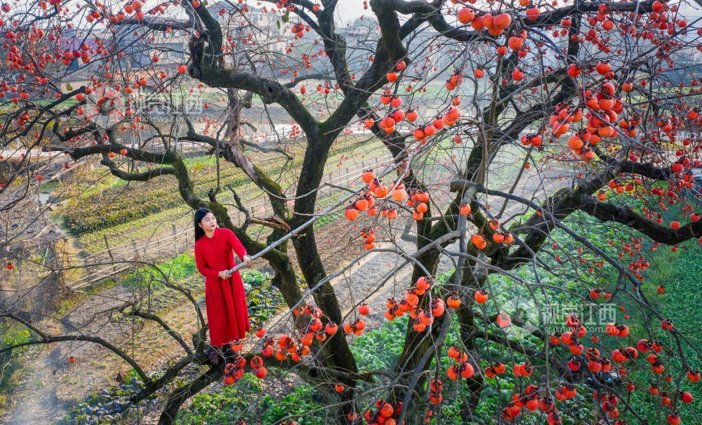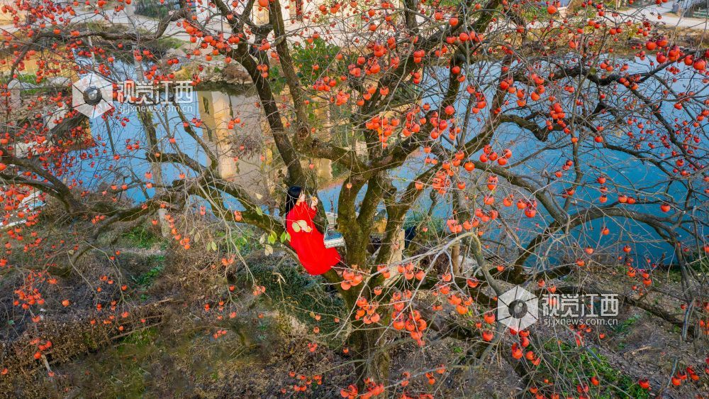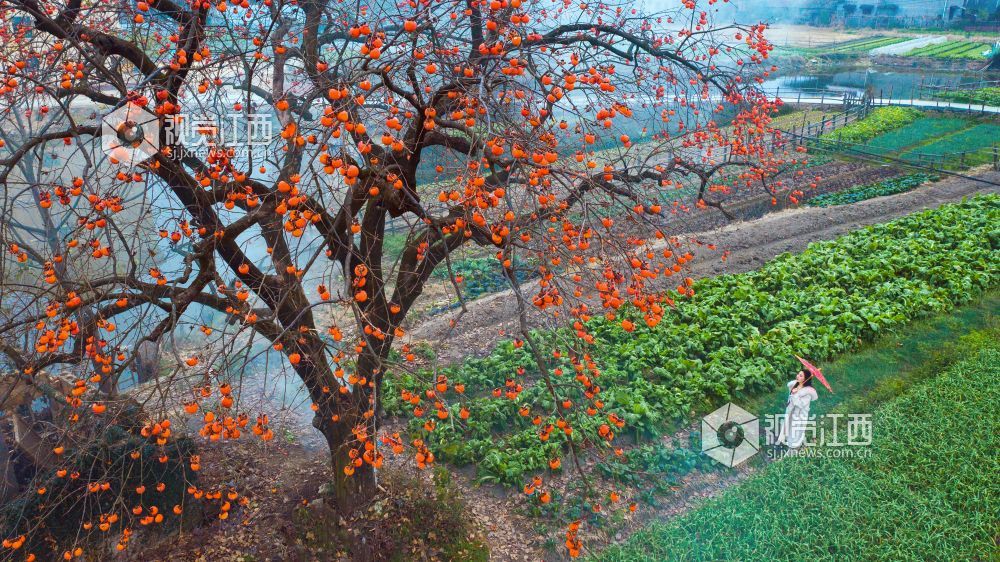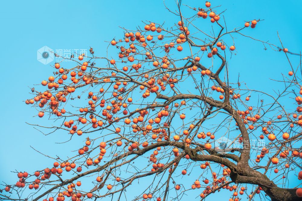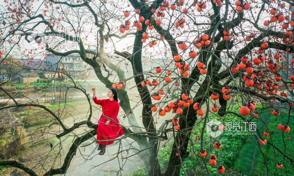寒露来临,冬霜染树,12月23日,在江西省峡江县巴邱镇肖家村的柿子是正好红的时候。深绿色的柿叶渐次变红,然后悄然滑落,只有柿子密密匝匝挂在枝头,宛若一支支紫红色的灯笼,随着风儿轻轻地摇曳,象征着一季的喜庆与祥和。柿子像一盏盏吉祥的灯笼,把家乡的冬装扮得分外喜庆和妖娆。