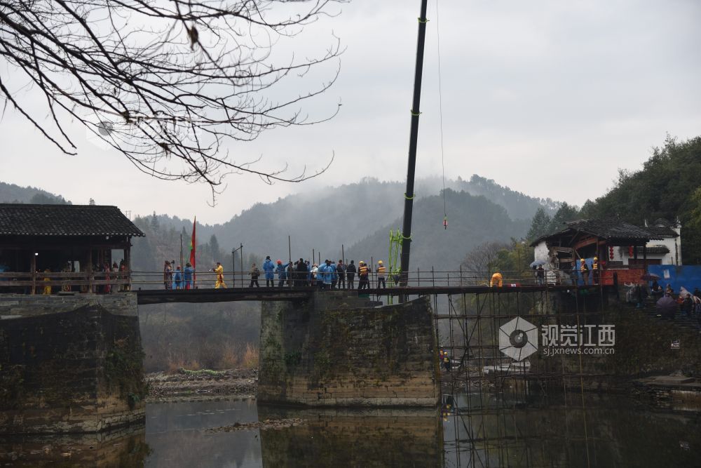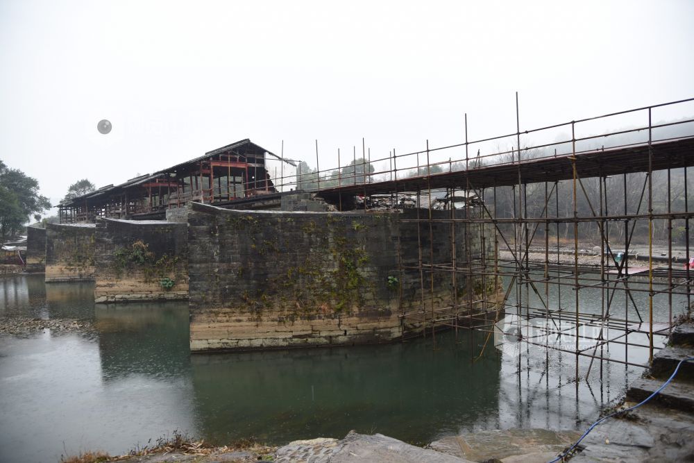 位于婺源县北部清华镇的彩虹桥,有近千年的历史,属于国家重点文物保护单位,被称为中国廊桥史上的绝版。今年受持续强降雨影响,7月8日,彩虹桥受到洪水冲击,部分桥面损毁。经过5个多月的努力,12月29日,“廊桥圆梦·彩虹再现”婺源县清华彩虹桥修缮工程开工仪式举行,表示将严格按照“安全第一、保护为主、旧料利用、统一风格”的原则,在保证绝对安全的前提下,充分利用原木构件,用最为适合的修缮技术,采用最小干预措施,尽量保持彩虹桥原形制,尽快恢复彩虹桥昔日光彩。
