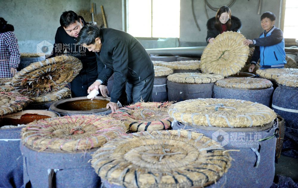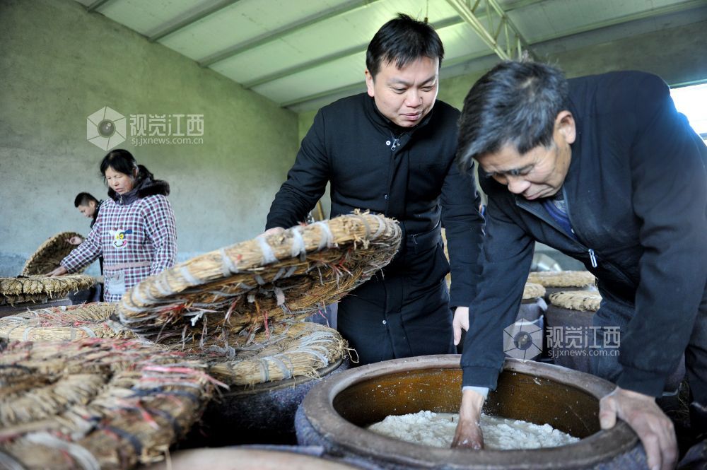 2021年1月1日,江西省德兴市昄大乡党员干部在定坑村农家酒厂了解传统古法酿酒工艺。