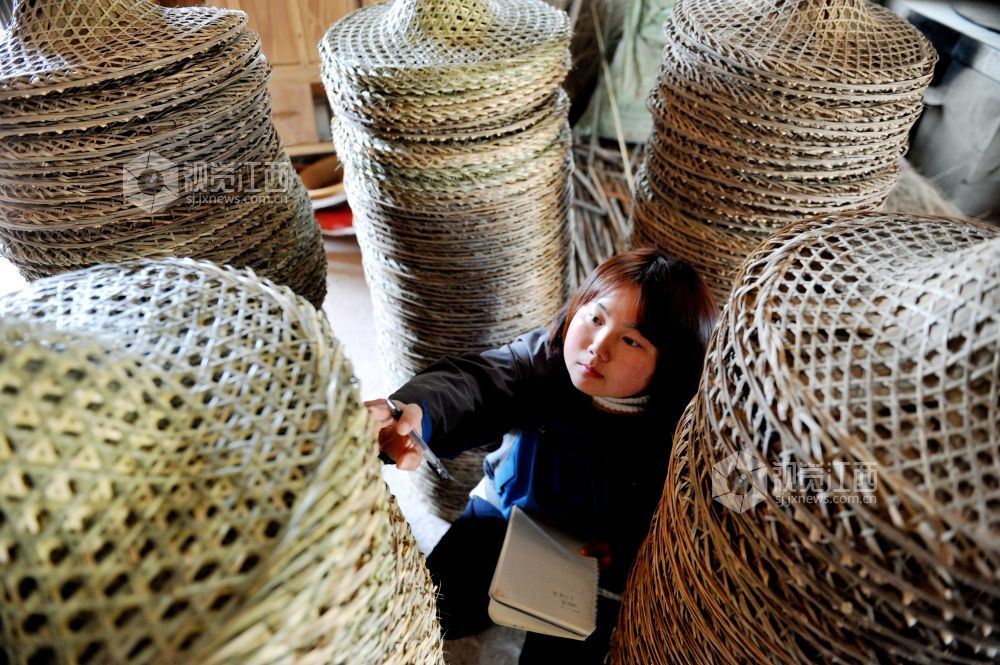 2021年1月10日,江西省德兴市黄柏乡宋家村第一书记黄婉婷正在清点销售到省外的订单斗笠。