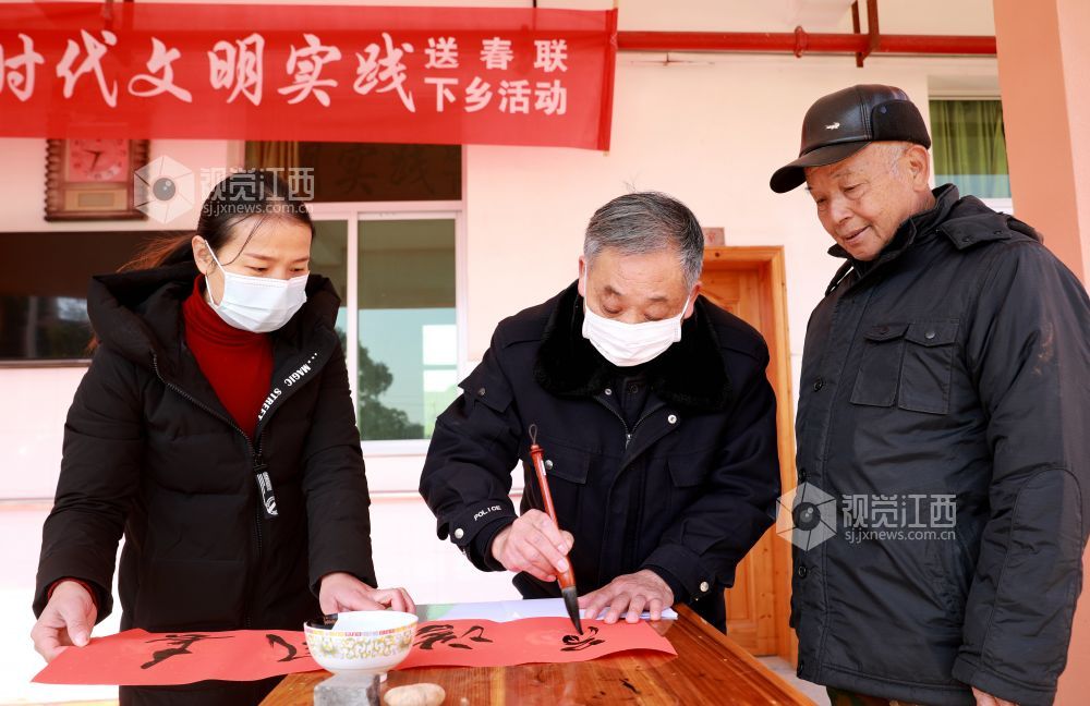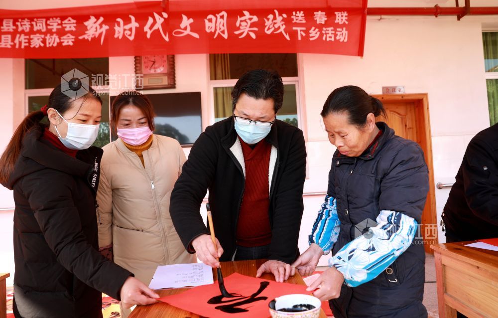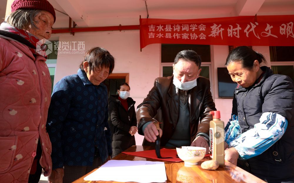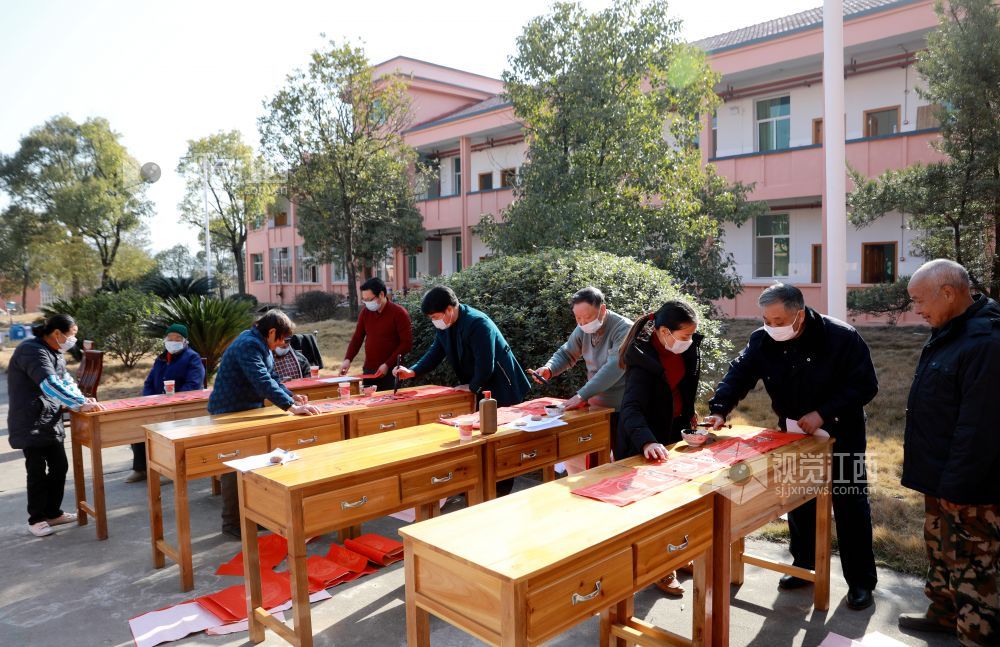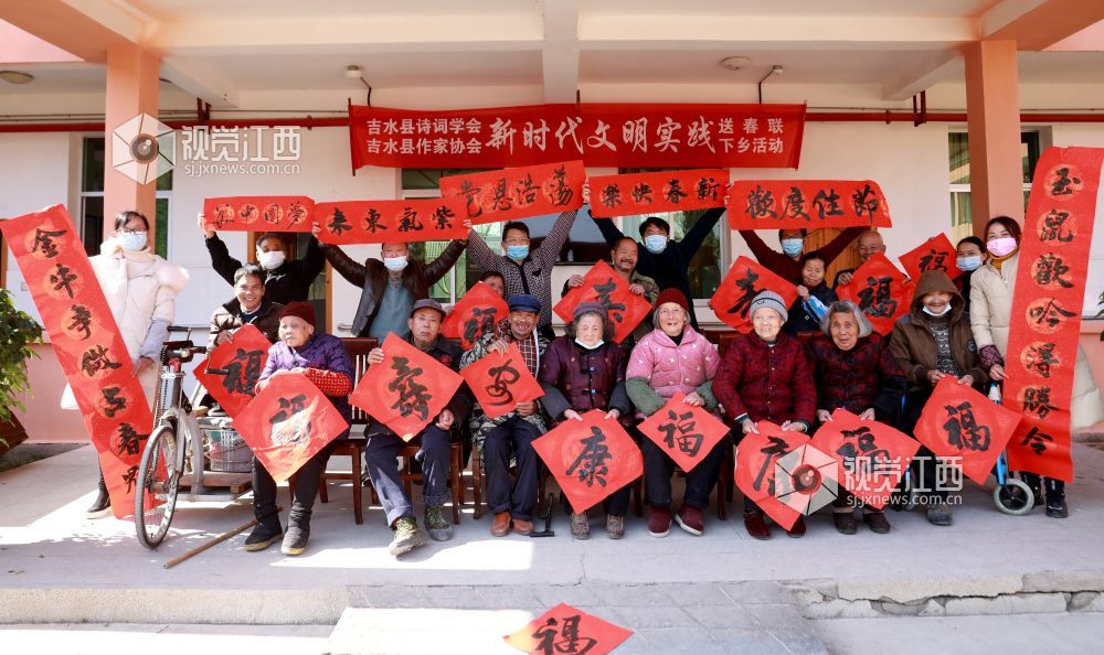 2021年1月18日,江西省吉水县文峰镇敬老院,吉水县文联组织该县作家协会、诗词学会志愿者开展新时代文明实践送春联进敬老院活动,志愿者为老人们写春联、贴对联,为老人们送来新春祝福。