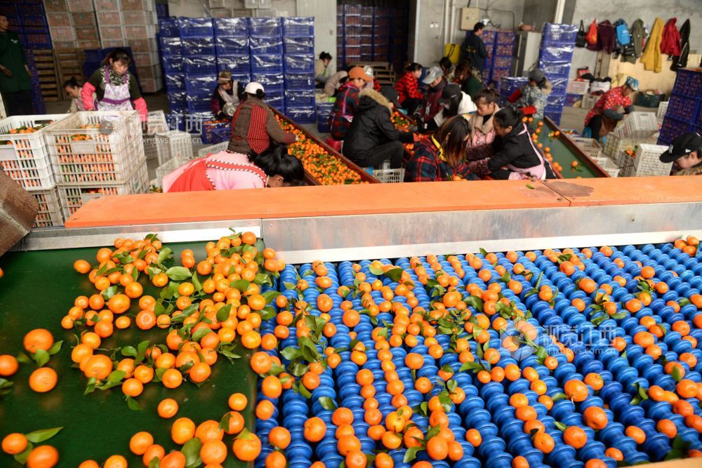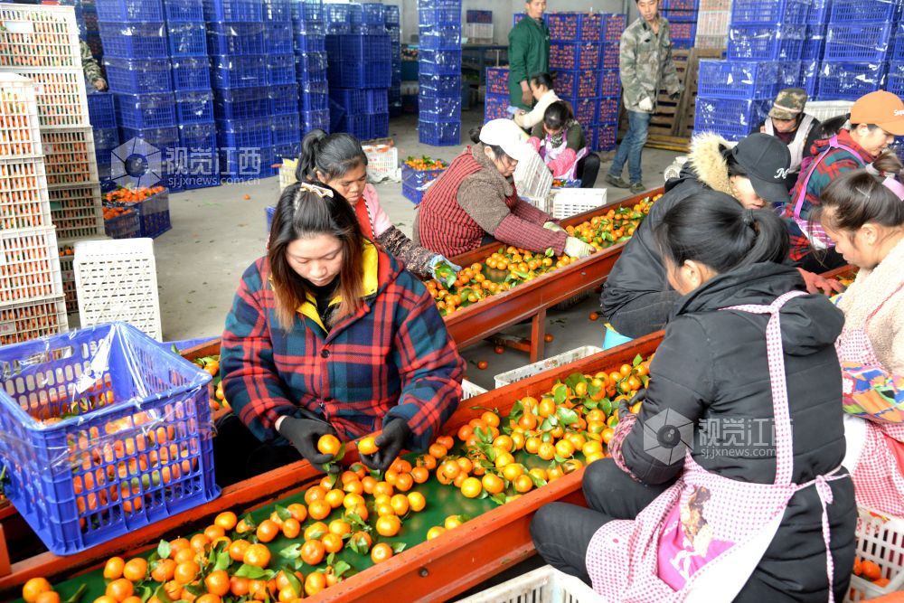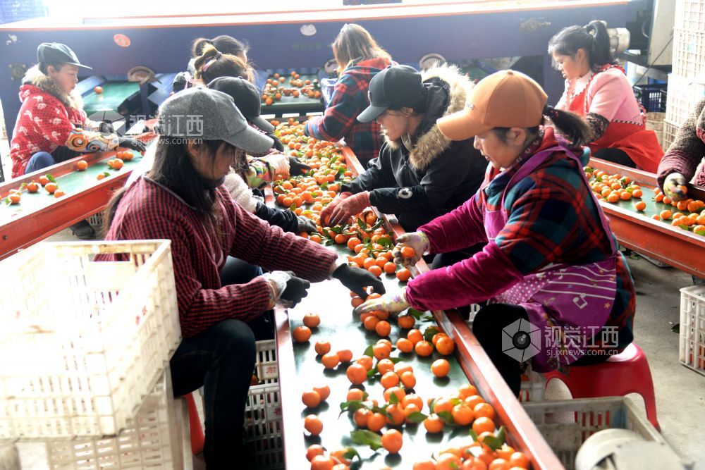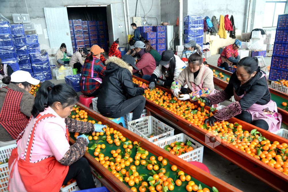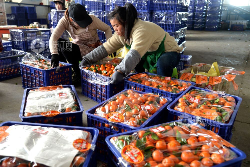 2021年1月20日,腊月初八,江西省南丰县市山镇梓和村盛旺果品合作社组织农民工分拣、加工包装南丰蜜橘,准备销往全国各地,以满足春节市场消费者的需求。