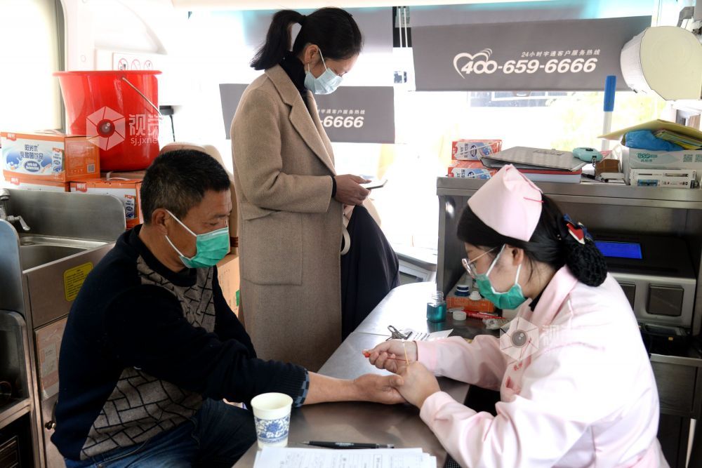 1月21日,在江西省南丰县新百汇超市对面的抚州市中心血站流动献血车上,志愿者响应“献血战役 为爱接力”的倡议,参加义务献血活动。