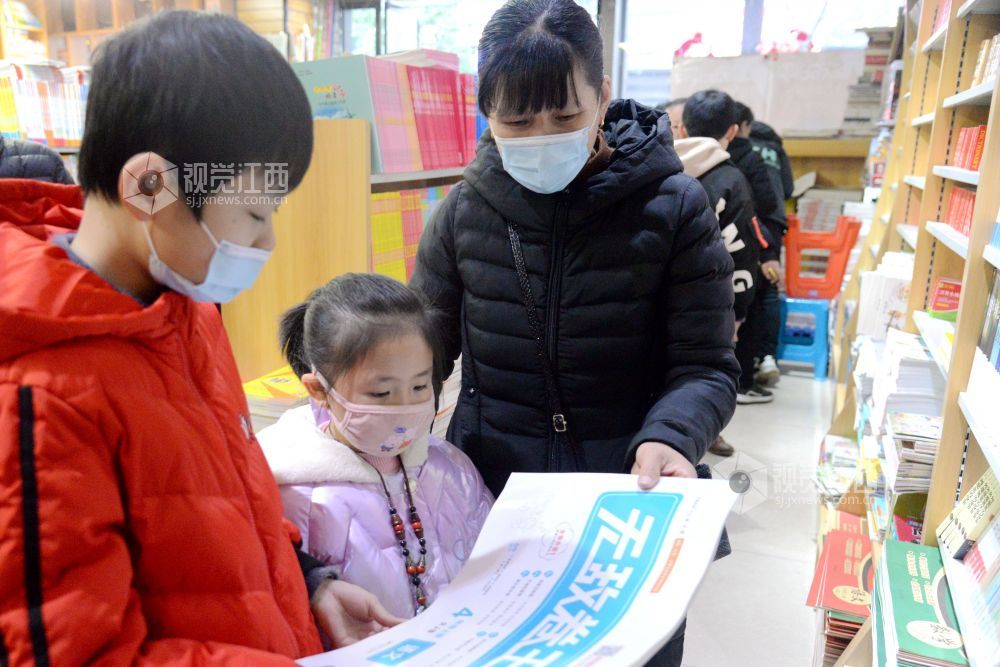 2021年1月24日,在江西省抚州市南丰县桔都书店书柜前,家长带着孩子在阅读和选购课外书籍。