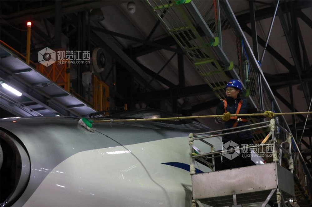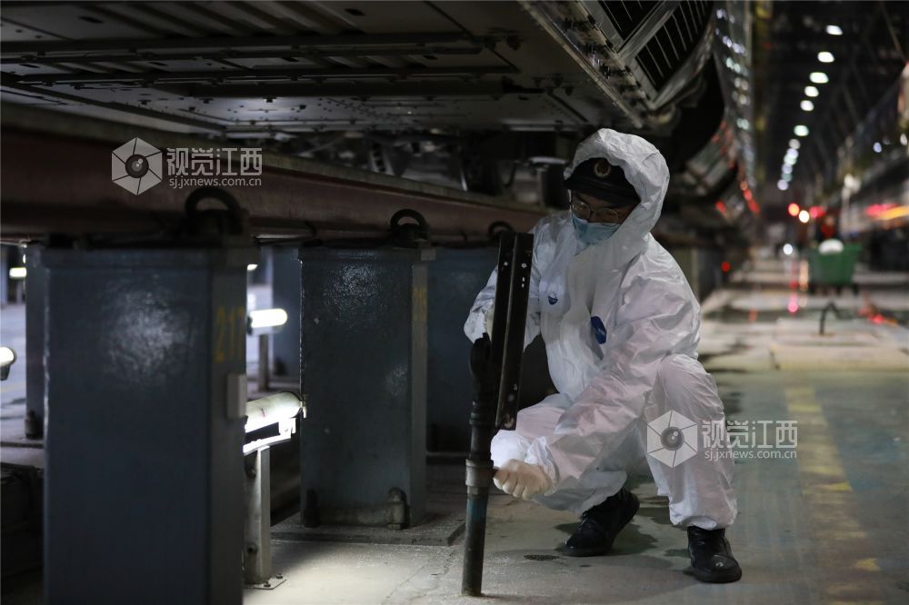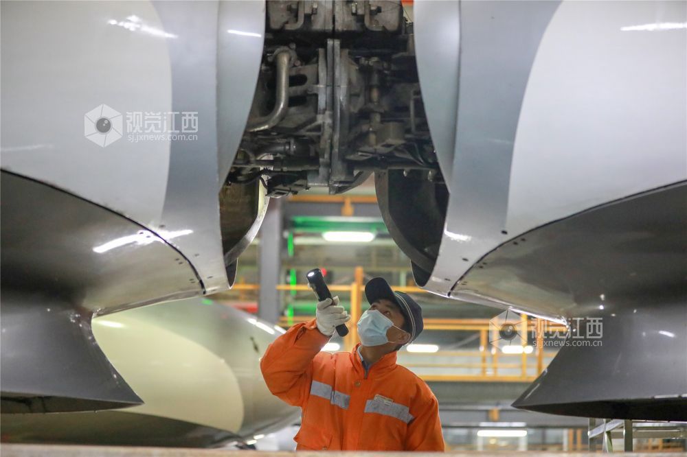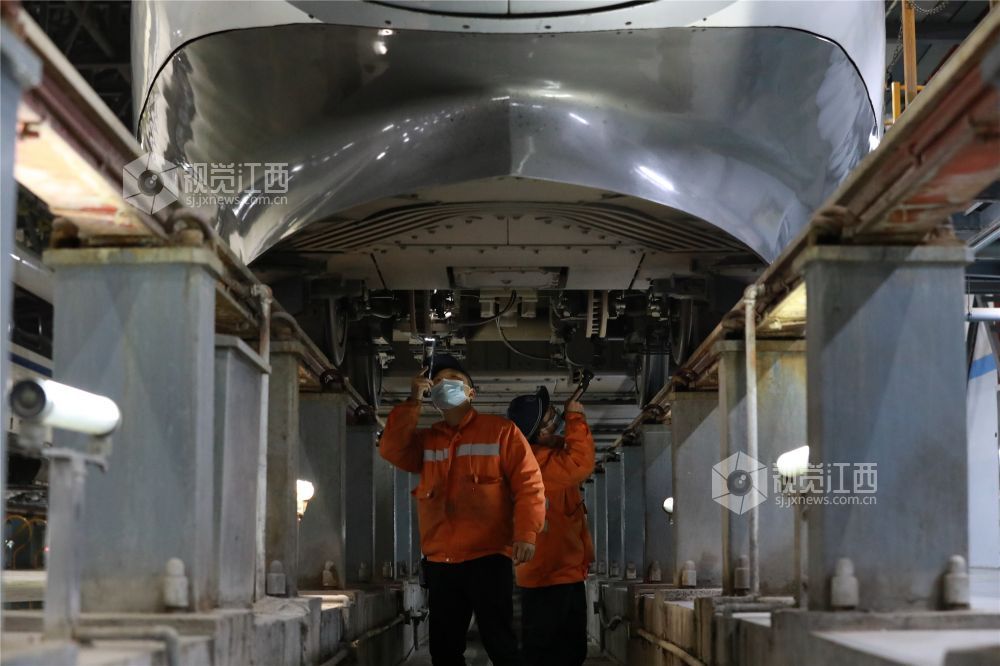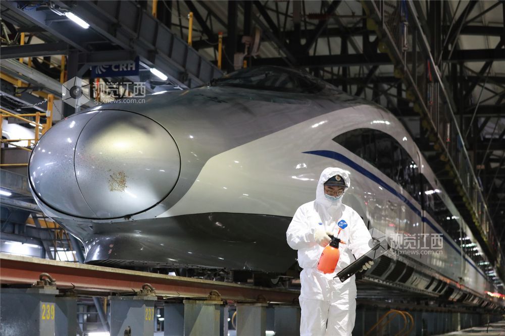 1月24日,南昌西动车组运用一所内灯火通明,一列列动车组陆续驶入检修库内,工作人员对其进行检修与防疫消杀作业,确保动车组列车洁净卫生,零故障出库。