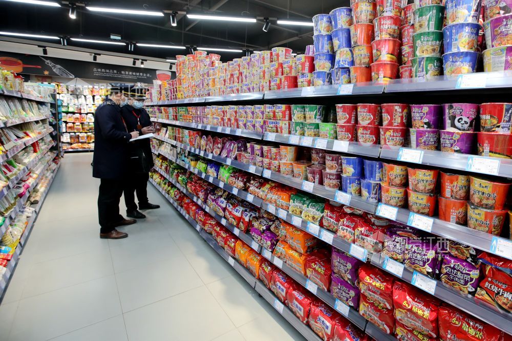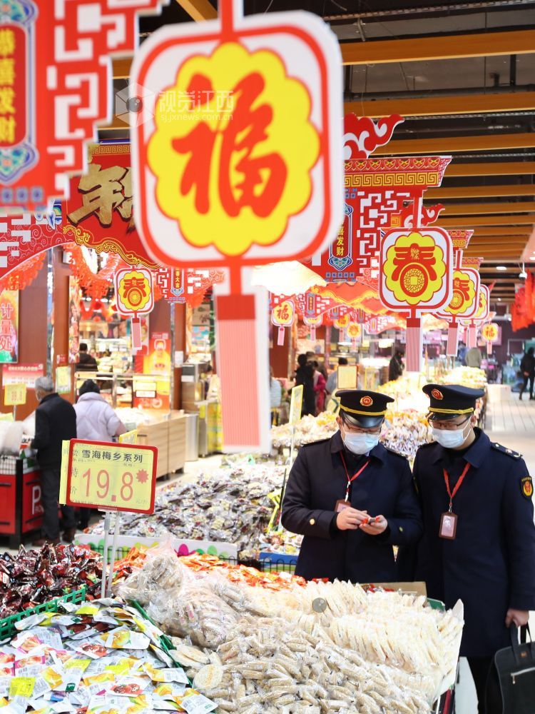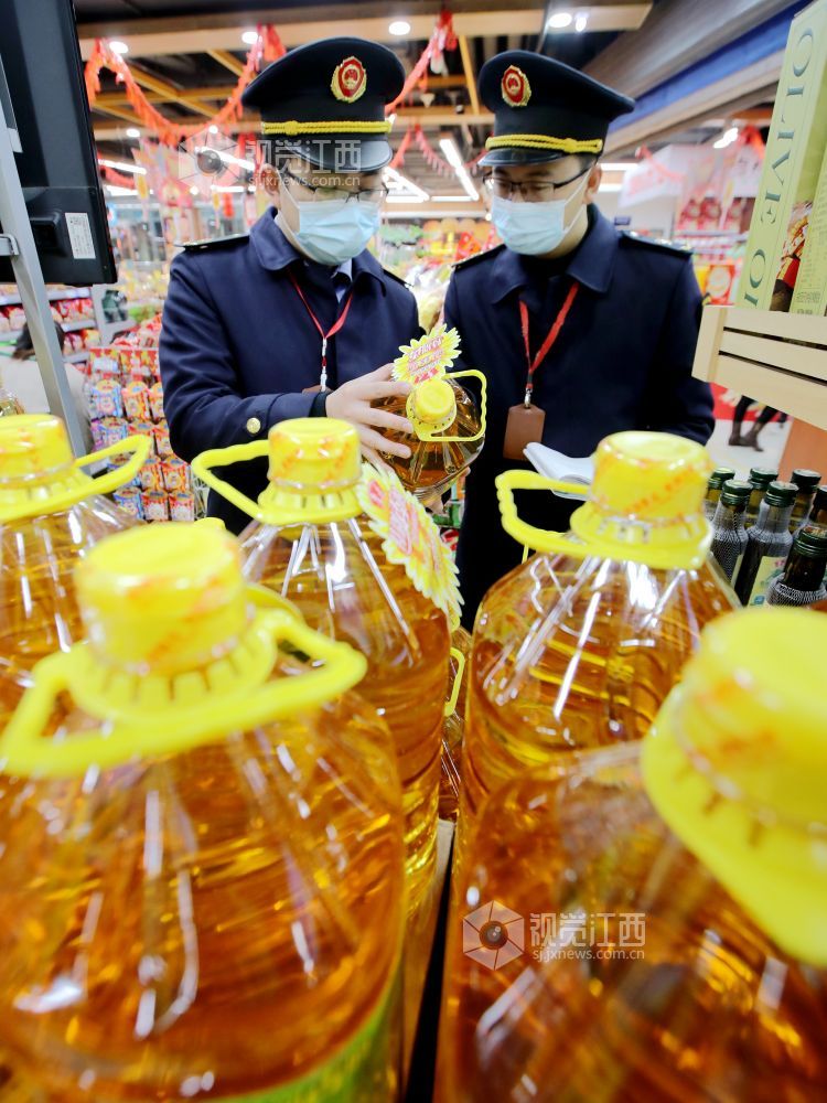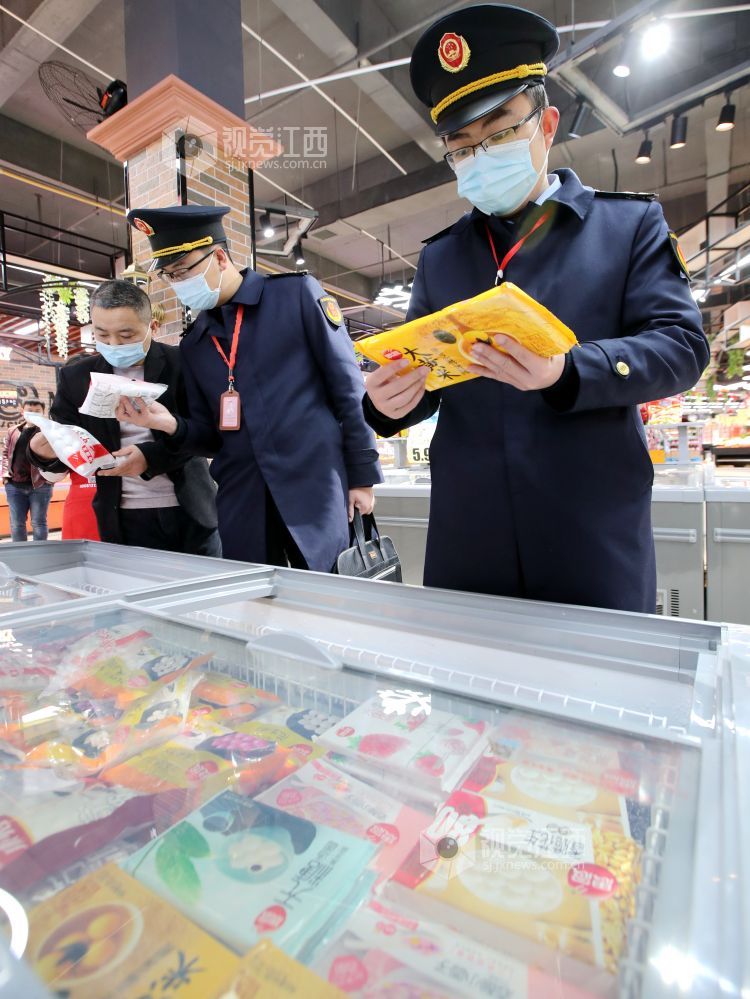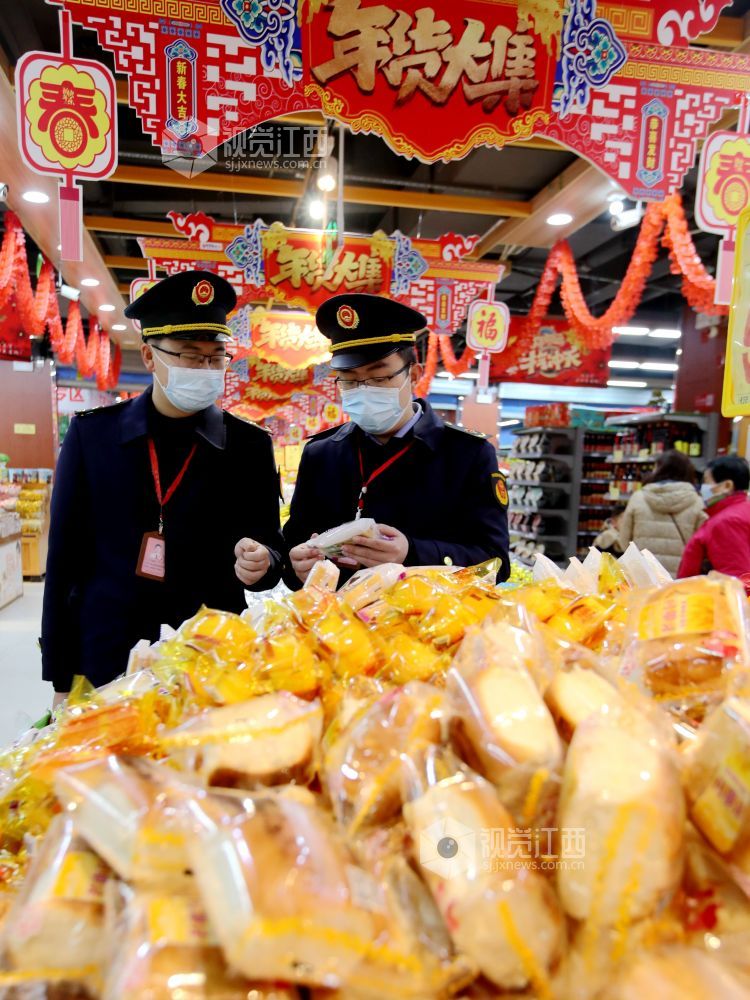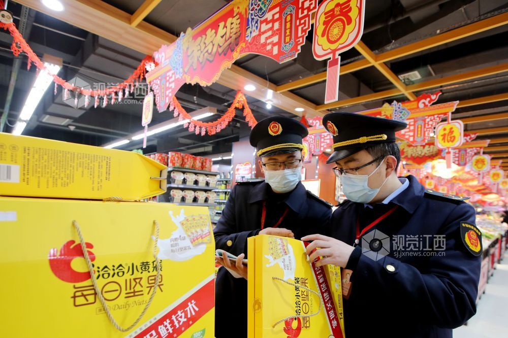 2021年1月27日,江西省吉安市峡江县市场监督管理局工作人员对一家超市销售的食品进行检查。