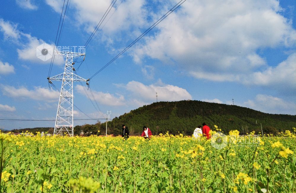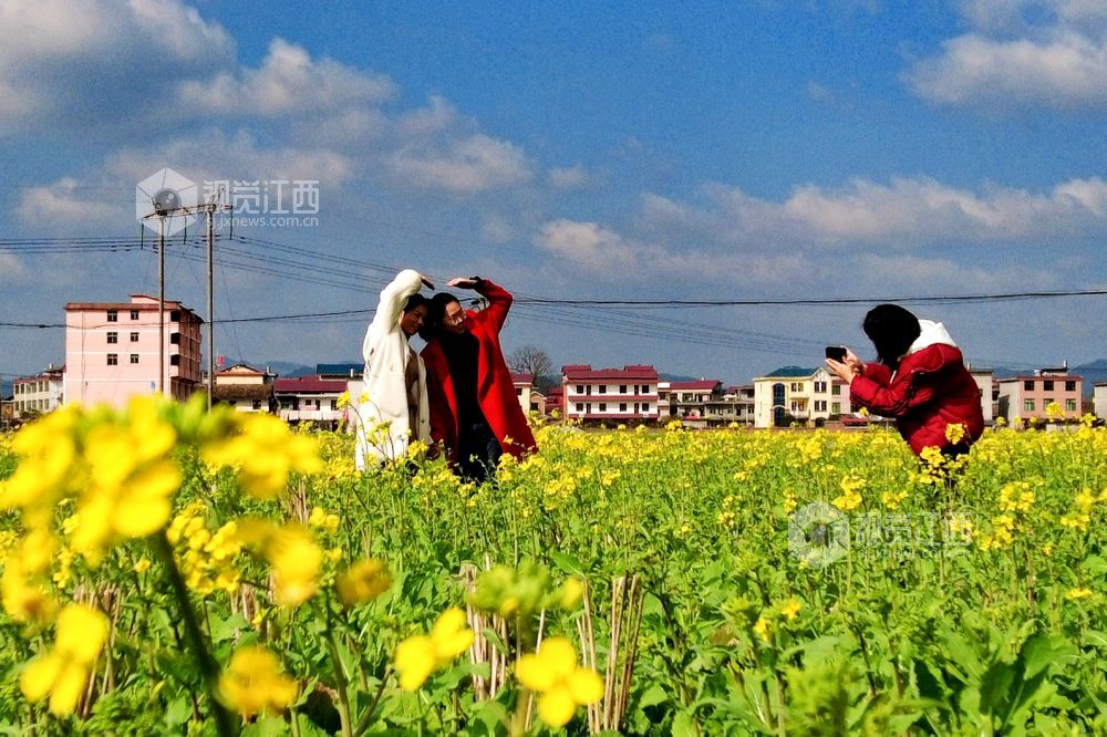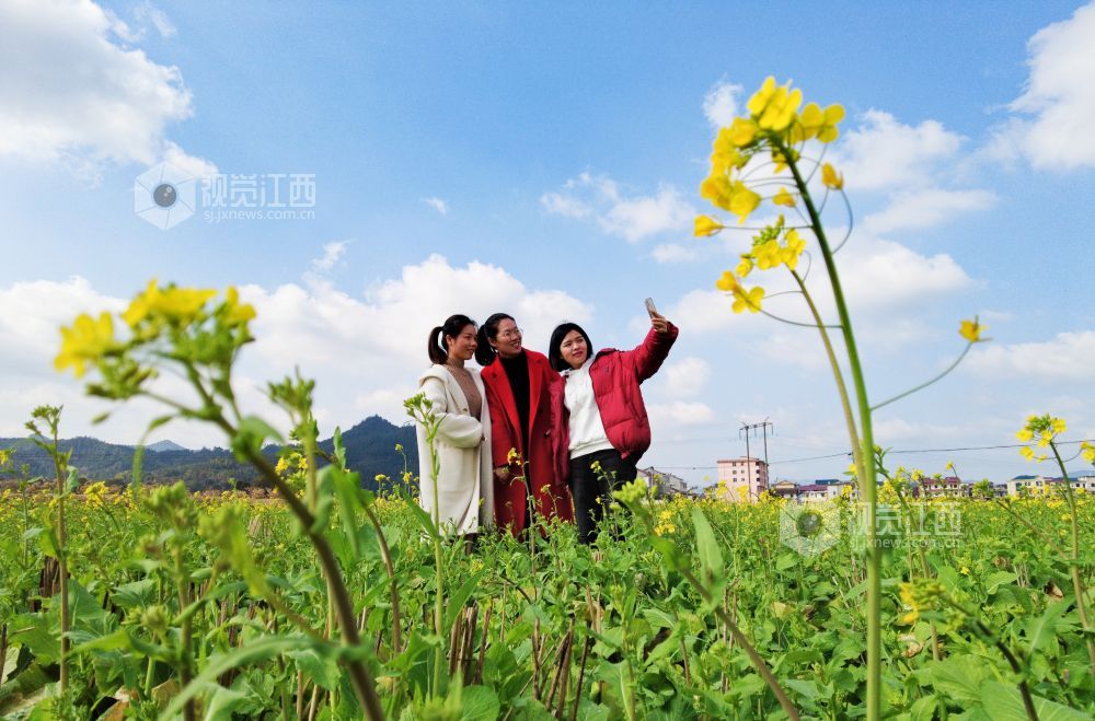 2021年1月28日,江西省吉安市峡江县金江乡的千亩油菜花竞相绽放,游客们徜徉在花田中,尽享乡村美景。