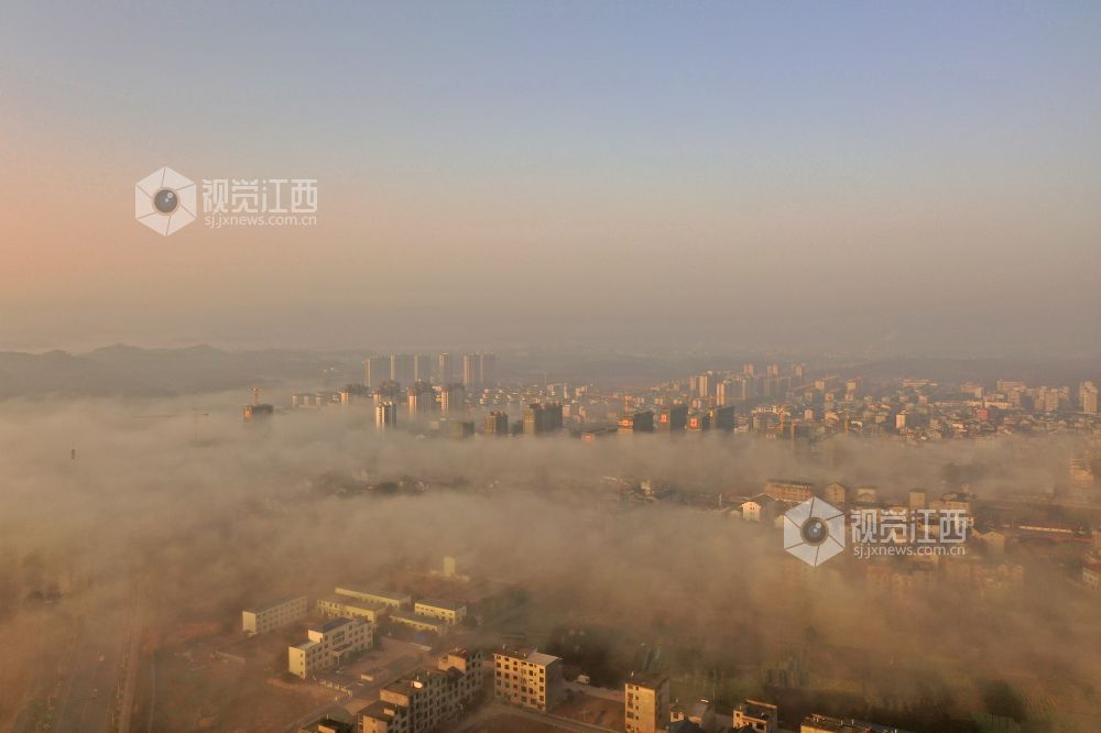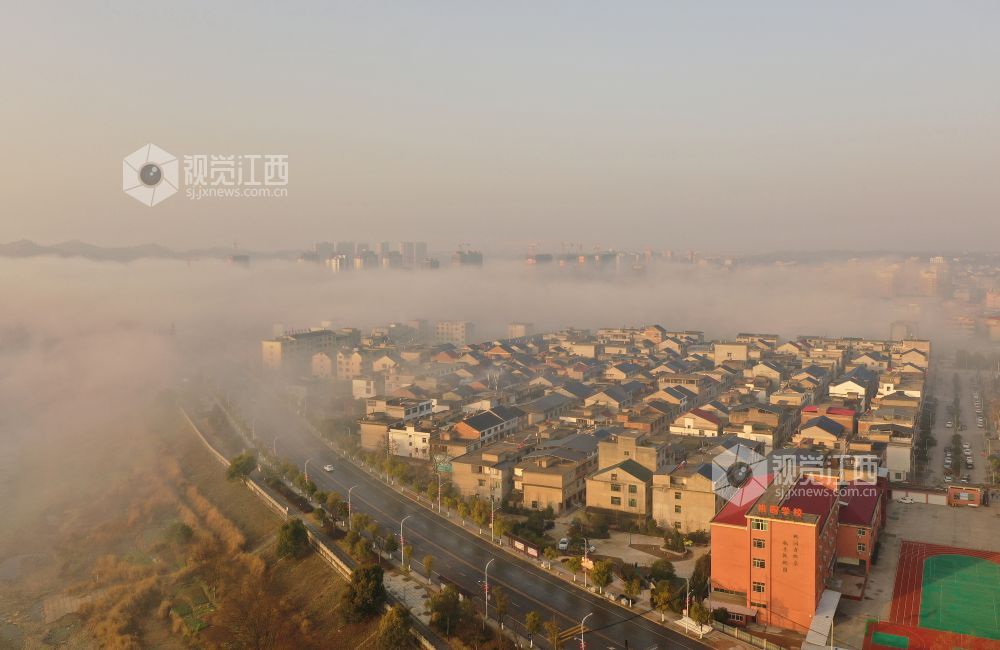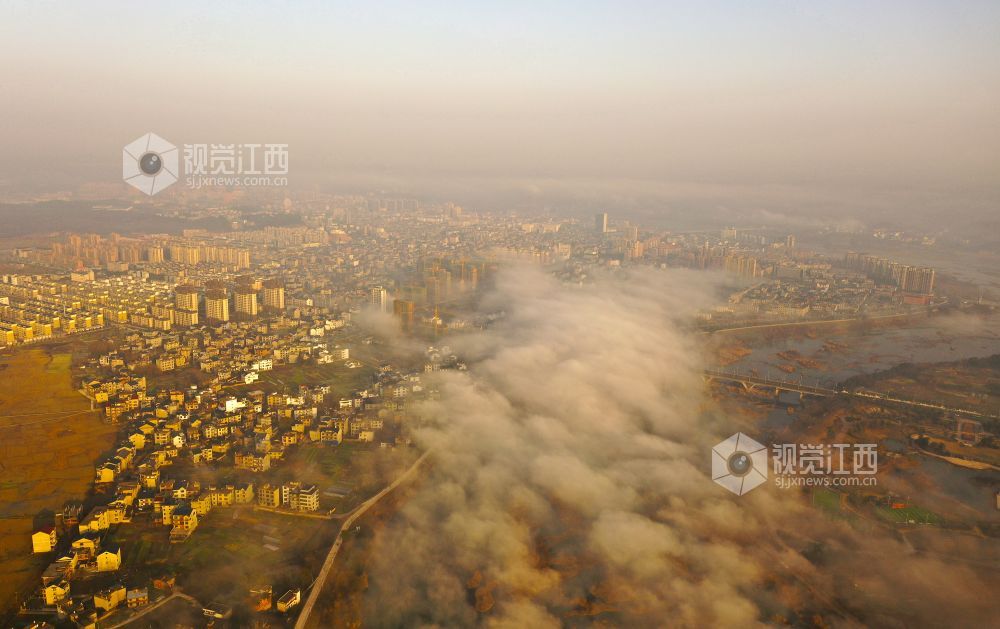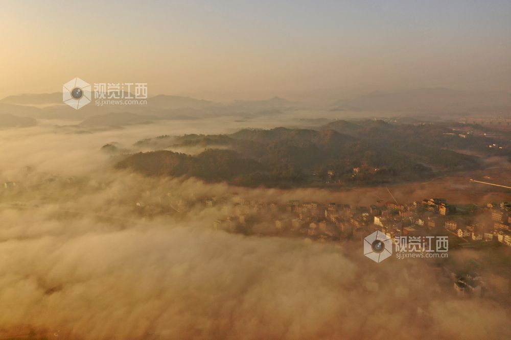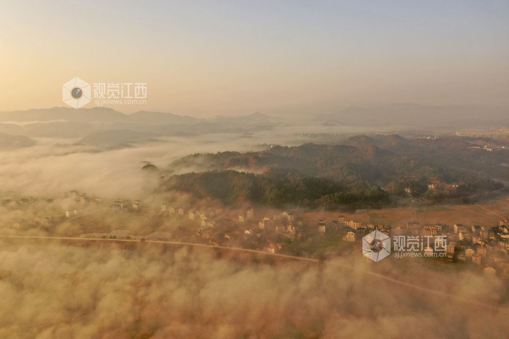 2021年1月29日,航拍江西省上饶市铅山县河口镇的村庄和城市在雾海之中若隐若现,如画卷般的朦胧景色好似仙境!
