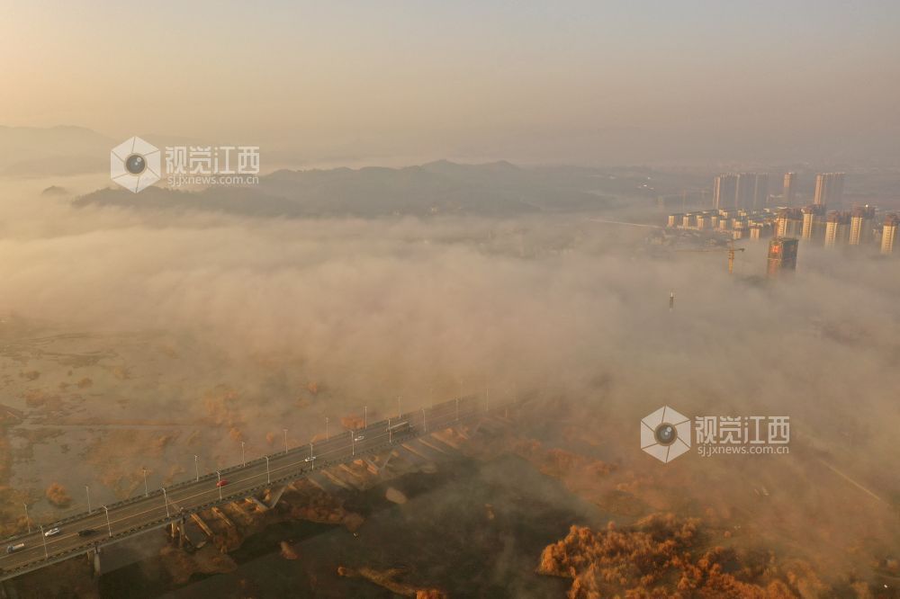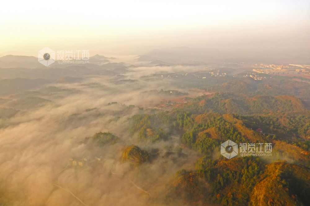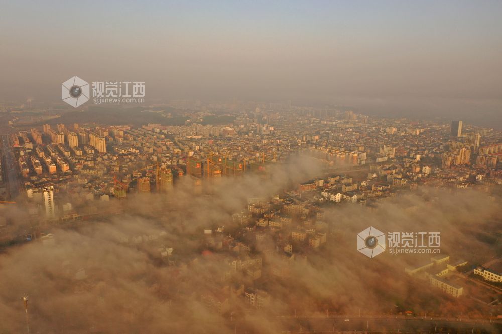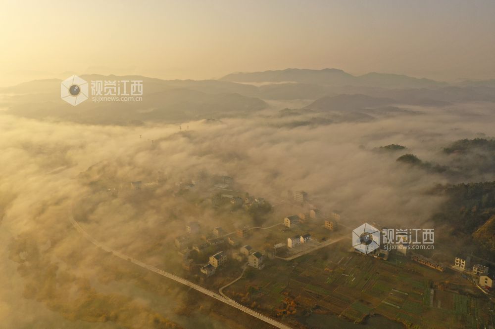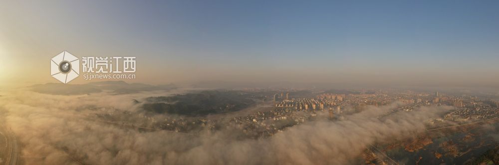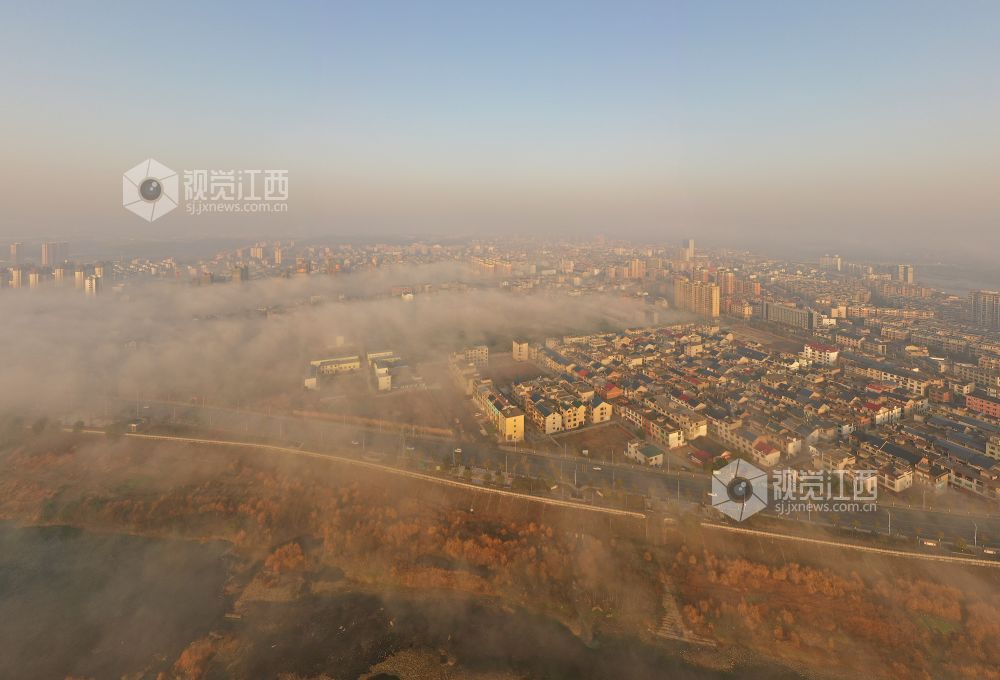 2021年1月29日,航拍江西省上饶市铅山县河口镇的村庄和城市在雾海之中若隐若现,如画卷般的朦胧景色好似仙境!