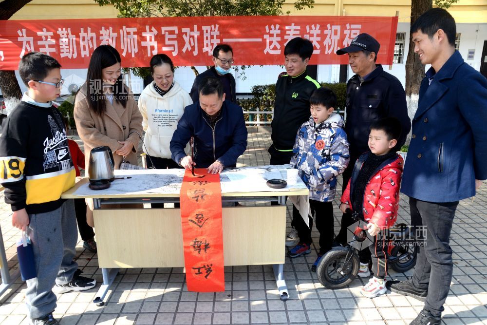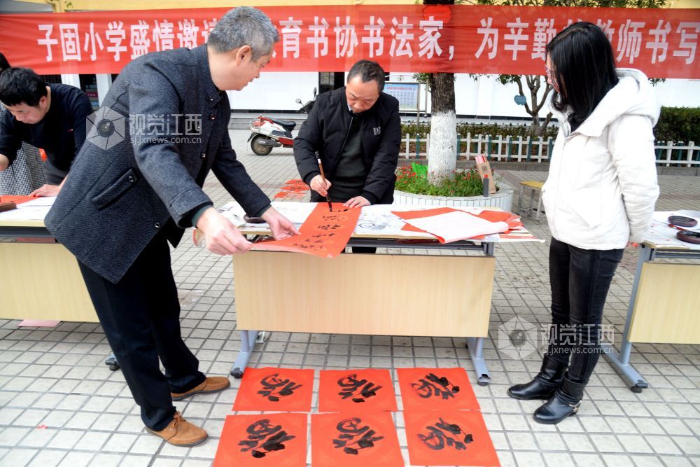 当日,江西省南丰县子固小学邀请县教育书法家协会举办“为辛勤的教师书写对联——送春送祝福”活动。活动现场,县教育书法家协会10余位书法家尽情地挥毫泼墨,红红的对联,浓浓的墨香,每一个字都蕴含着满满的新春祝福。