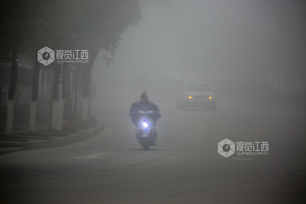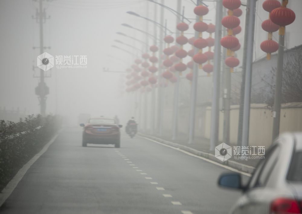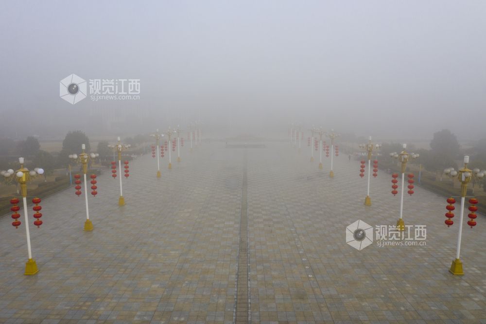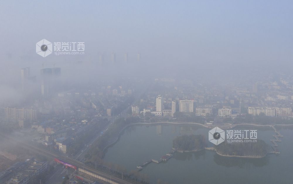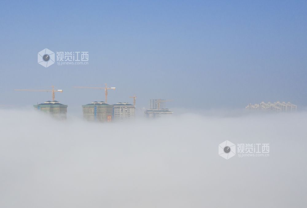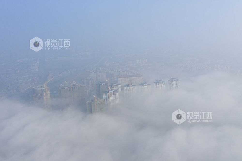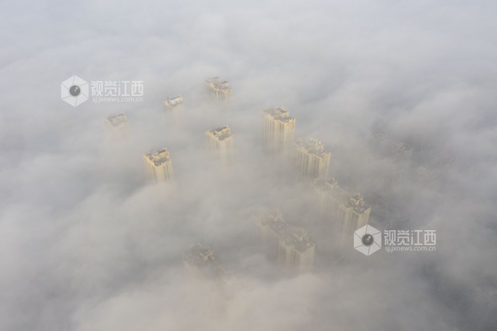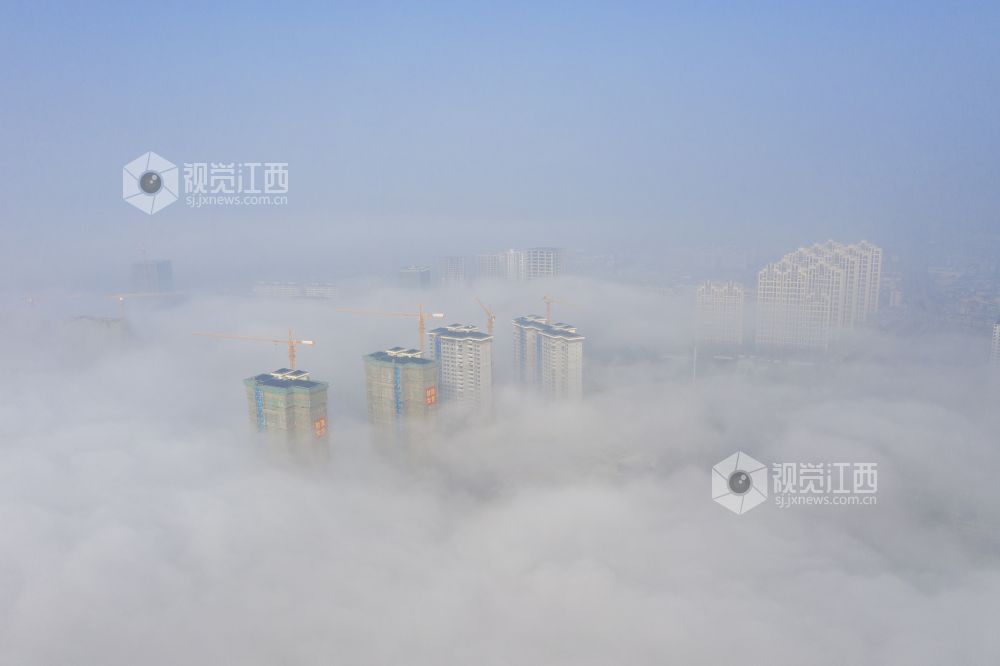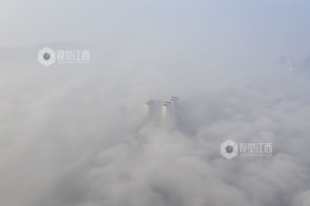 2021年2月3日,江西瑞昌市出现能见度不足500米的大雾。江西省瑞昌市众多高层建筑被大雾笼罩,若隐若现,行人和汽车在大雾中缓慢行走。