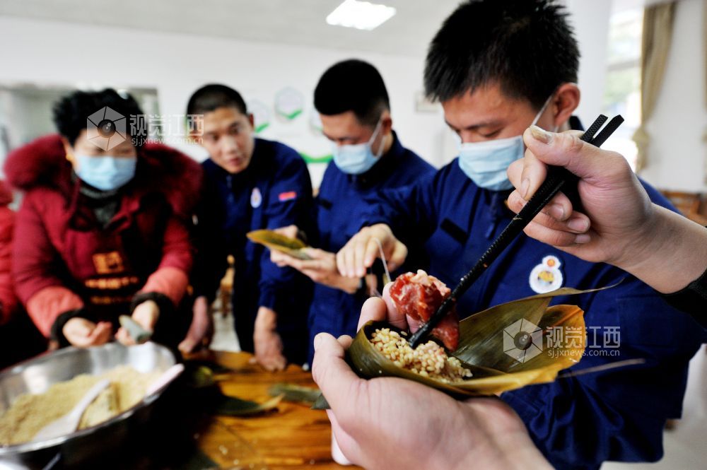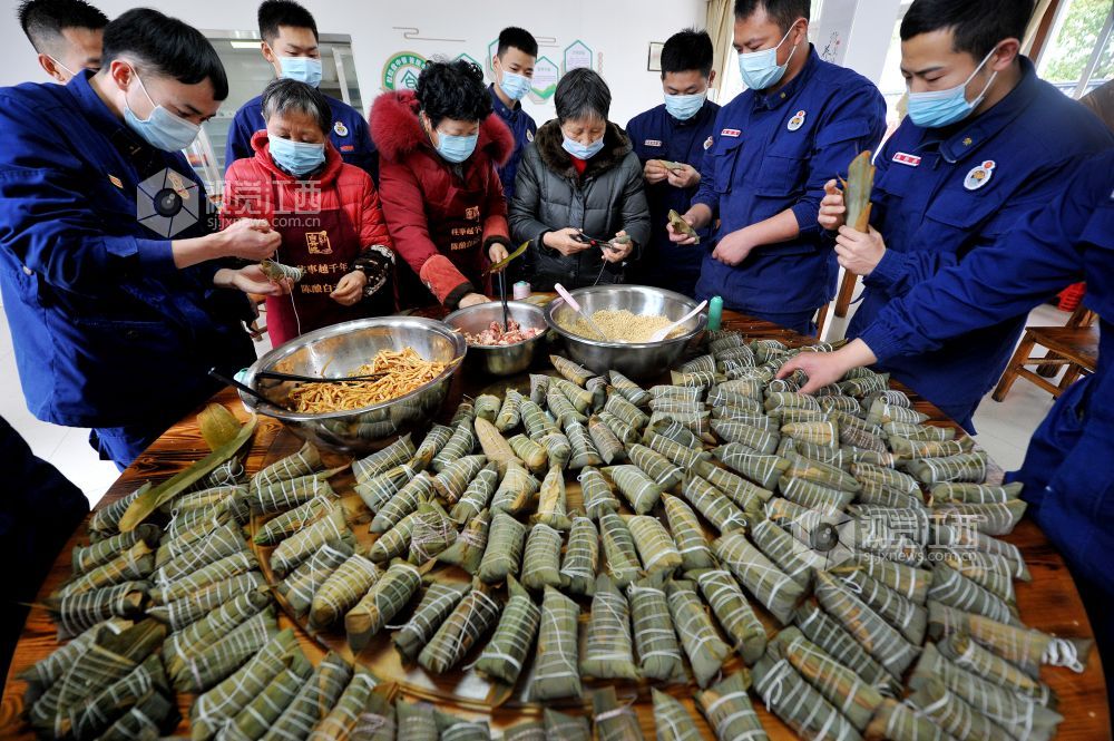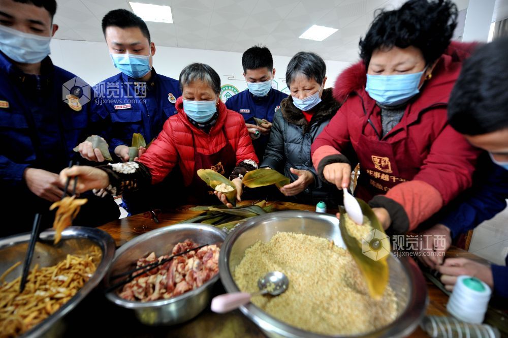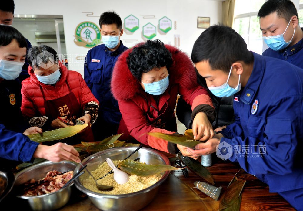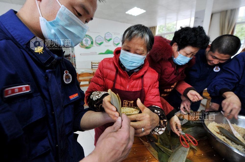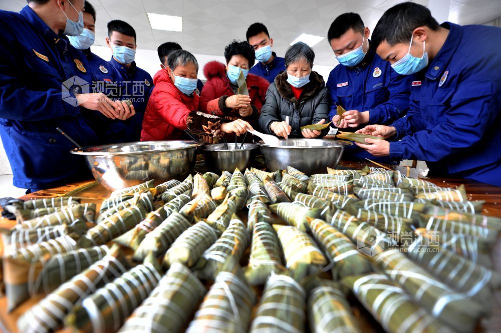 2021年2月4日,江西省德兴市区的三名已经退休的大妈,在该市消防救援大队手把手教驻地消防指战员包粽子。