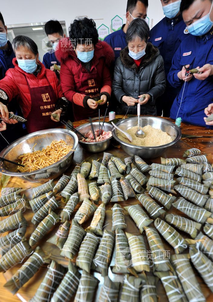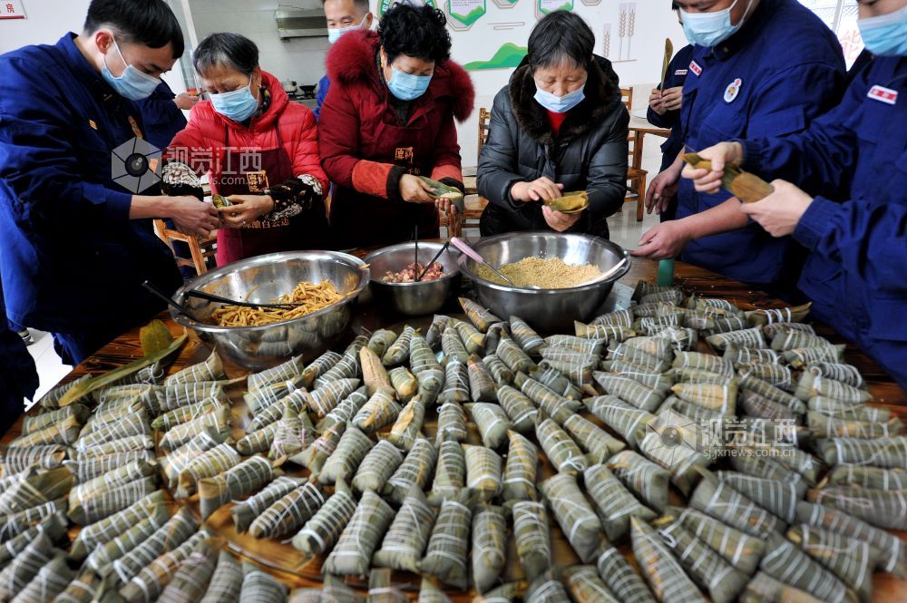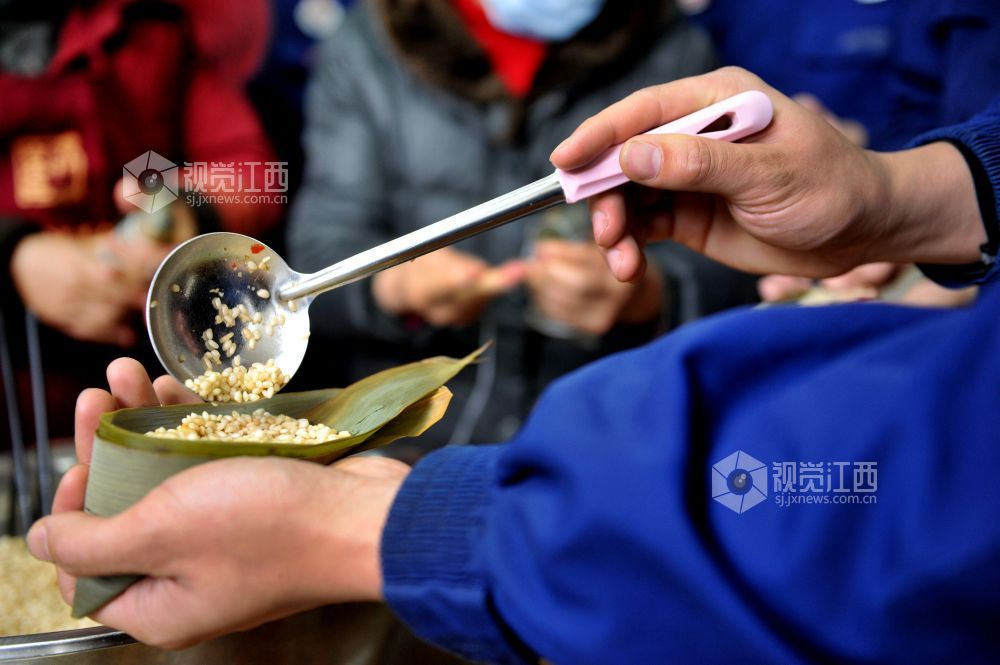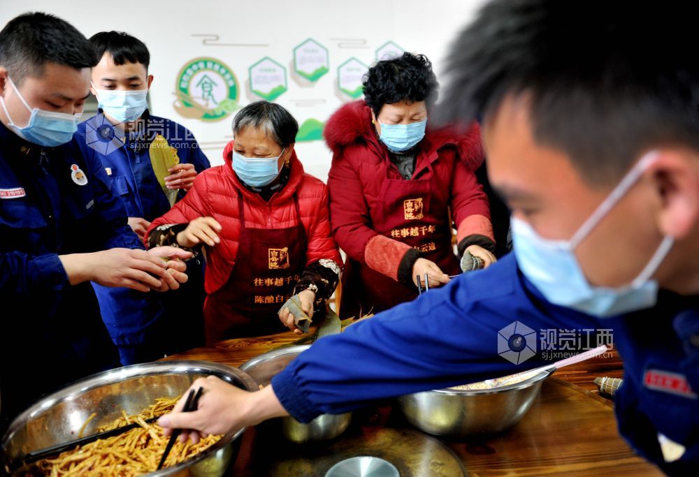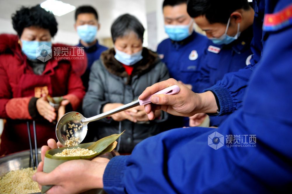 2021年2月4日,江西省德兴市区的三名已经退休的大妈,在该市消防救援大队手把手教驻地消防指战员包粽子。