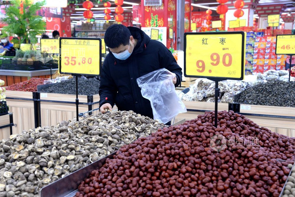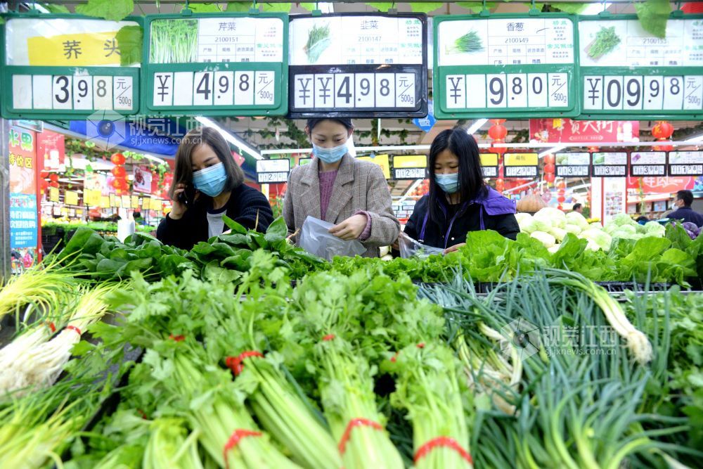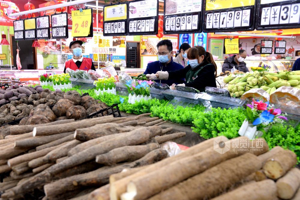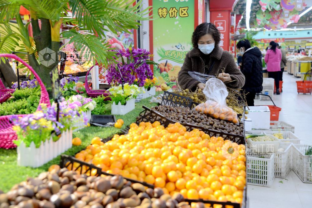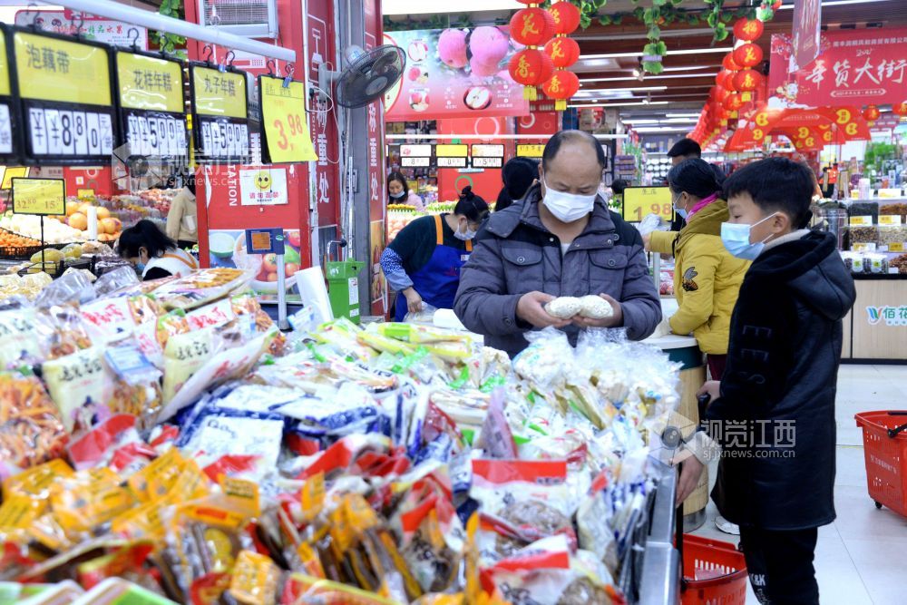 2021年2月6日,在江西省抚州市南丰县一家大型连锁超市,市民正在选购肉类、蔬菜、水果、糖果等。