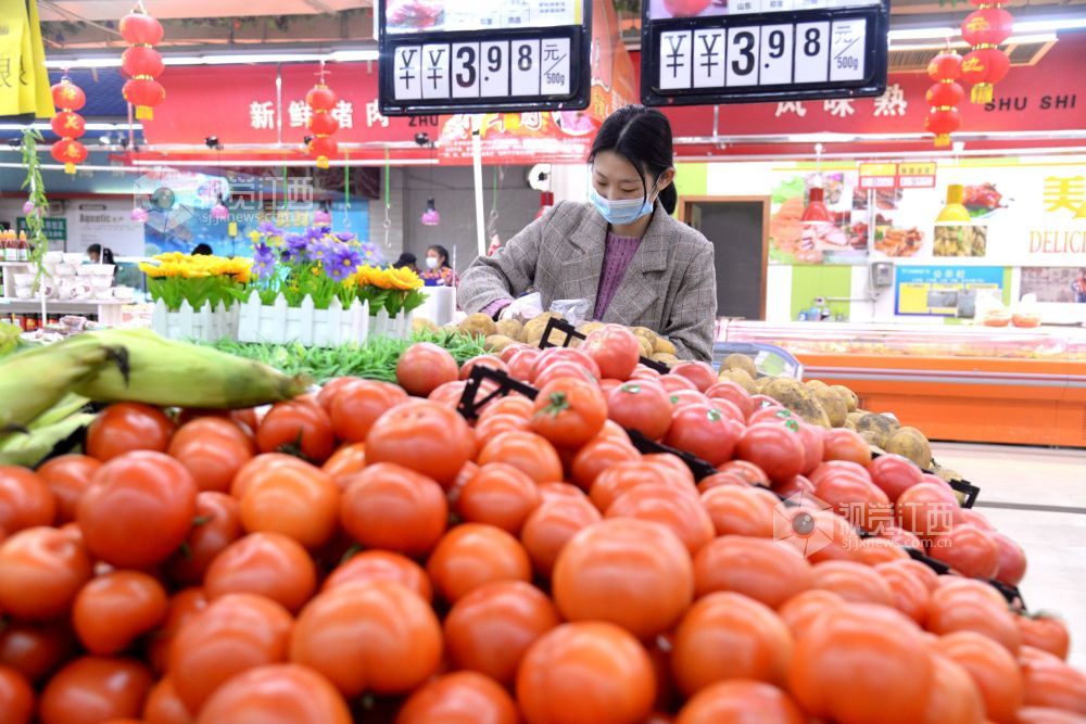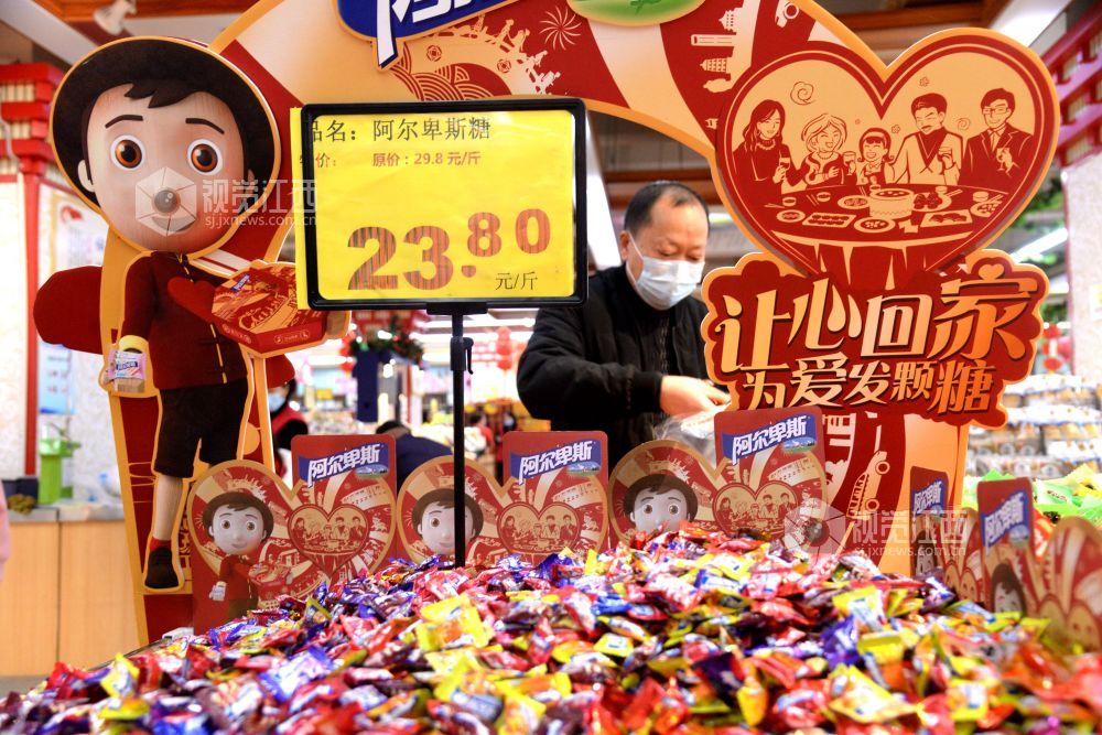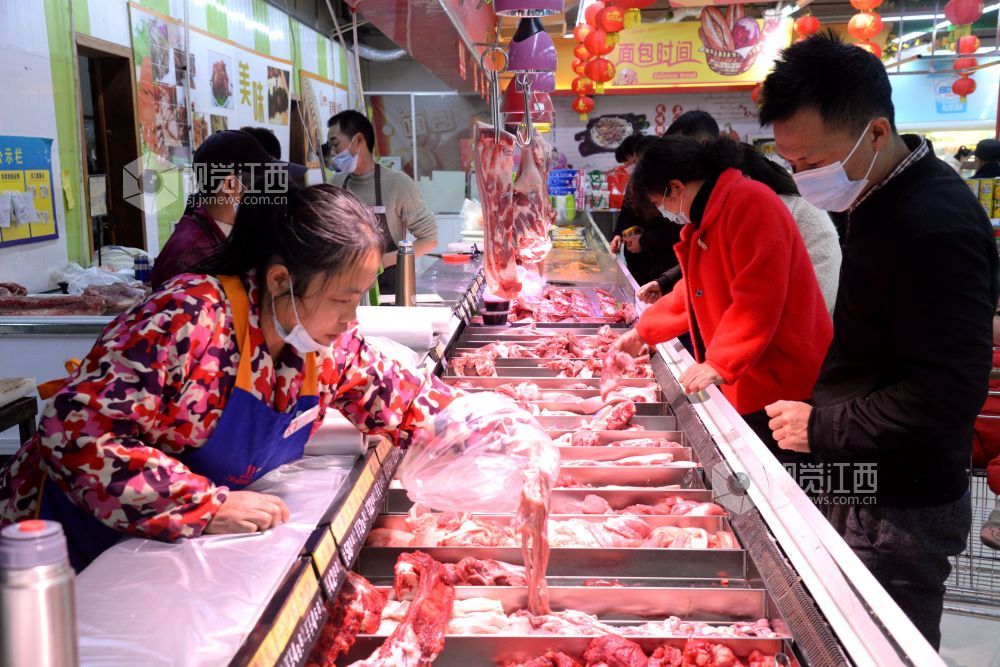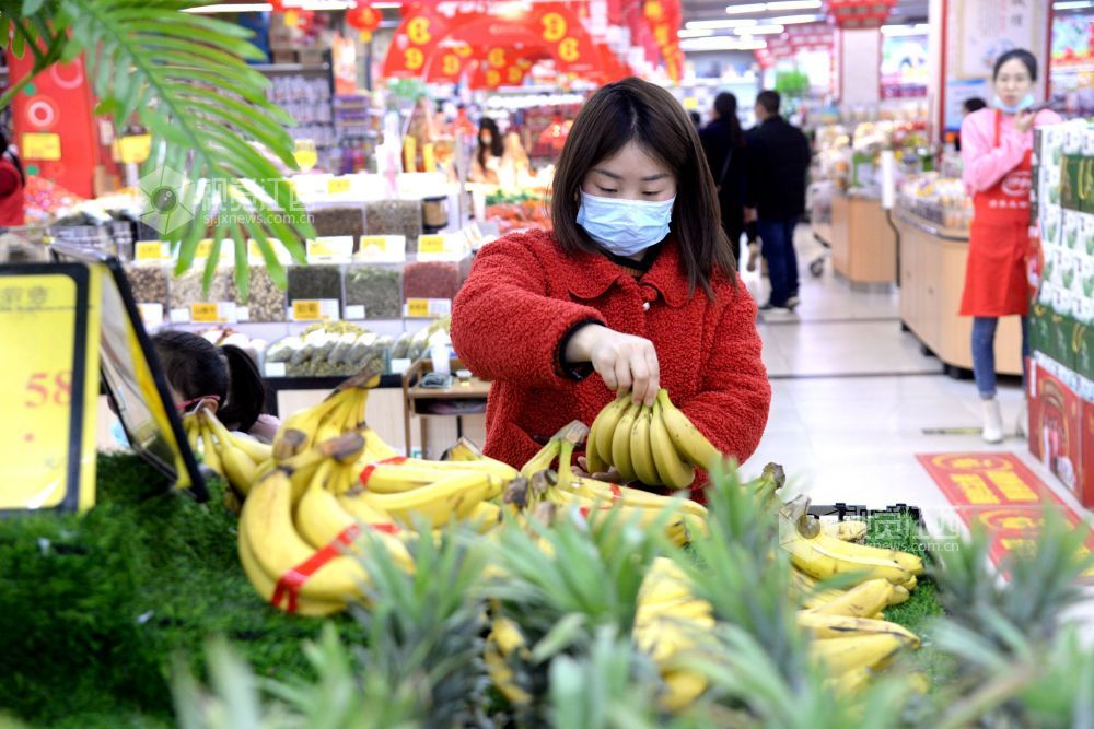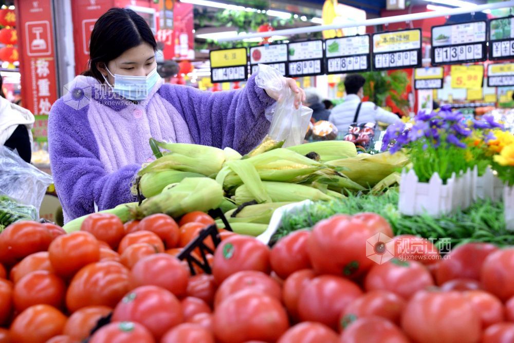 2021年2月6日,在江西省抚州市南丰县一家大型连锁超市,市民正在选购肉类、蔬菜、水果、糖果等。