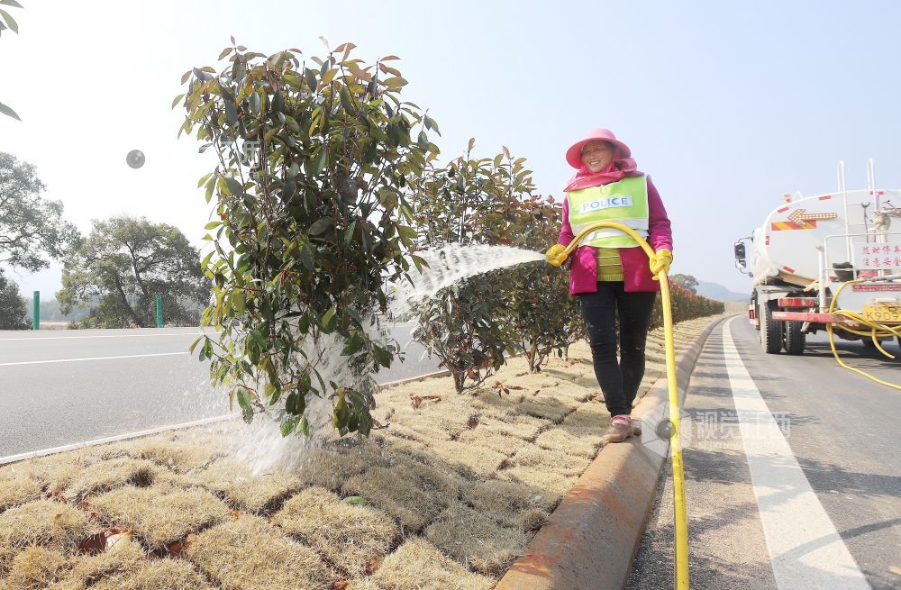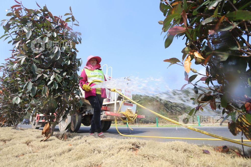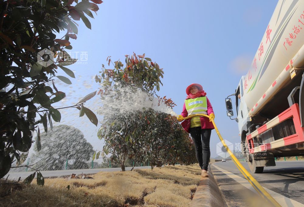 2月7日,江西省安福县旅游快速通道横龙镇洲里段护路工人在给新栽的树木浇水。安福县旅游快速通道是该县新修的一级公路,全长41公里,于近日竣工通车。春节临近,该县加班加点给这条公路植树绿化,提升公路景观效果,改善公路沿线生态环境。