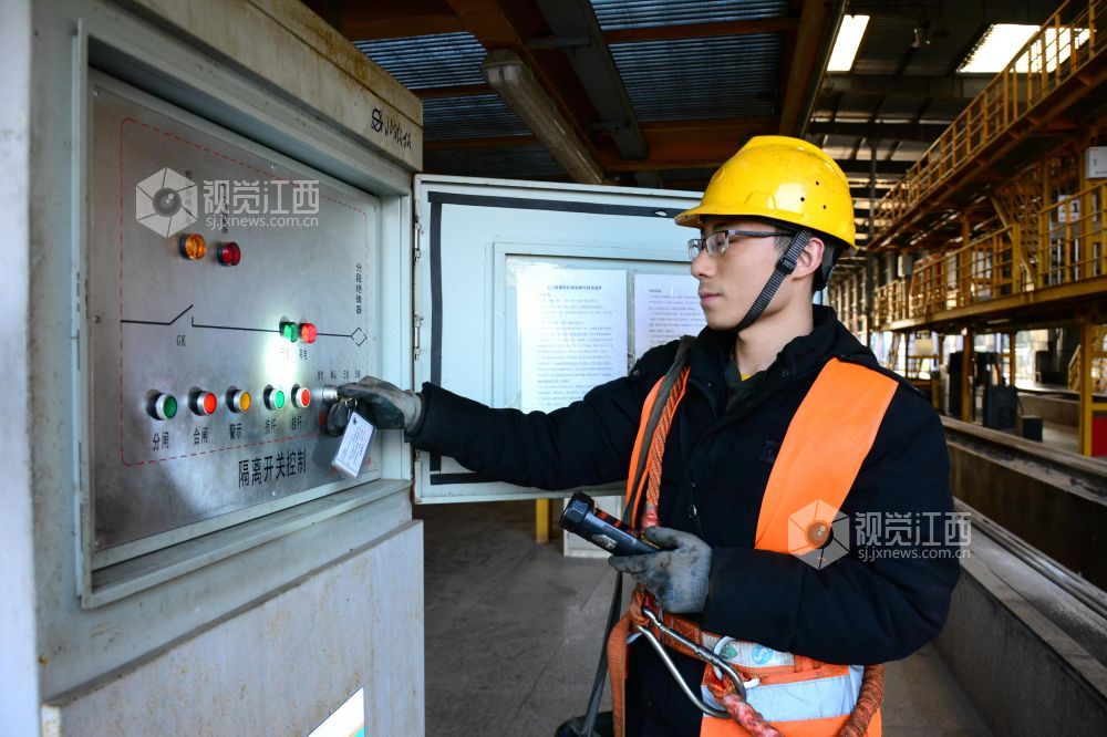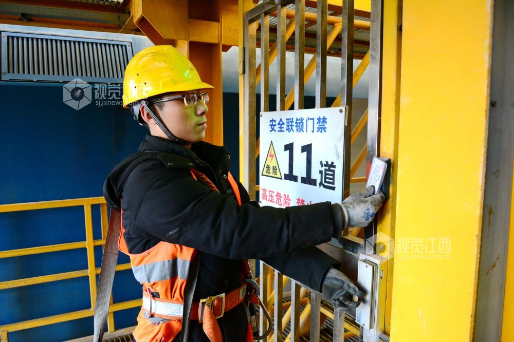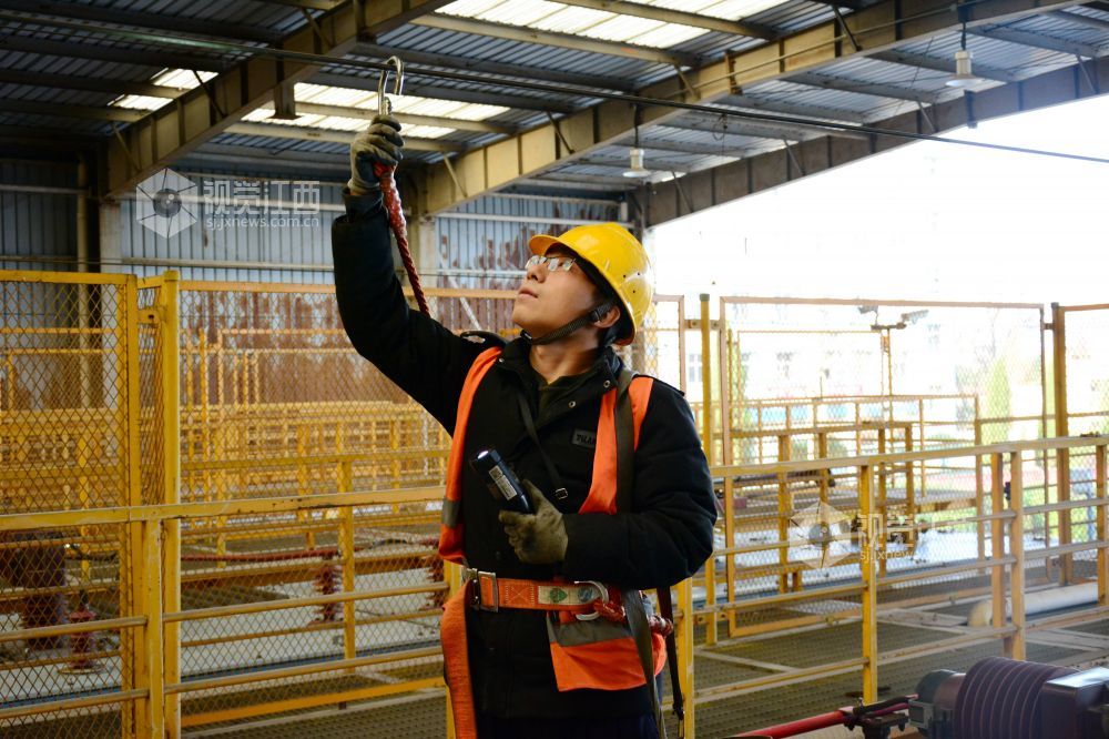 2月6日早上7时,南铁鹰潭机务段整备工黄忠双正在4米高的电力机车顶部检查受电弓,即将完成他此次夜班中的最后一趟检车作业。