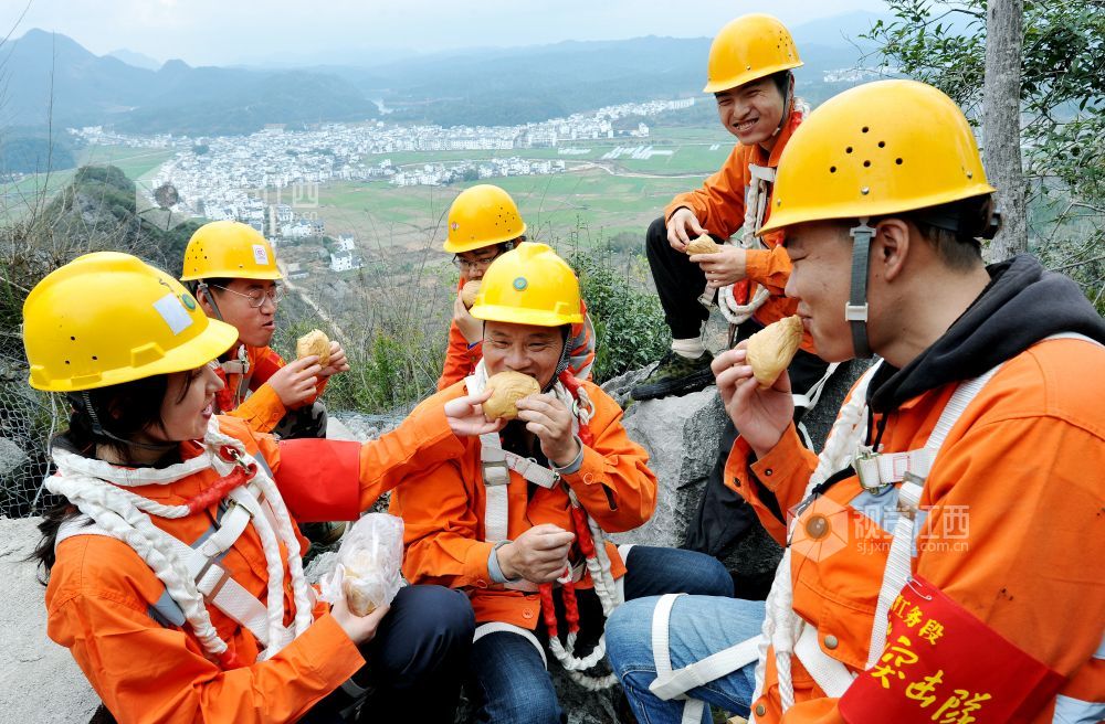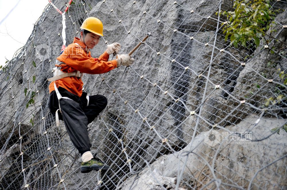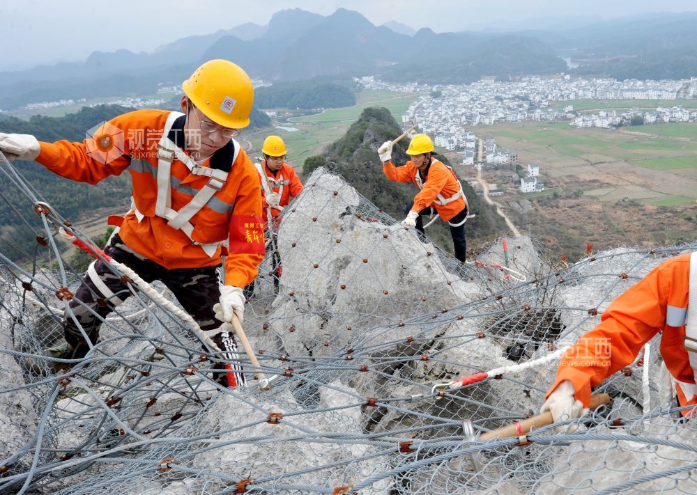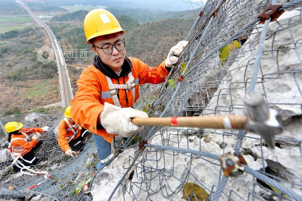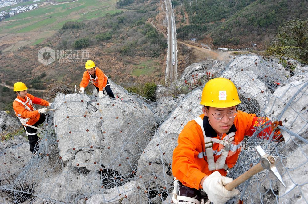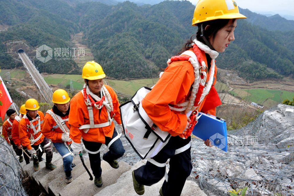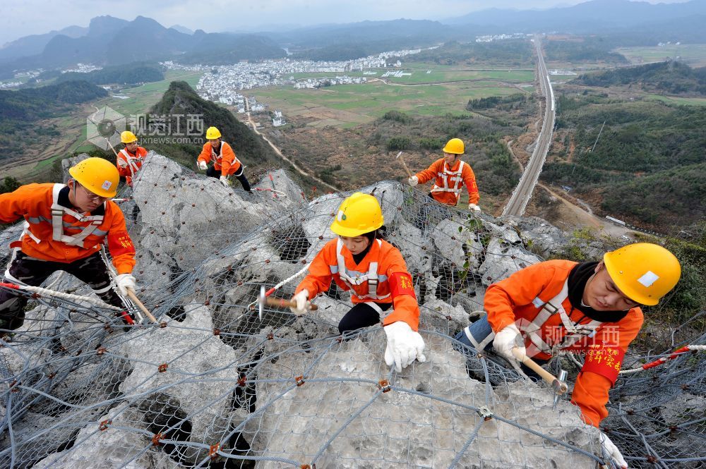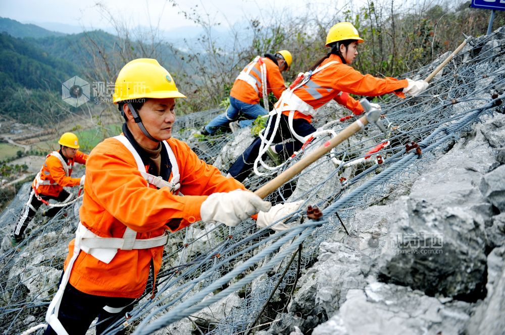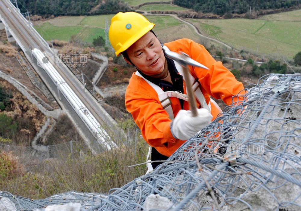 春节即将到来,为了让回家过年的旅客安全回家,中国铁路南昌局鹰潭工务段景德镇北路桥工区职工,驱车一个多小时来到穿越江西省婺源县赋春九景衢铁路梅山段,对被一张多达5万多平方米的巨型钢索大网罩住、易风化的山崖石壁进行全面检查,确保今年春运期间列车安全通过 。