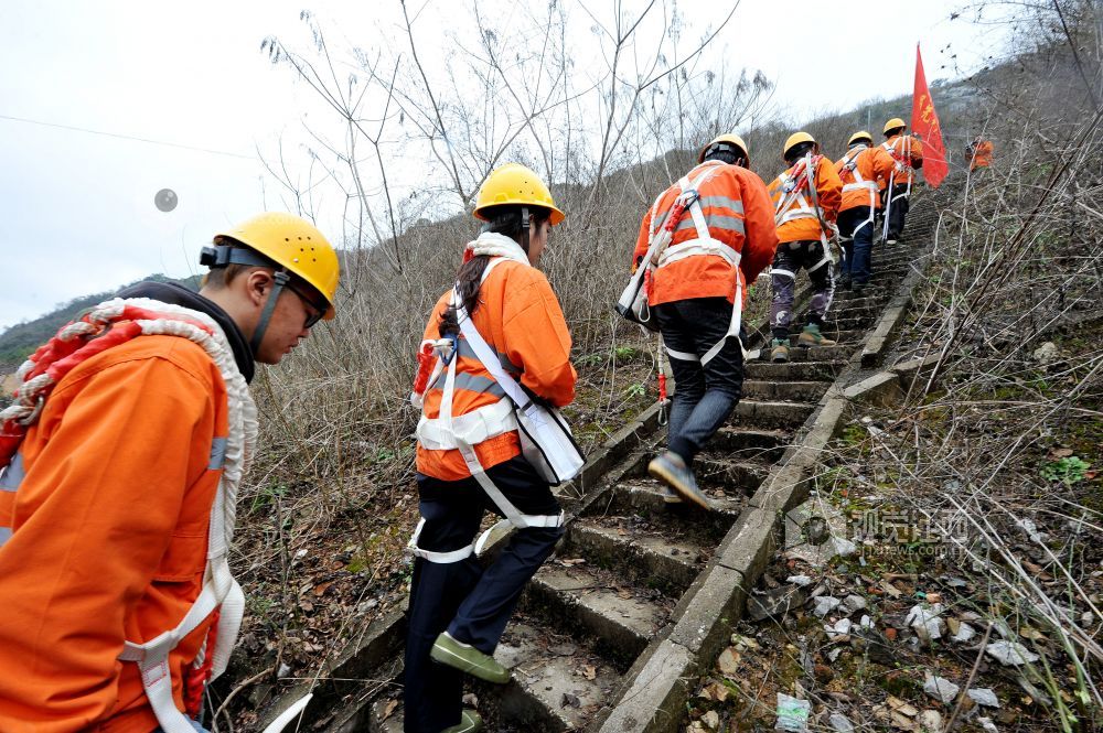 2021年2月6日, 中国铁路南昌局鹰潭工务段景德镇北路桥工区职工们正在江西省婺源县赋春梅山崖上,检查崖壁上的危石是否松动。