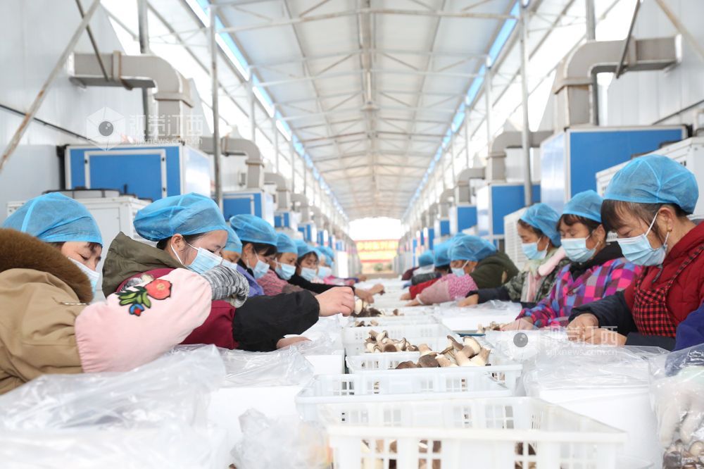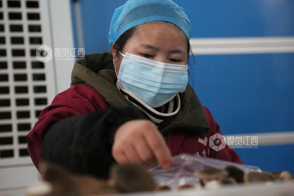 春节前夕,在江西省余干县瑞洪镇湾头村菌菇产业基地加工车间,菇农正在采摘、分拣、包装新鲜菌菇,准备春节前投放市场。