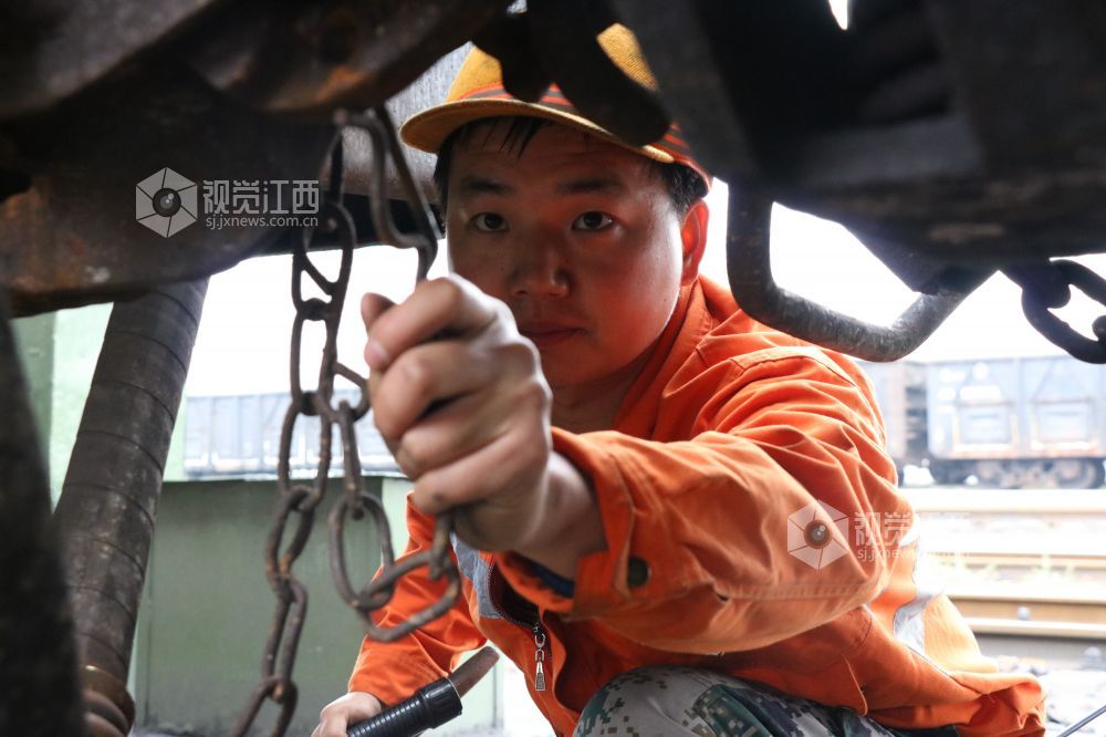 春运期间,南昌南车辆段严格落实车辆“九防”安全措施,确保中欧班列检修质量。图为大年初一,该段赣州东运用车间检车员在插设防跳插销,防止车辆发生列车分离。