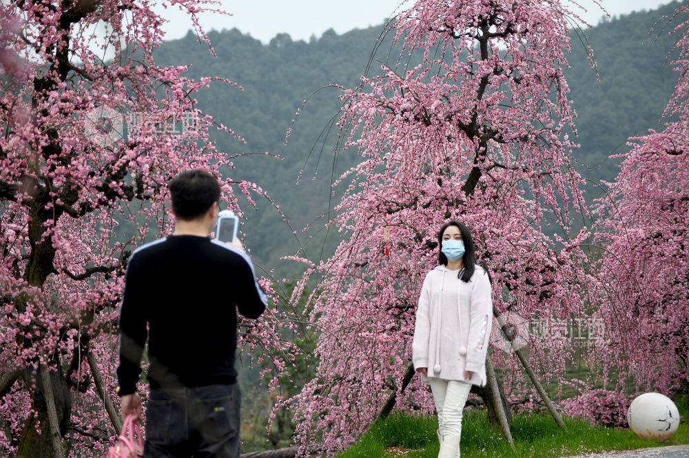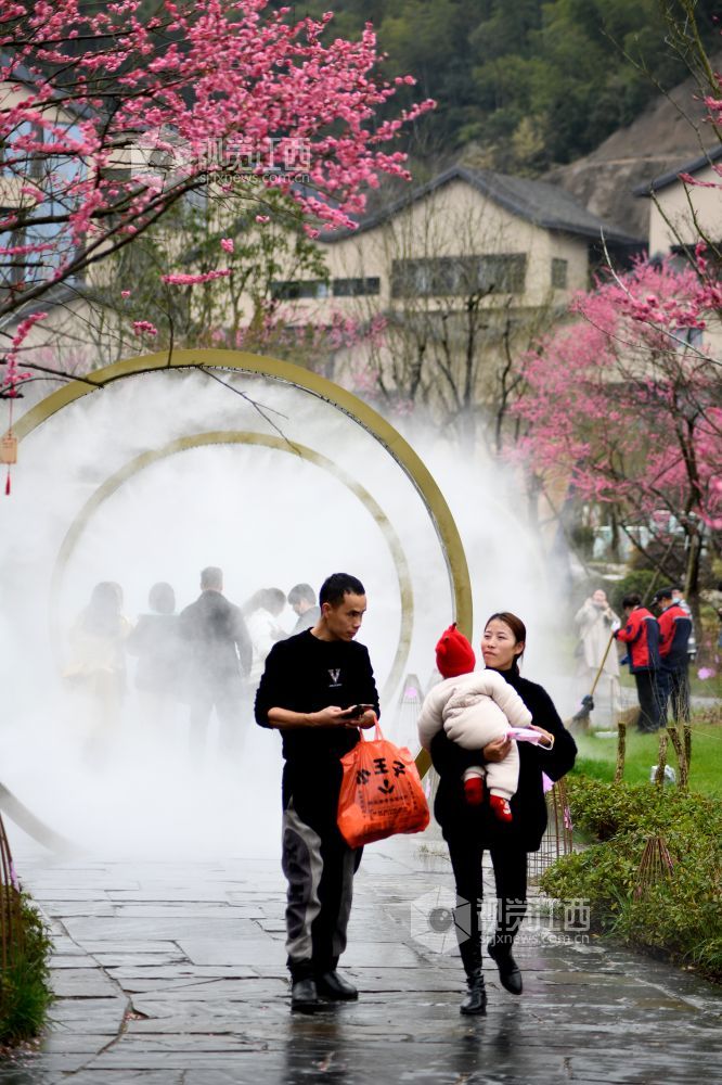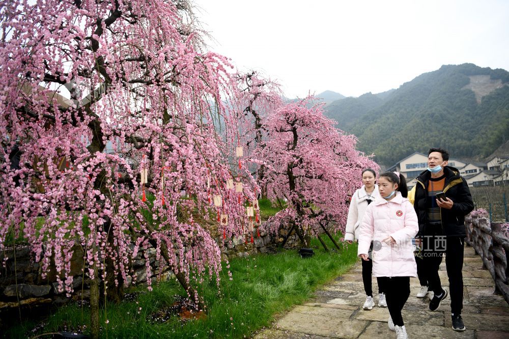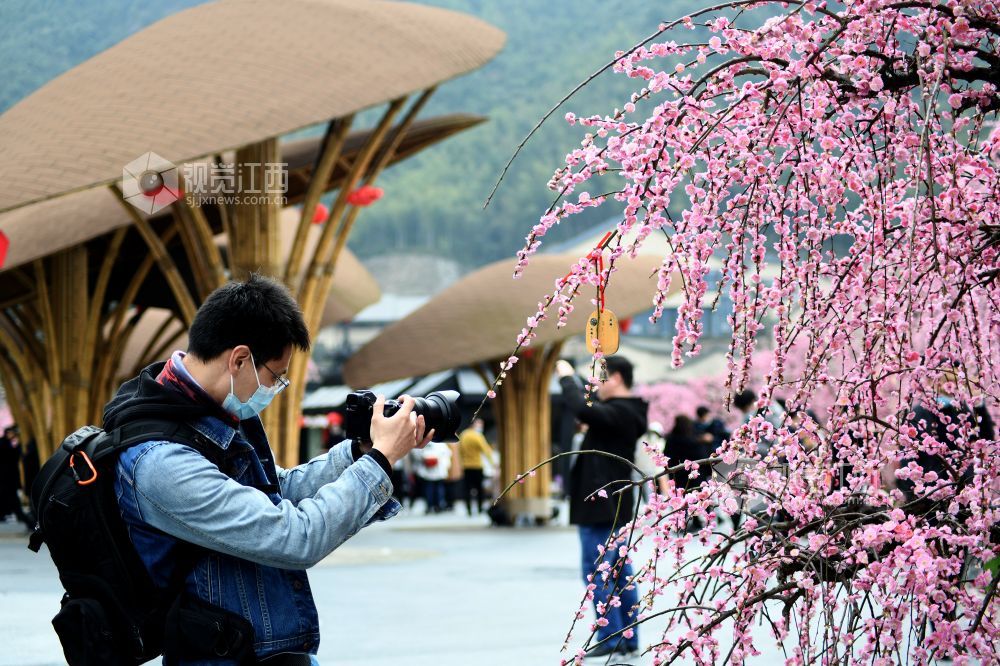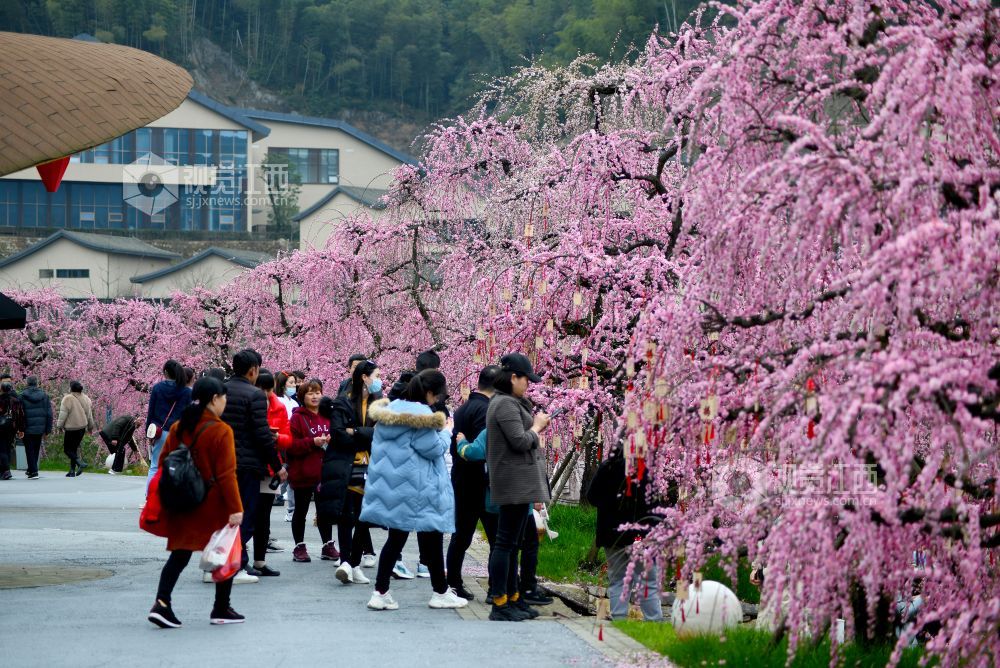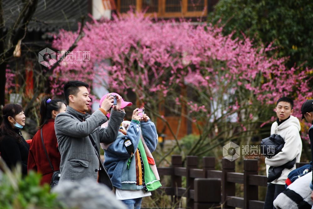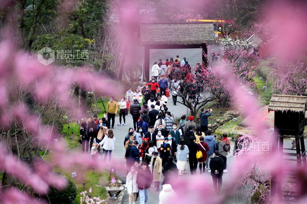 2021年2月13日,江西省上饶市铅山县葛仙村里的梅花竞相开放,游客纷纷拿出手机拍照留念。