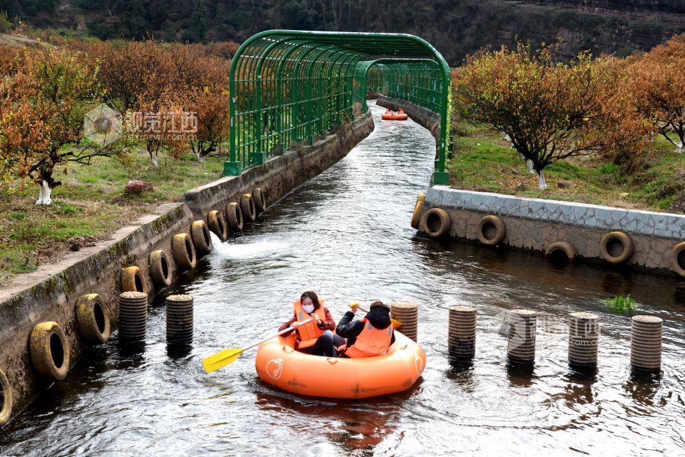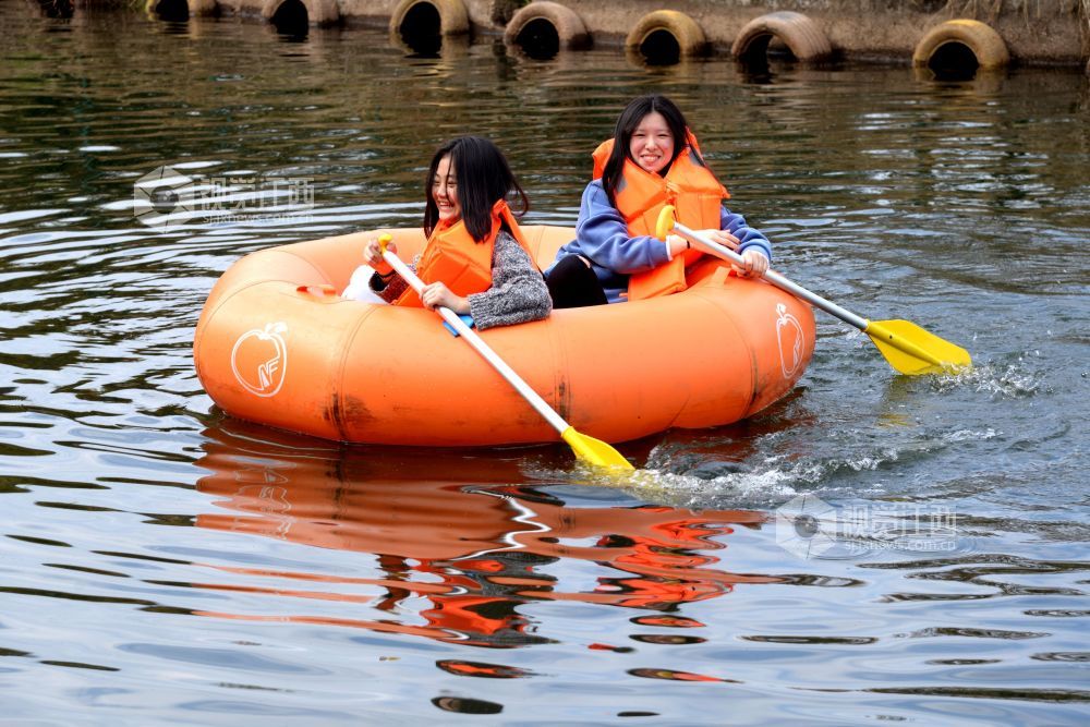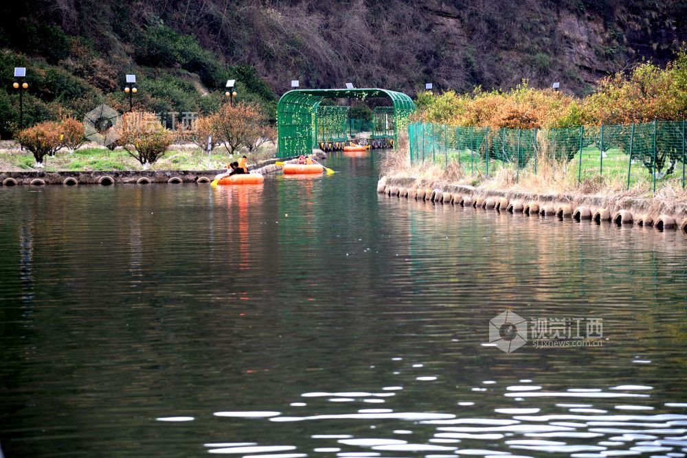 2021年2月15日,江西省抚州市南丰县观必上乐园水渠里,游客们正在体验水上桔漂项目。