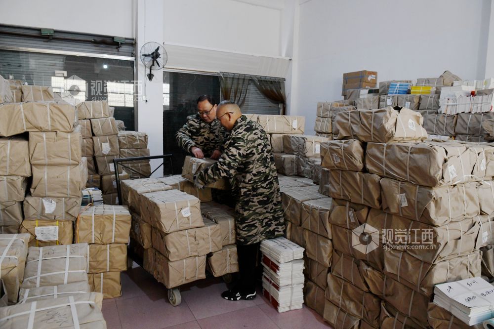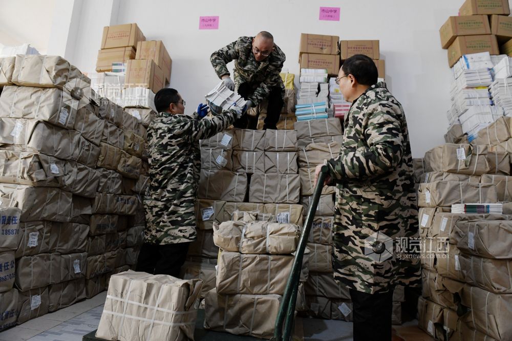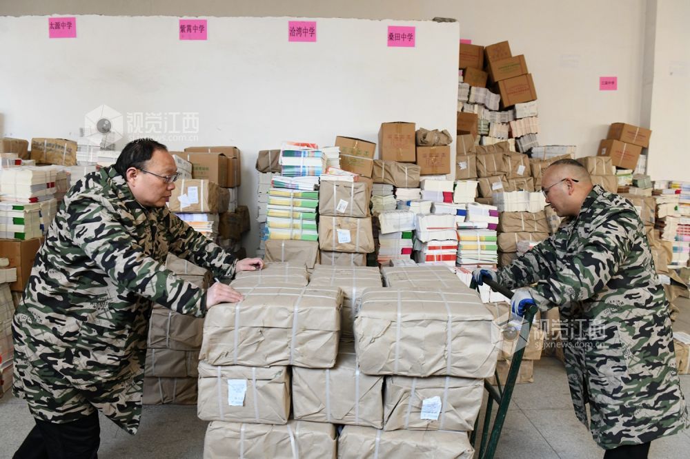 2021年2月18日,江西省南丰县新华书店工作人员在清点搬运教材。新学期开学在即,江西抚州市南丰县抓紧做好中小学生教材的分类和发放工作,确保学生及时领到新书。